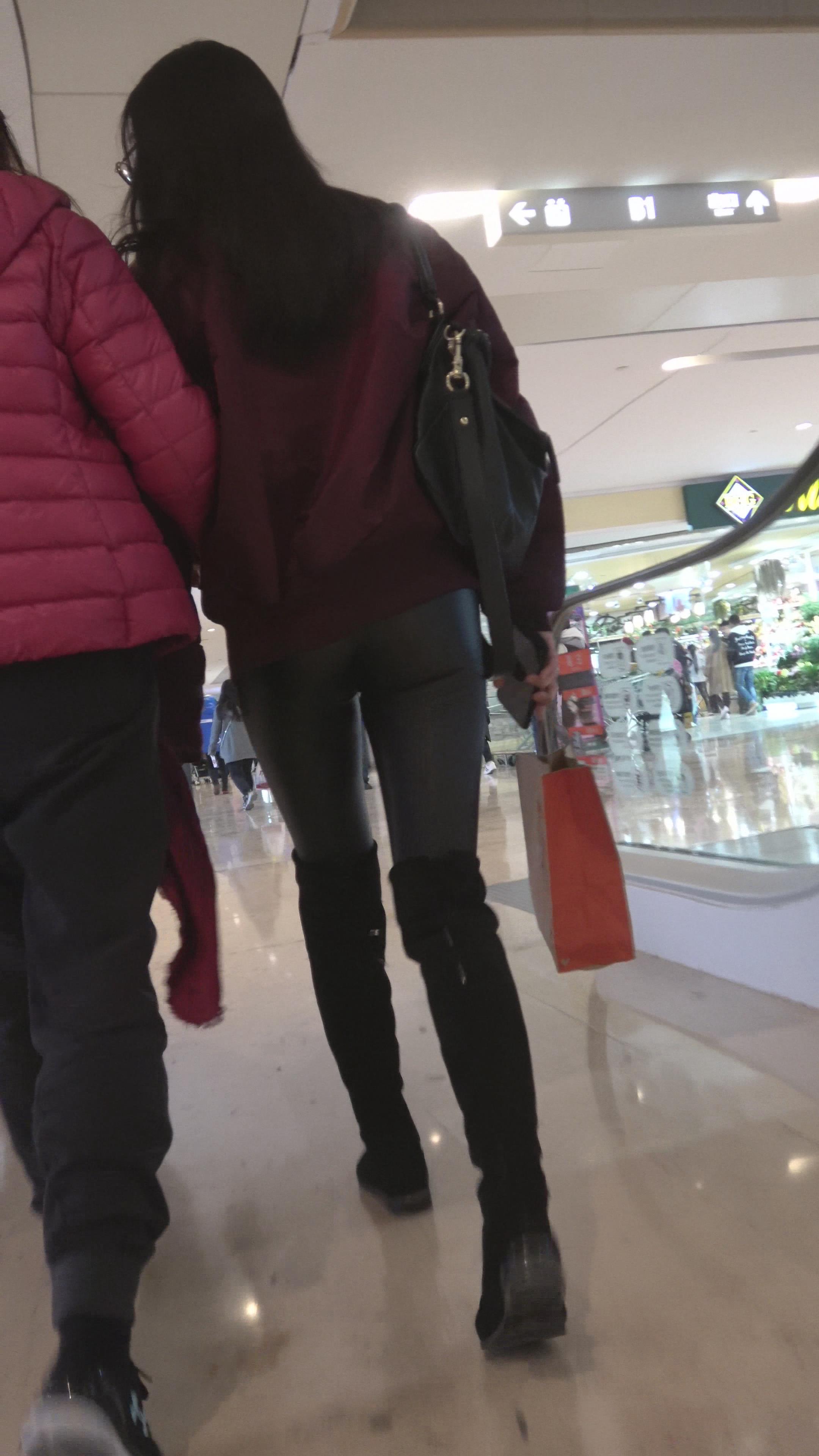 4K 酒红色外套街拍紧身皮裤眼镜美女 编号3138