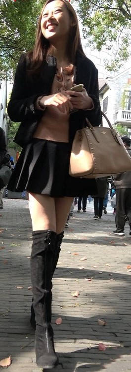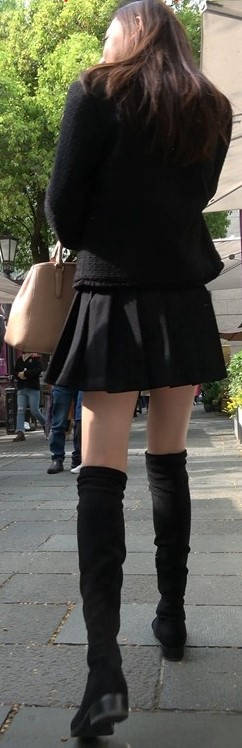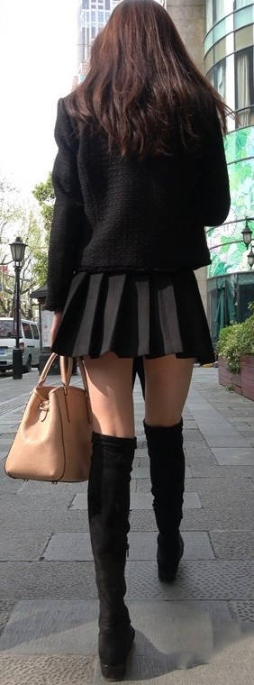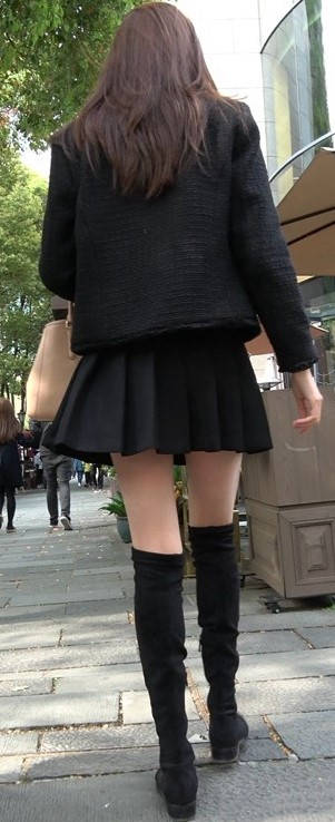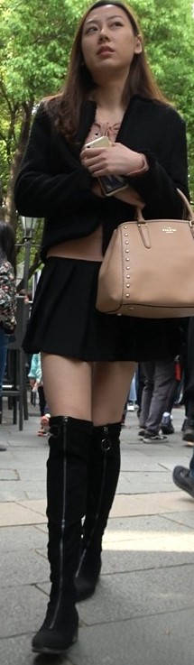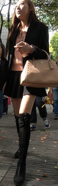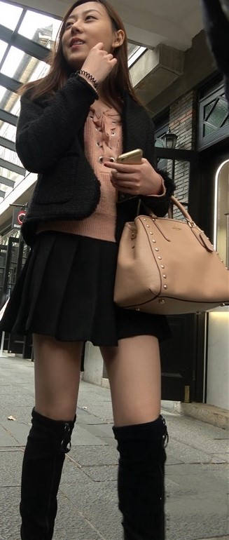 4k-黑色短裙长筒靴粉衣甜美街拍美女 编号9453