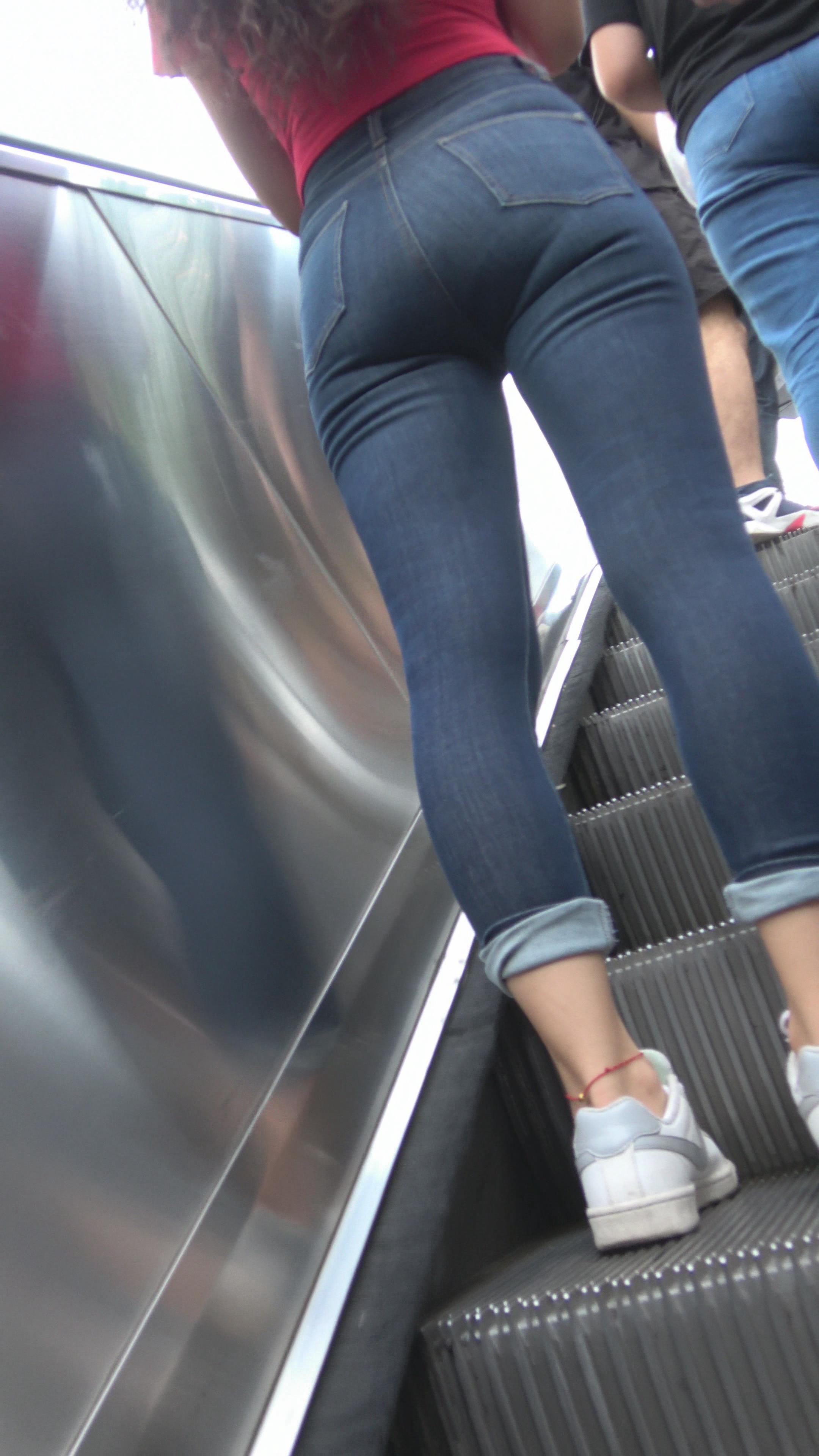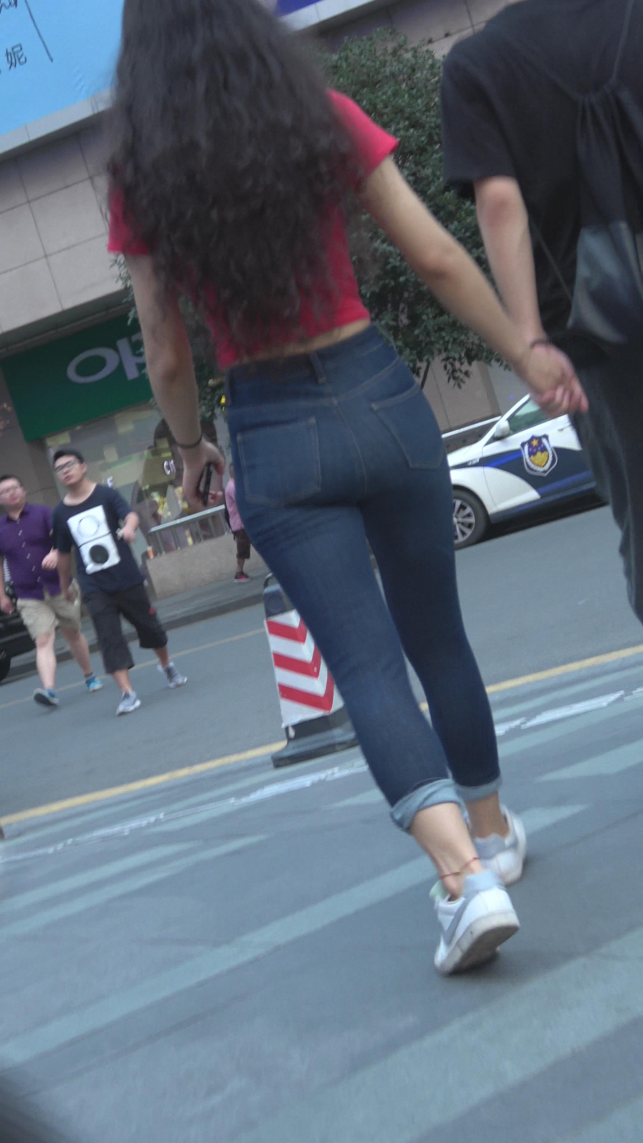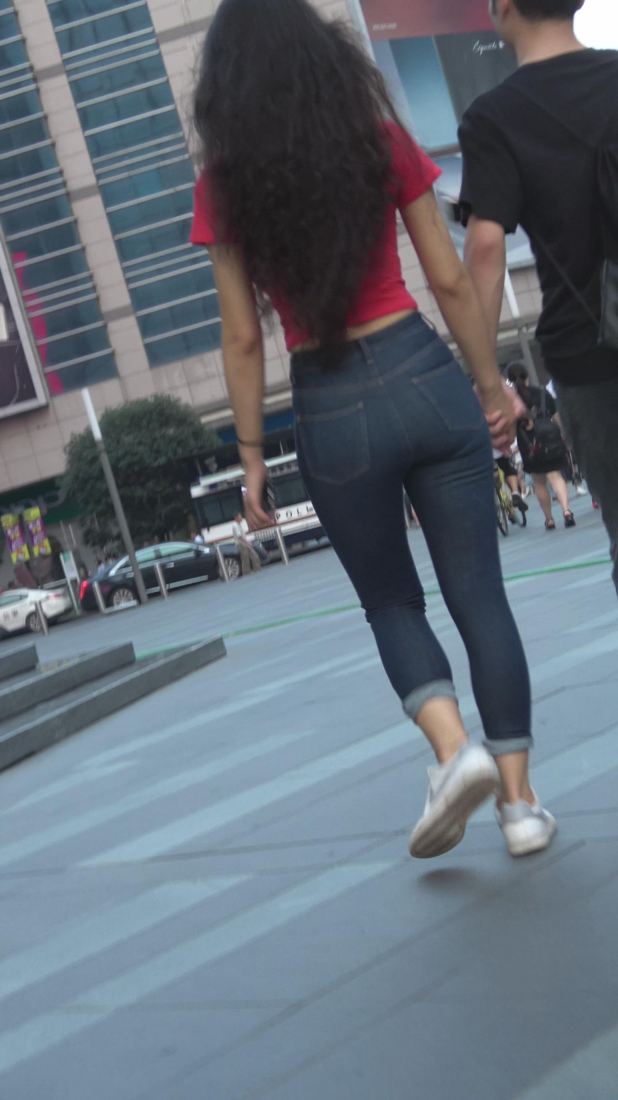 4K - 跟拍超紧绷蓝色牛仔裤美女 编号3190