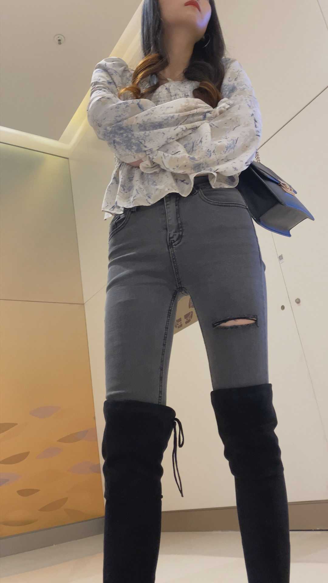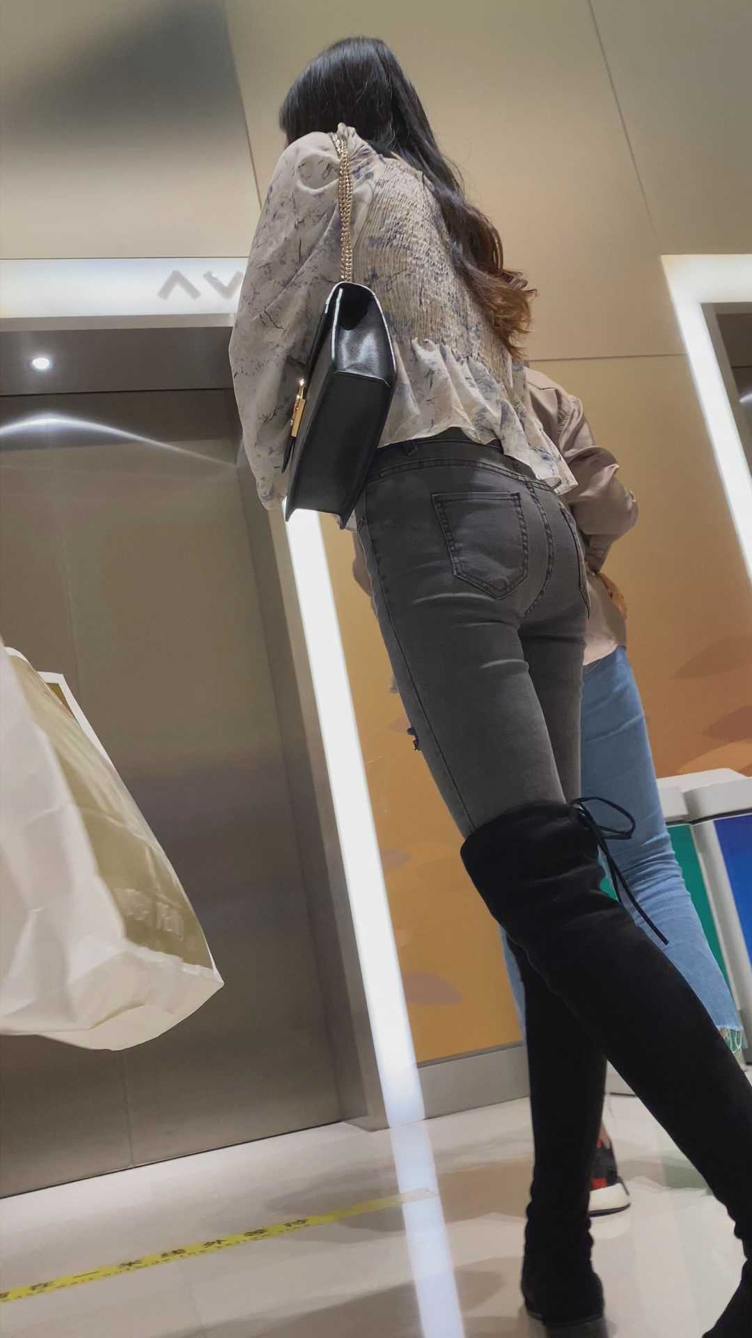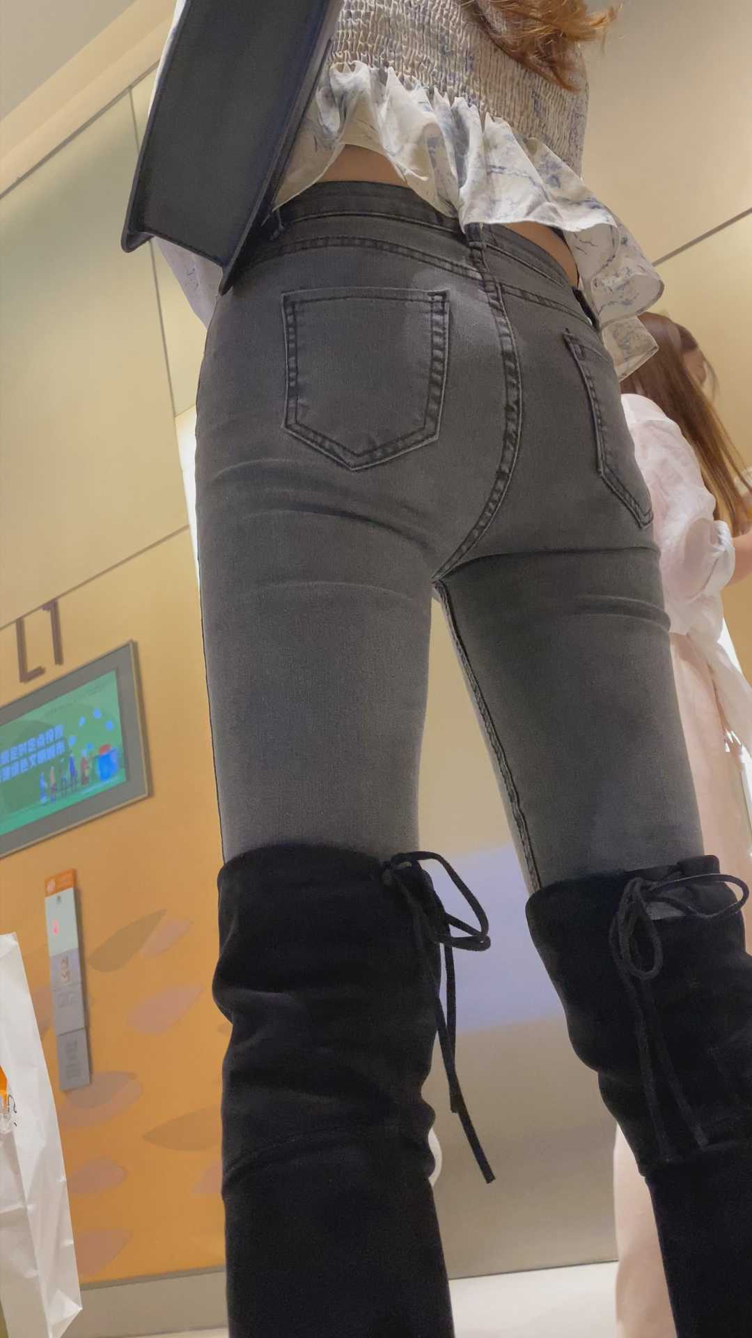 B1429高挑灰牛仔紧臀金三角美女