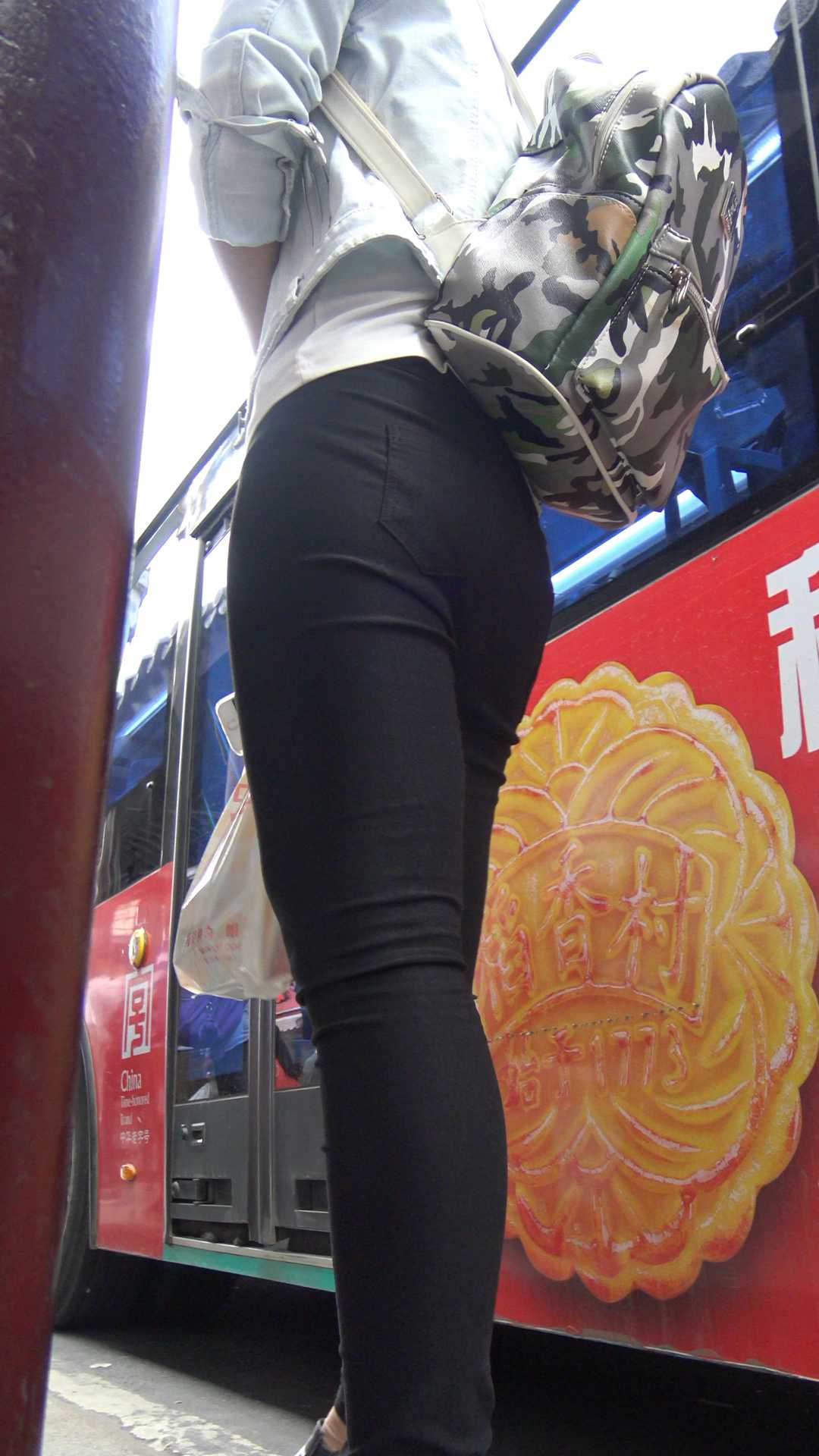 C957紧身黑裤大学妹等公车