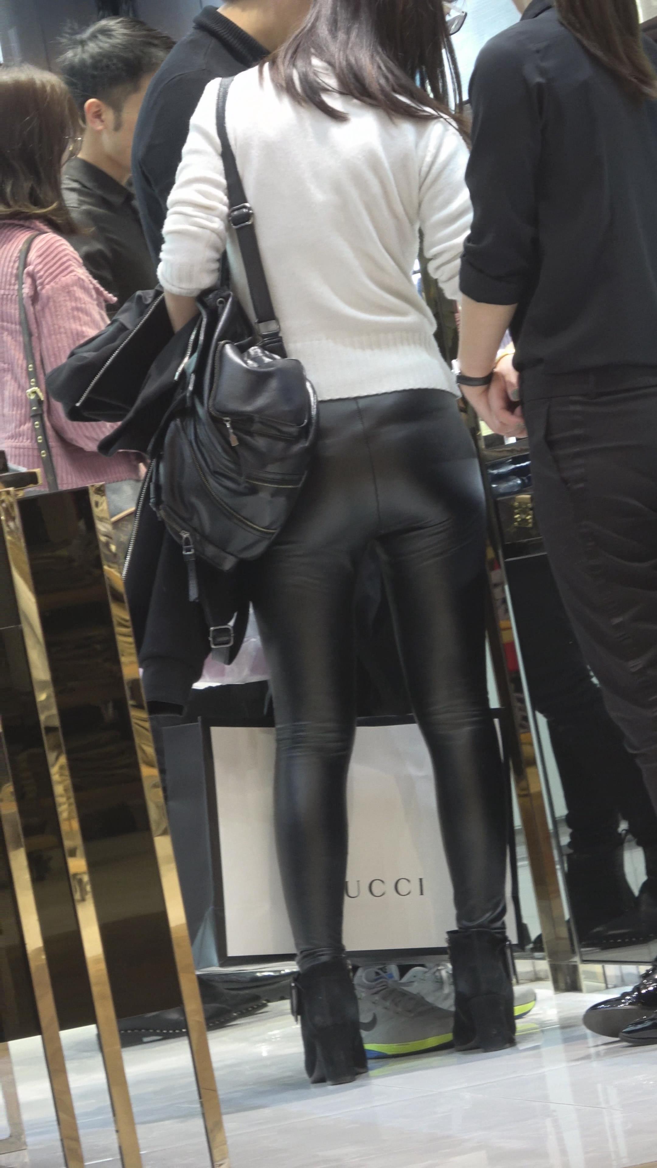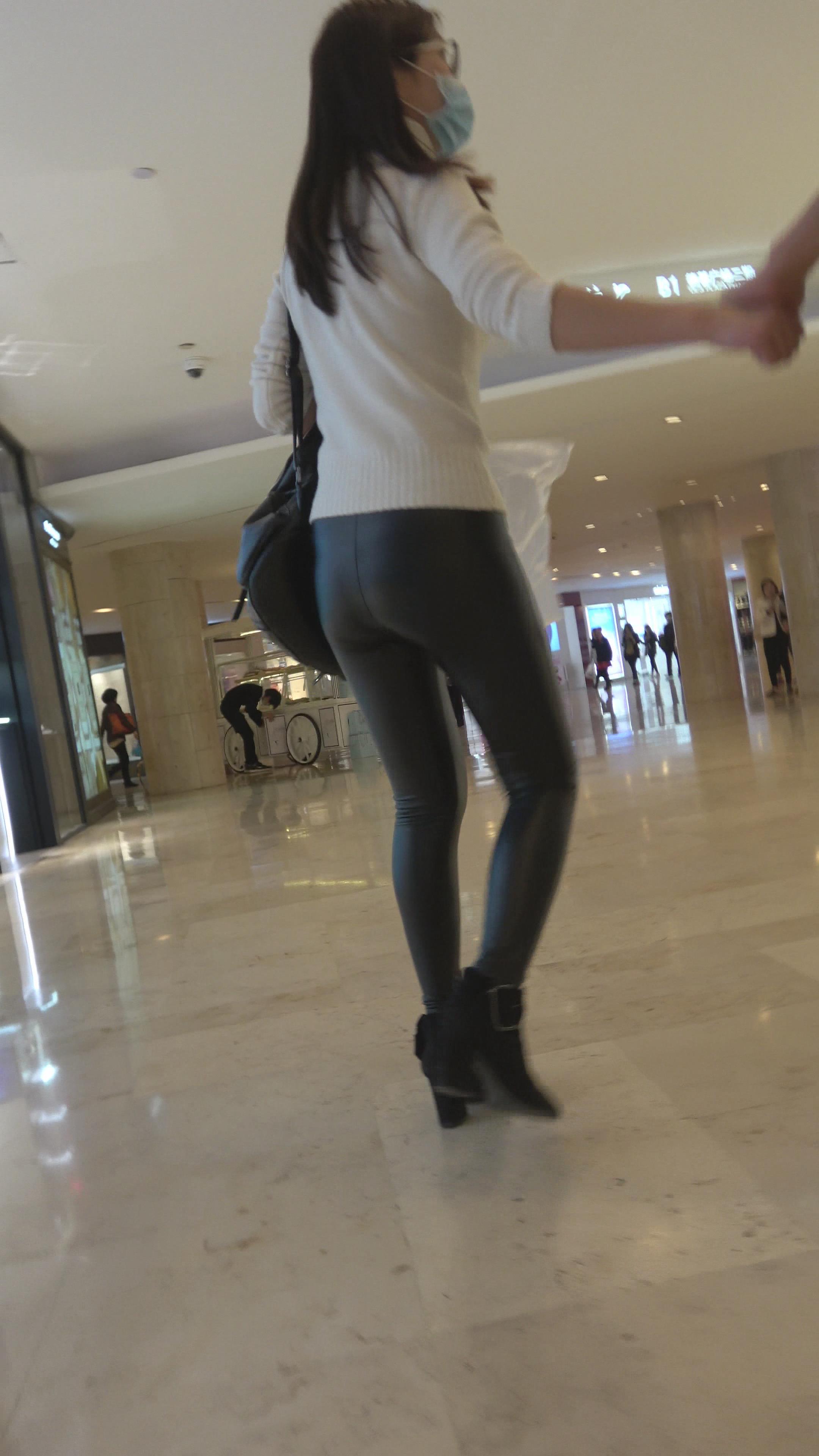 4K 街拍黑色紧身皮裤美女逛商场 编号3320