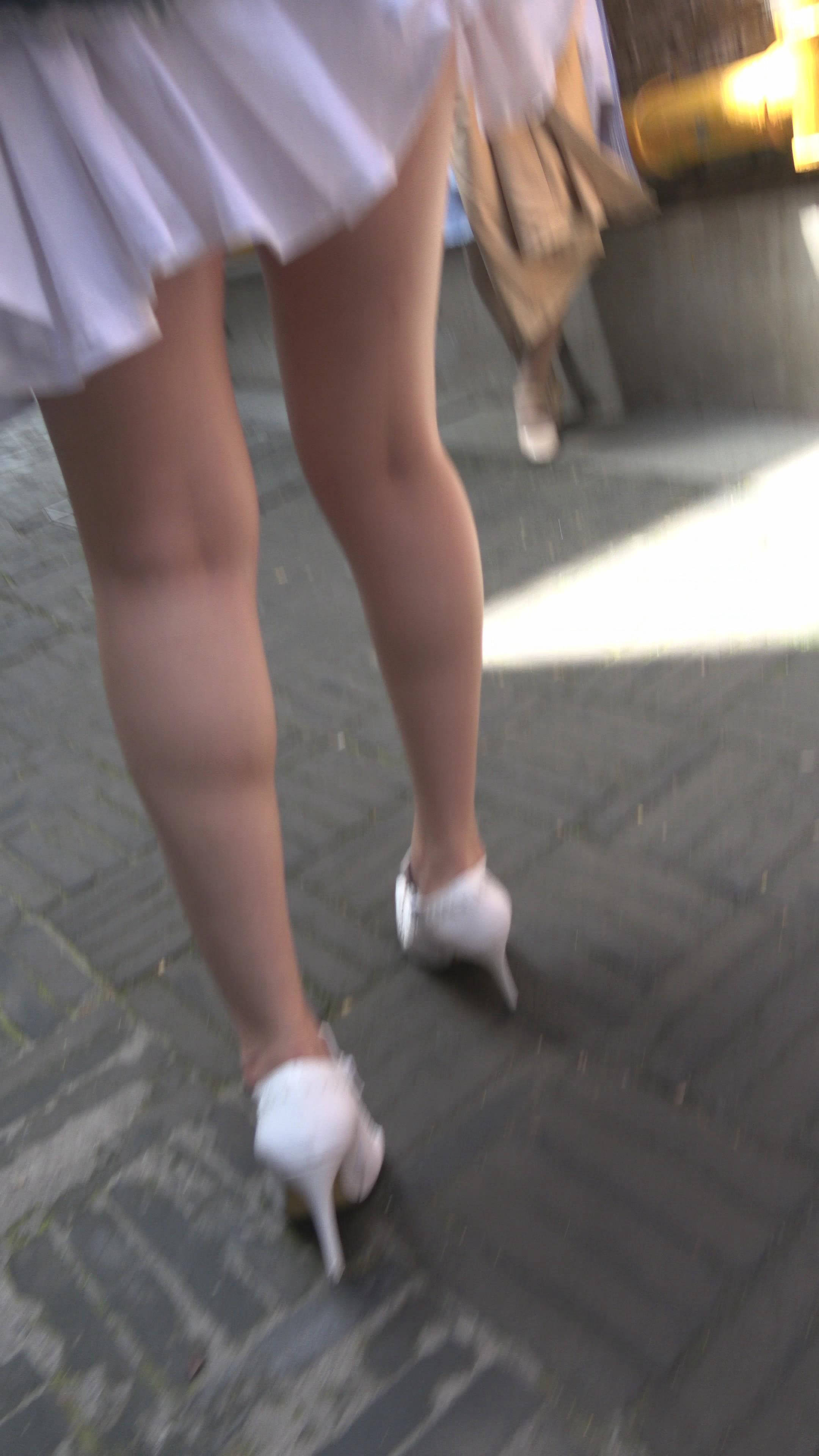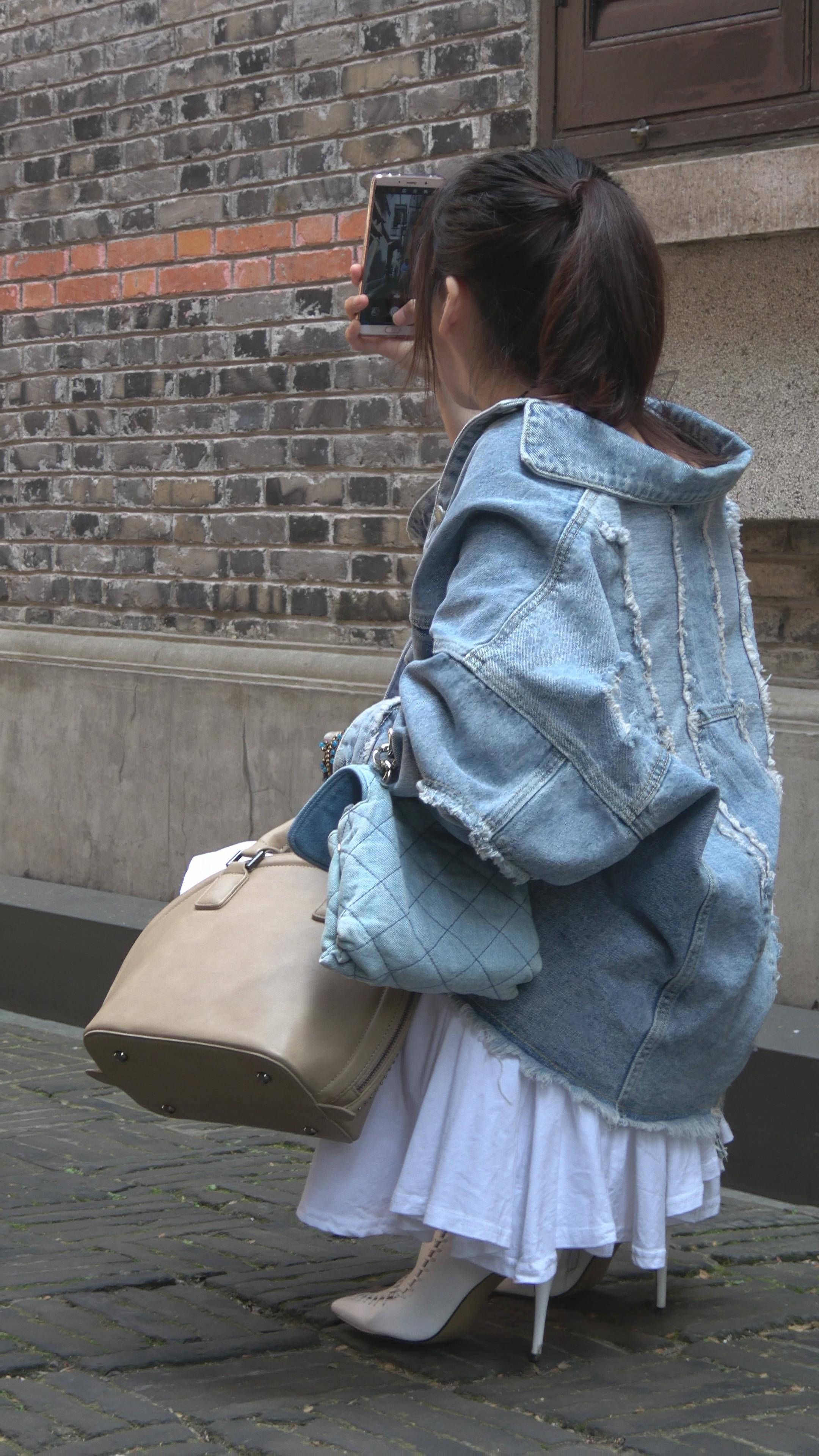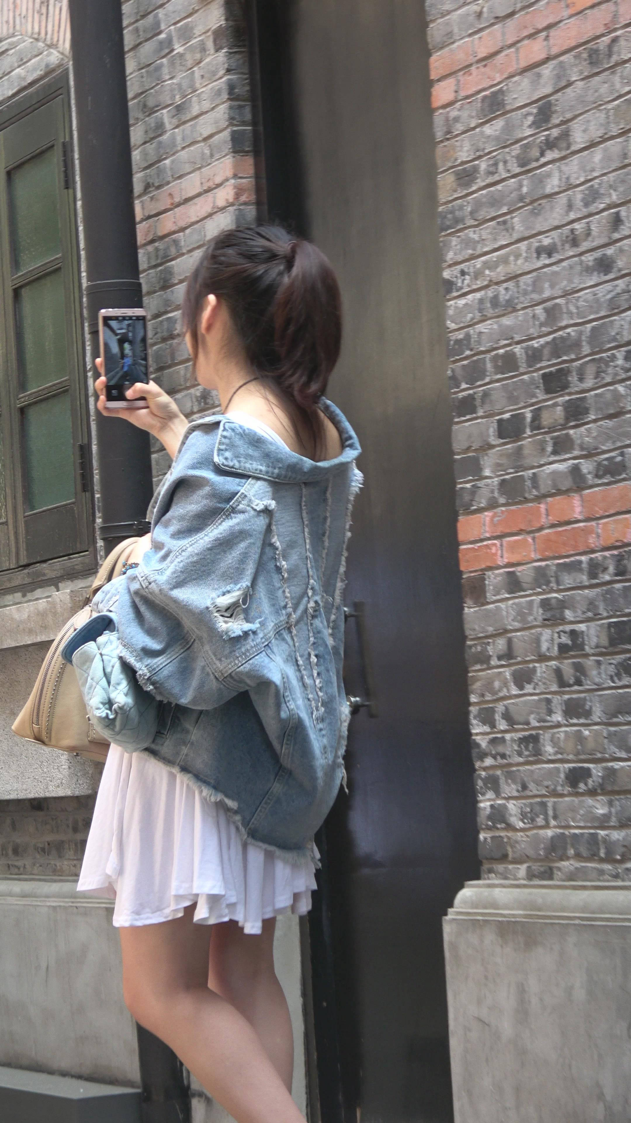 4K 白色高跟短裙牛仔外套街拍美女姐姐 编号7324