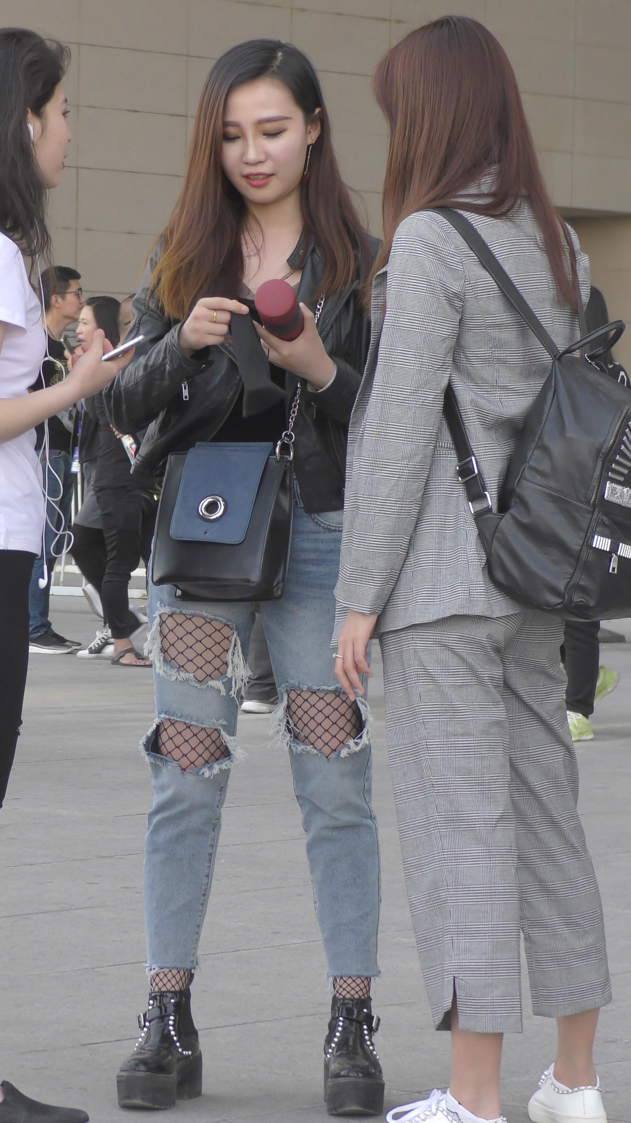 4K 街拍破洞牛仔裤小姐姐里面居然配的是网袜 编号3341