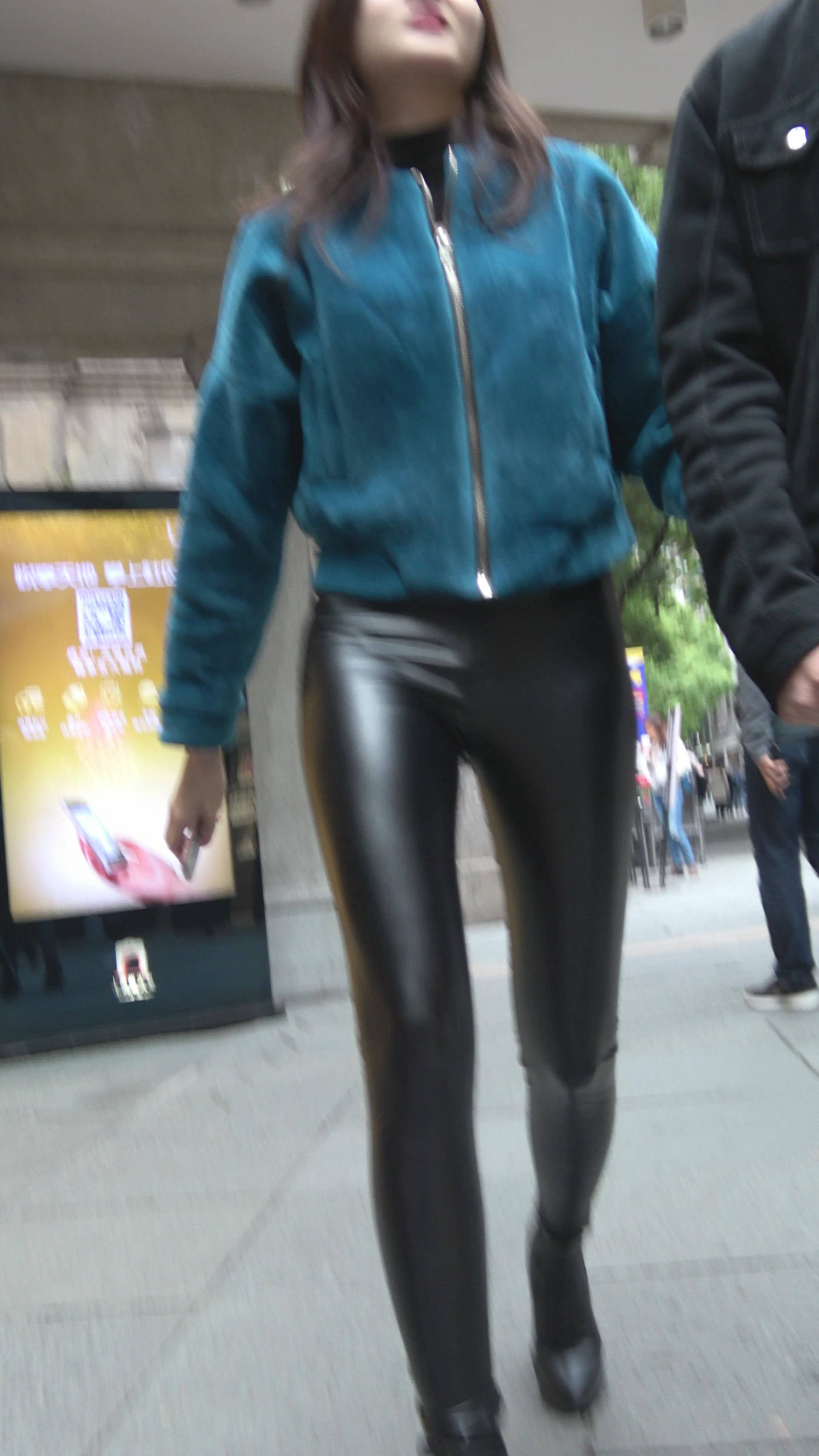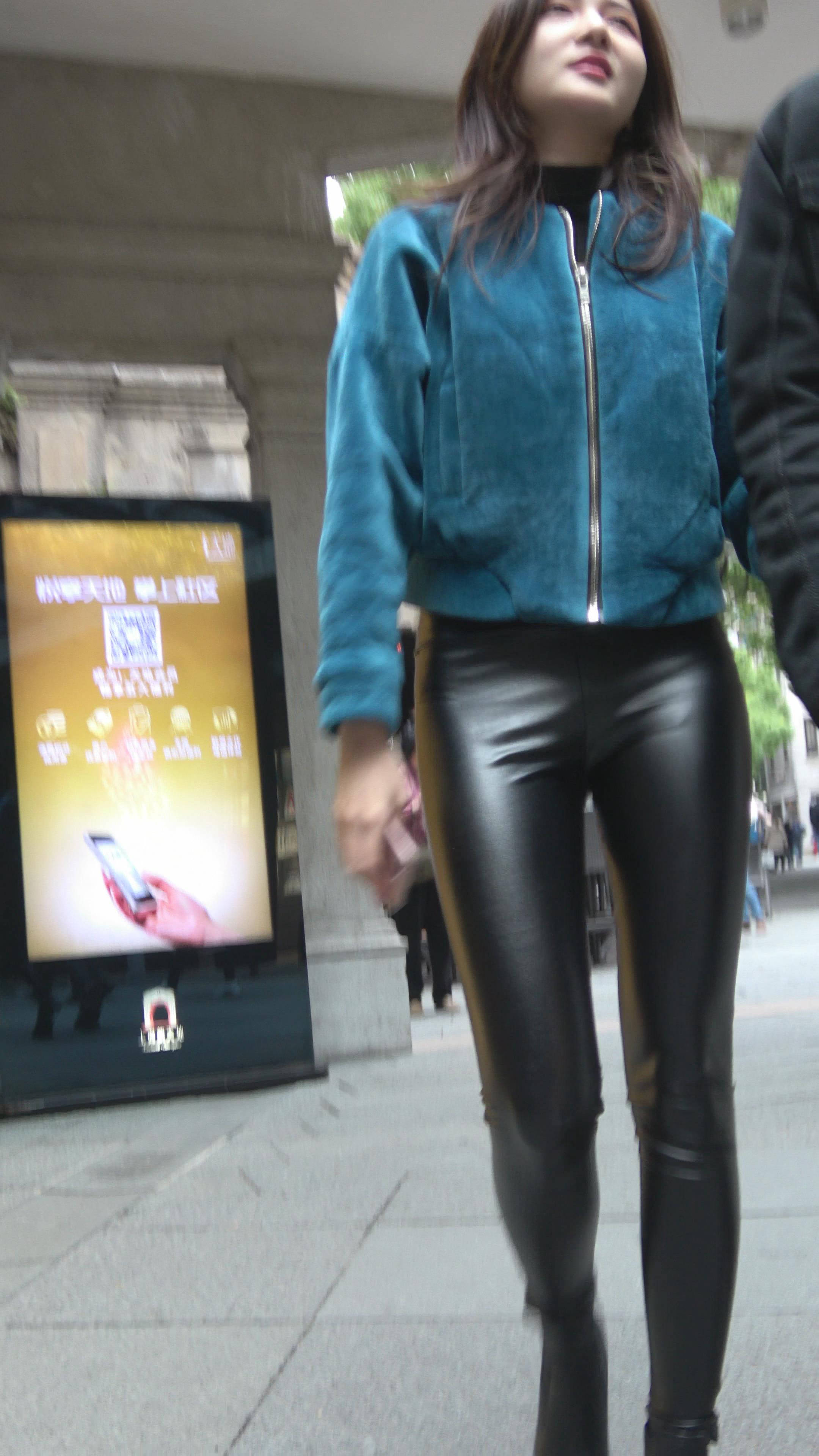 4K - 黑色紧身街拍皮裤性感美女 编号7485