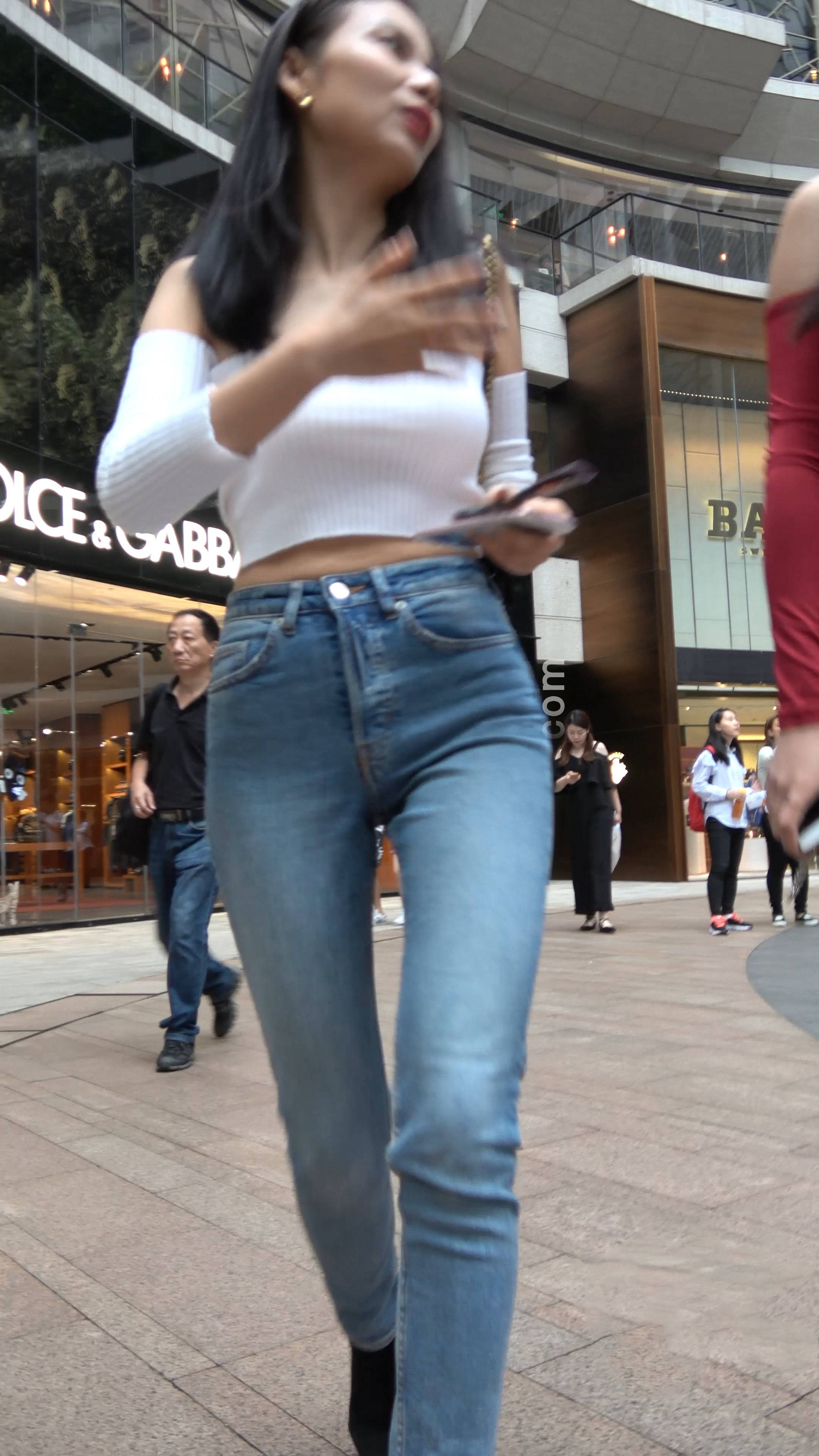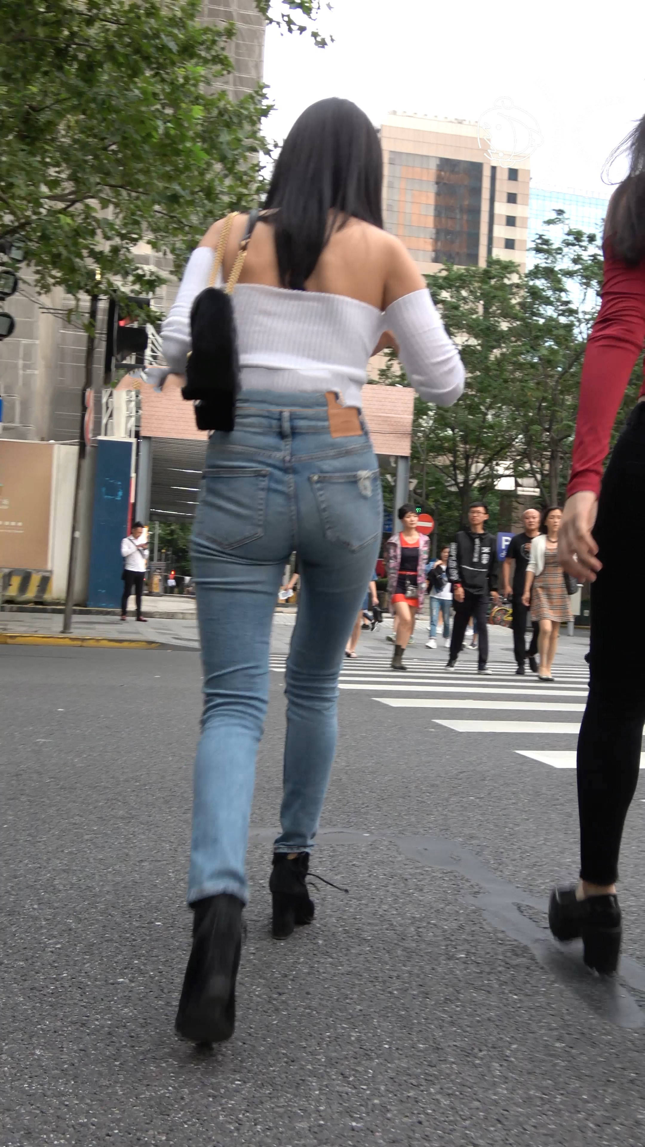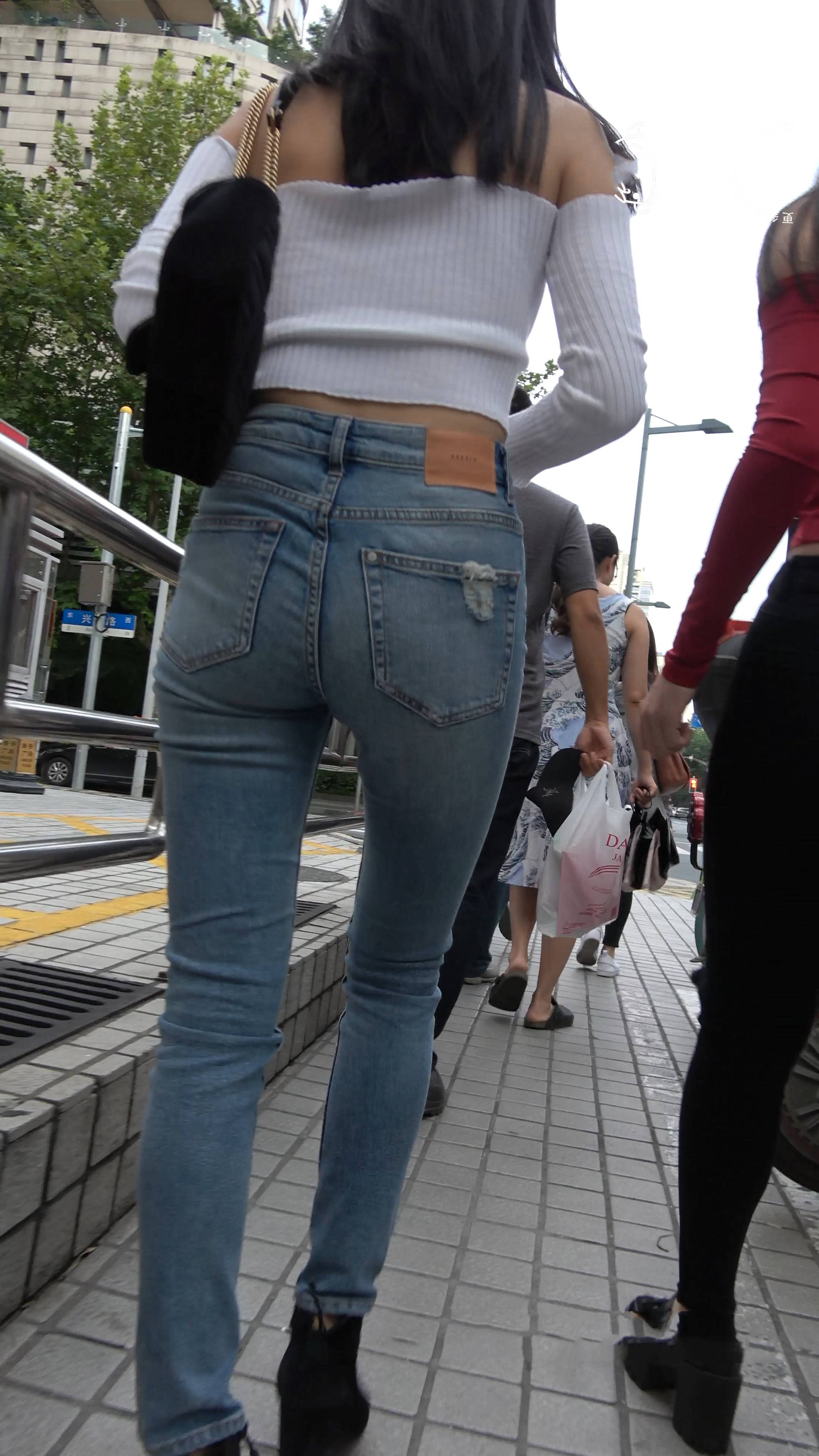 4k超清街拍一字抹胸蓝色紧牛美女 编号7685