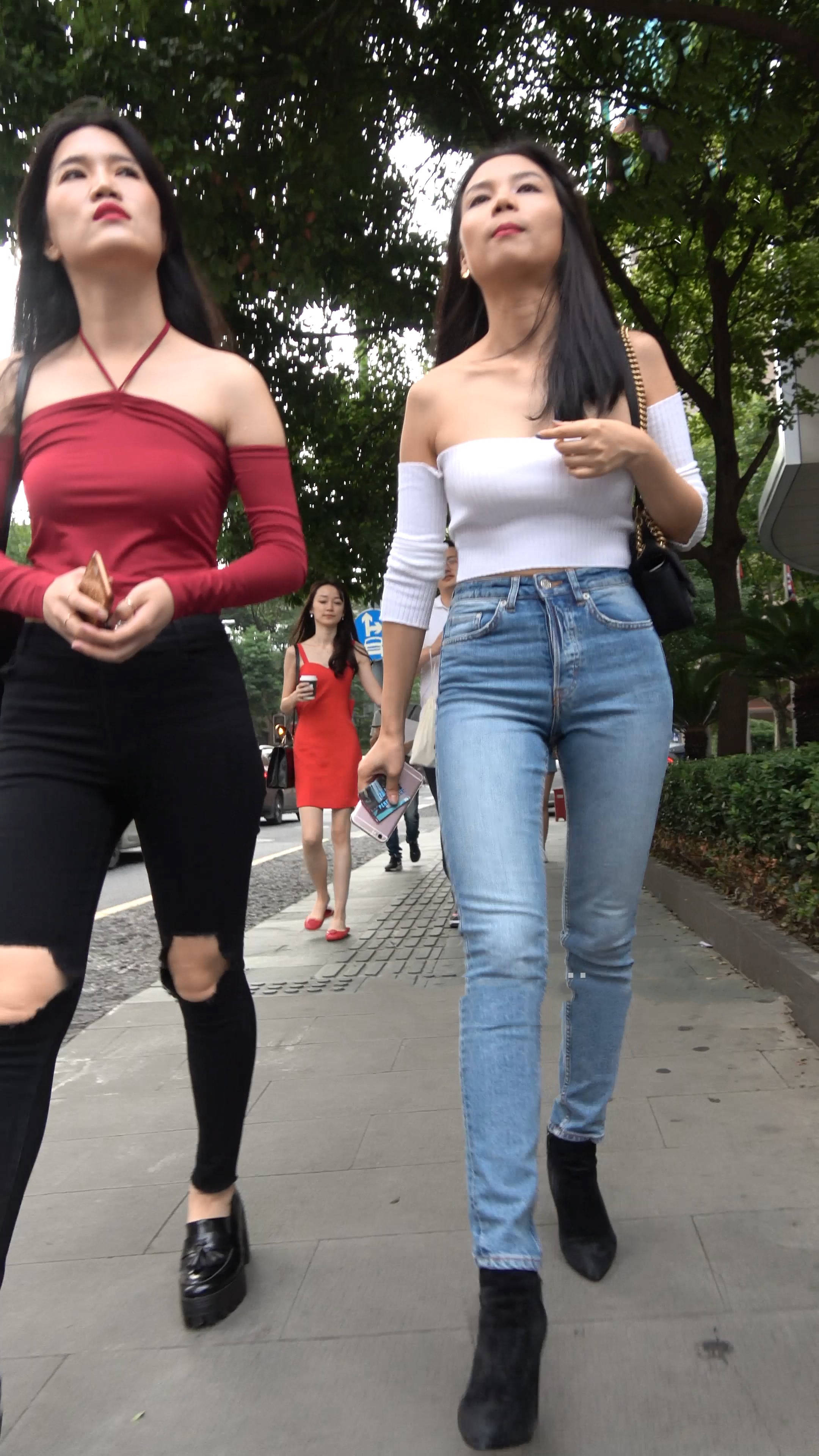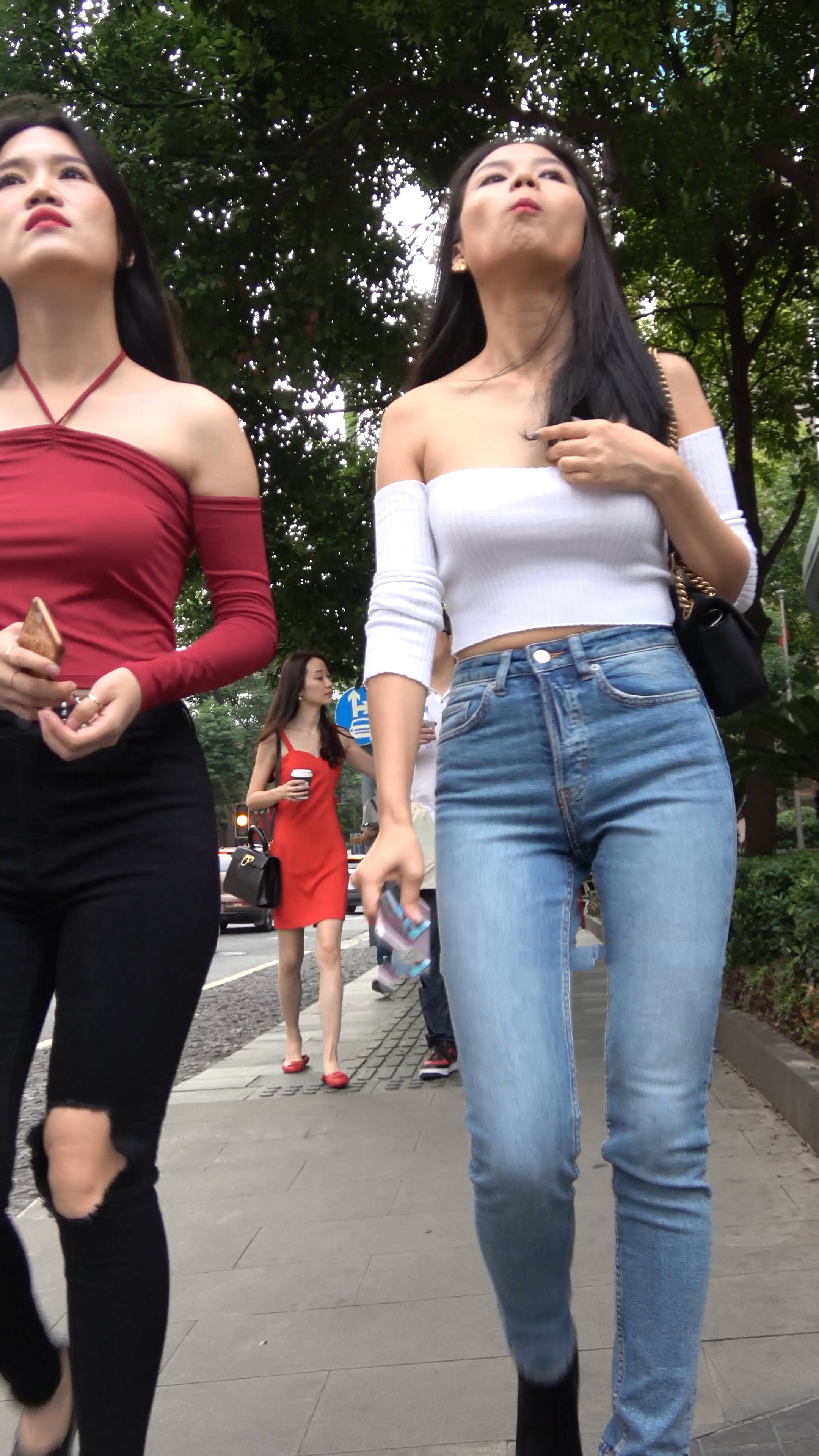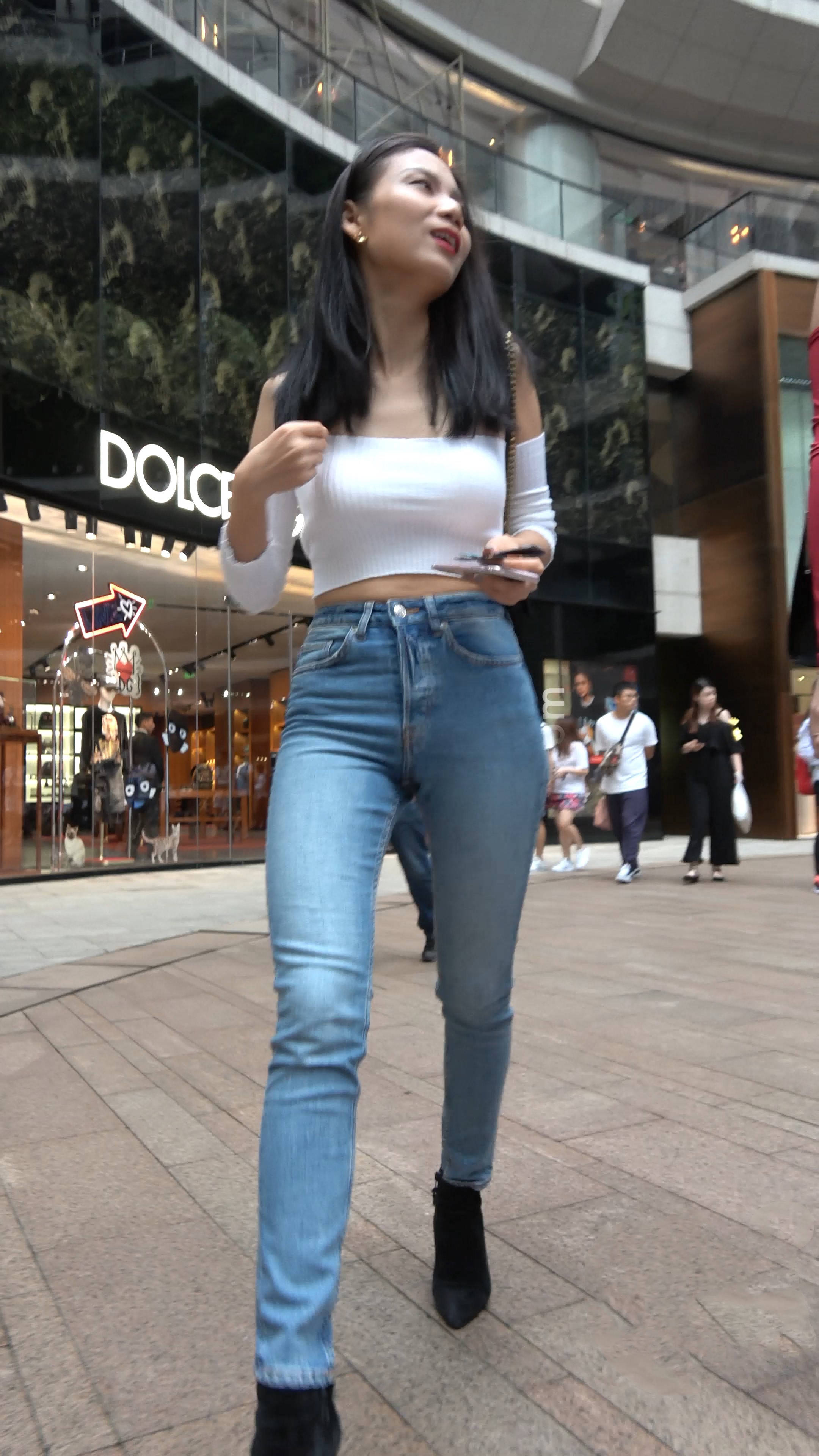 4k超清街拍一字抹胸蓝色紧牛美女 编号7685