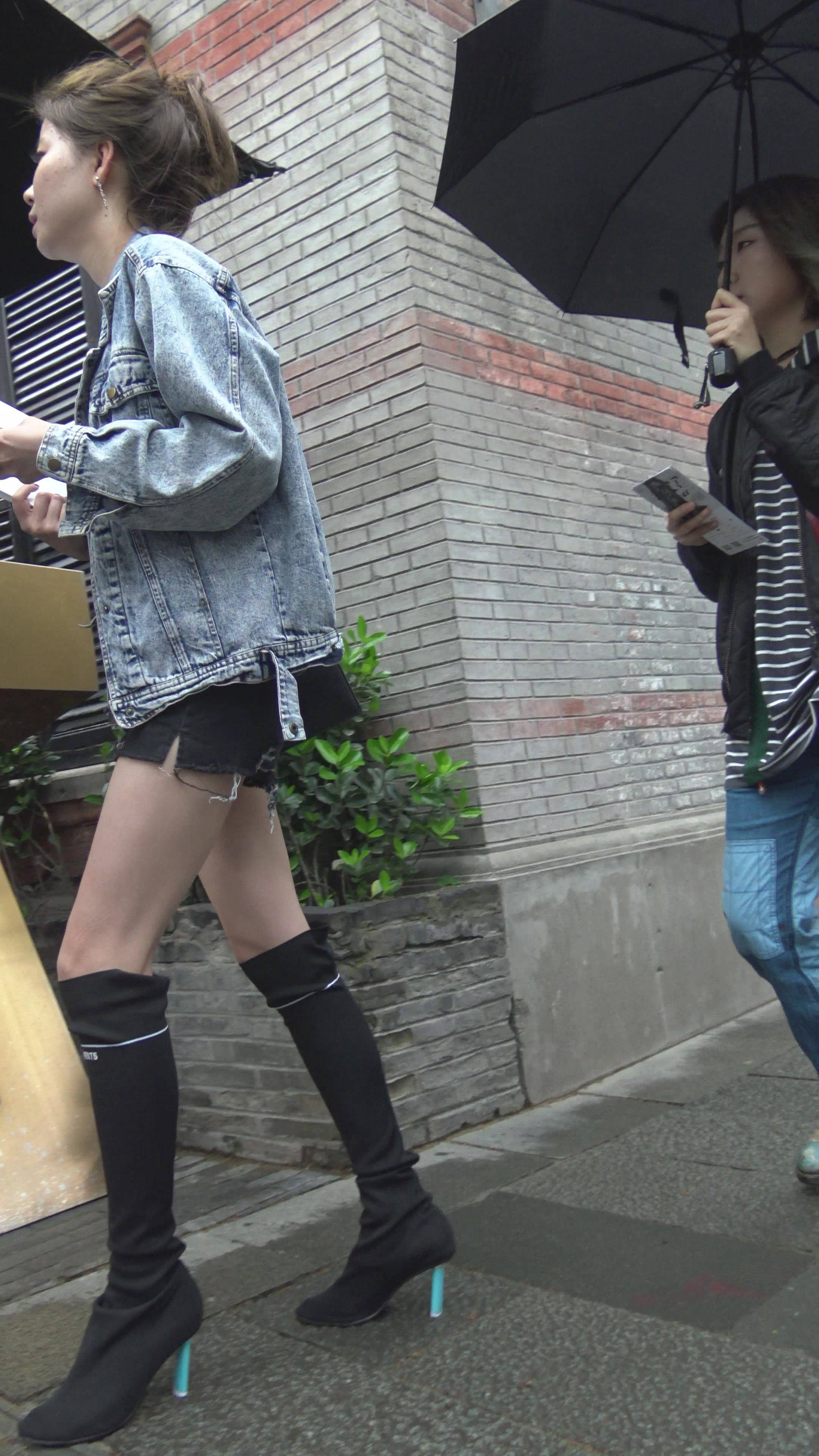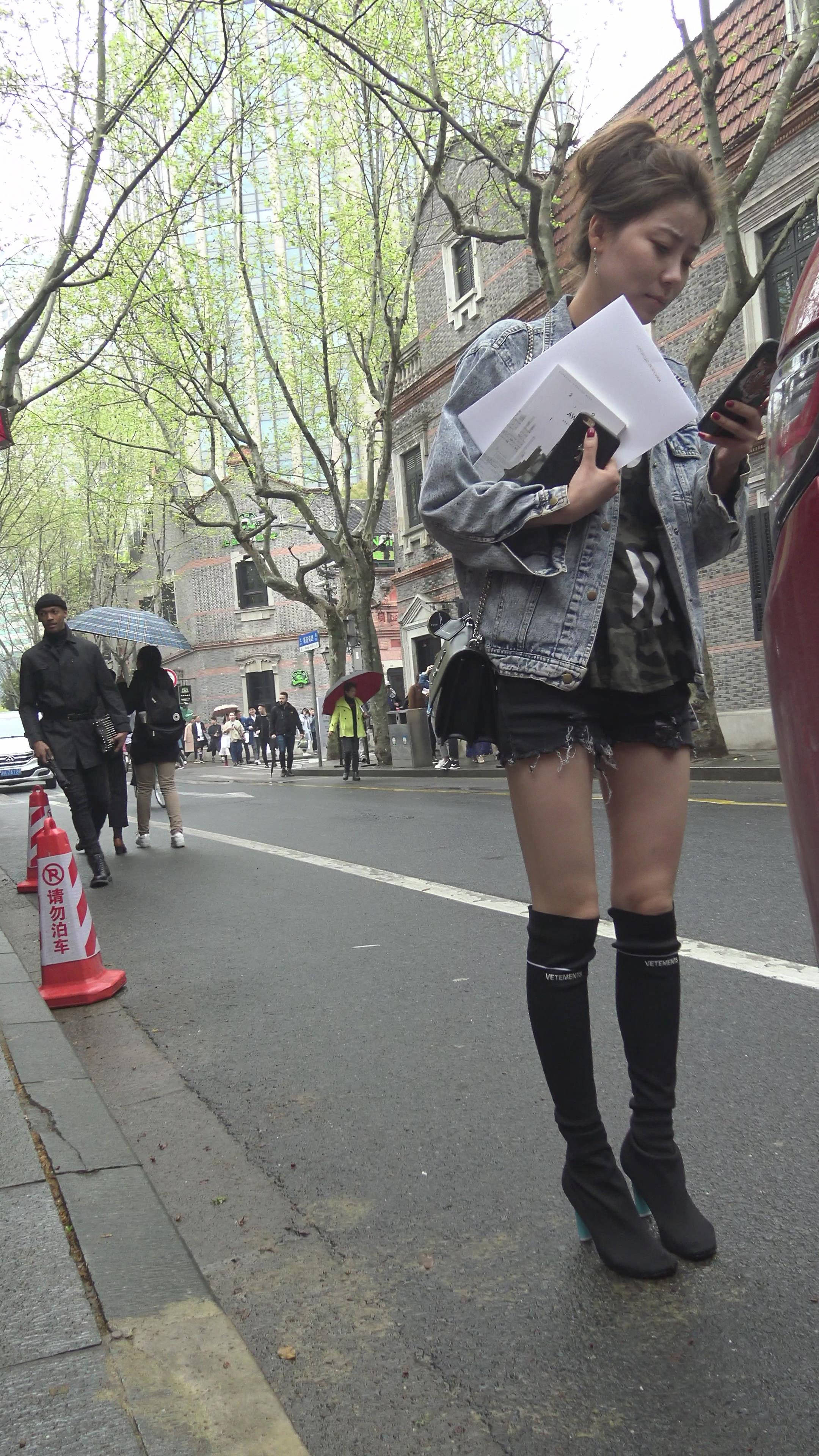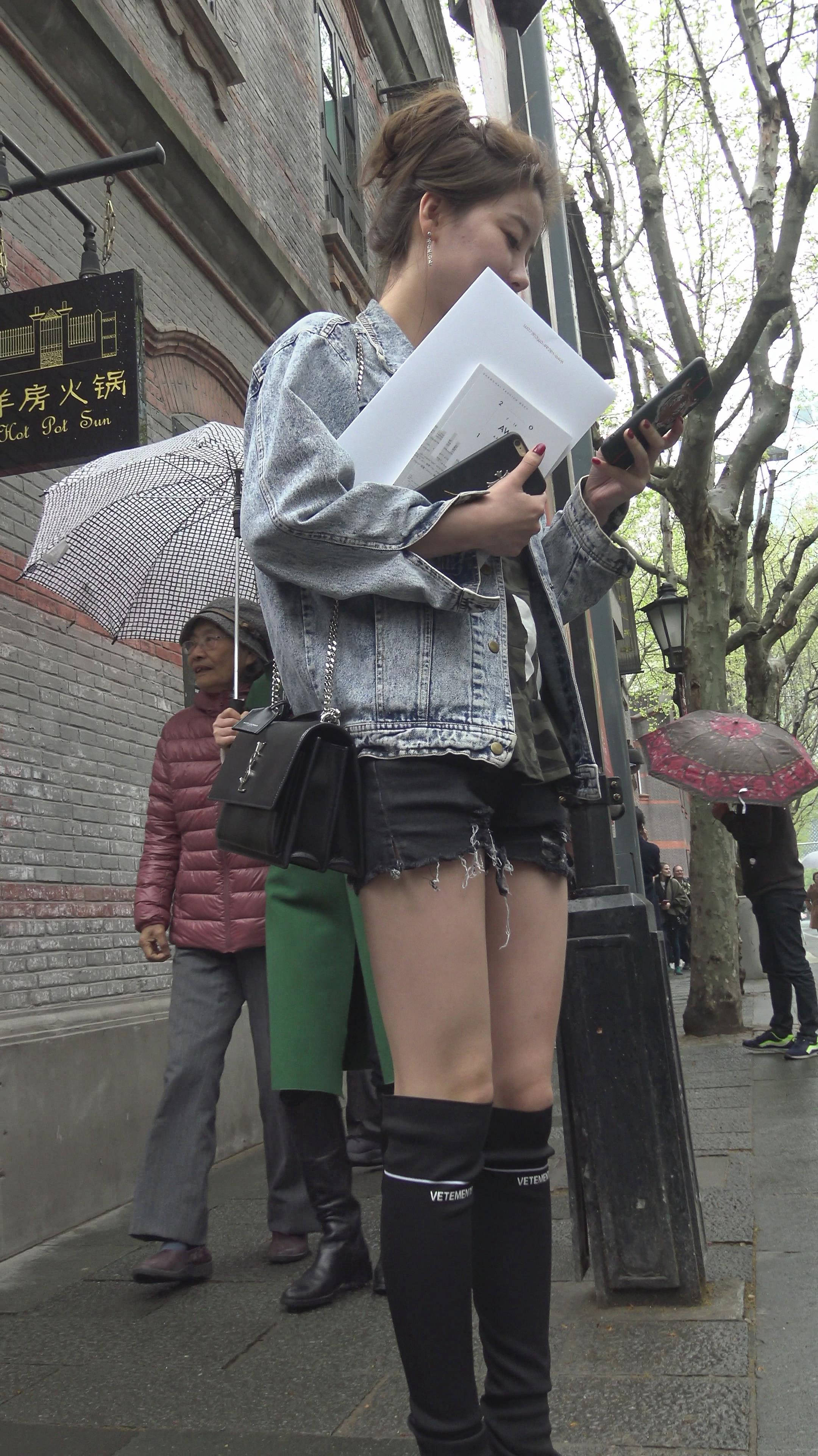 4K - 牛仔外套超短裤高挑街拍性感美女 编号7719