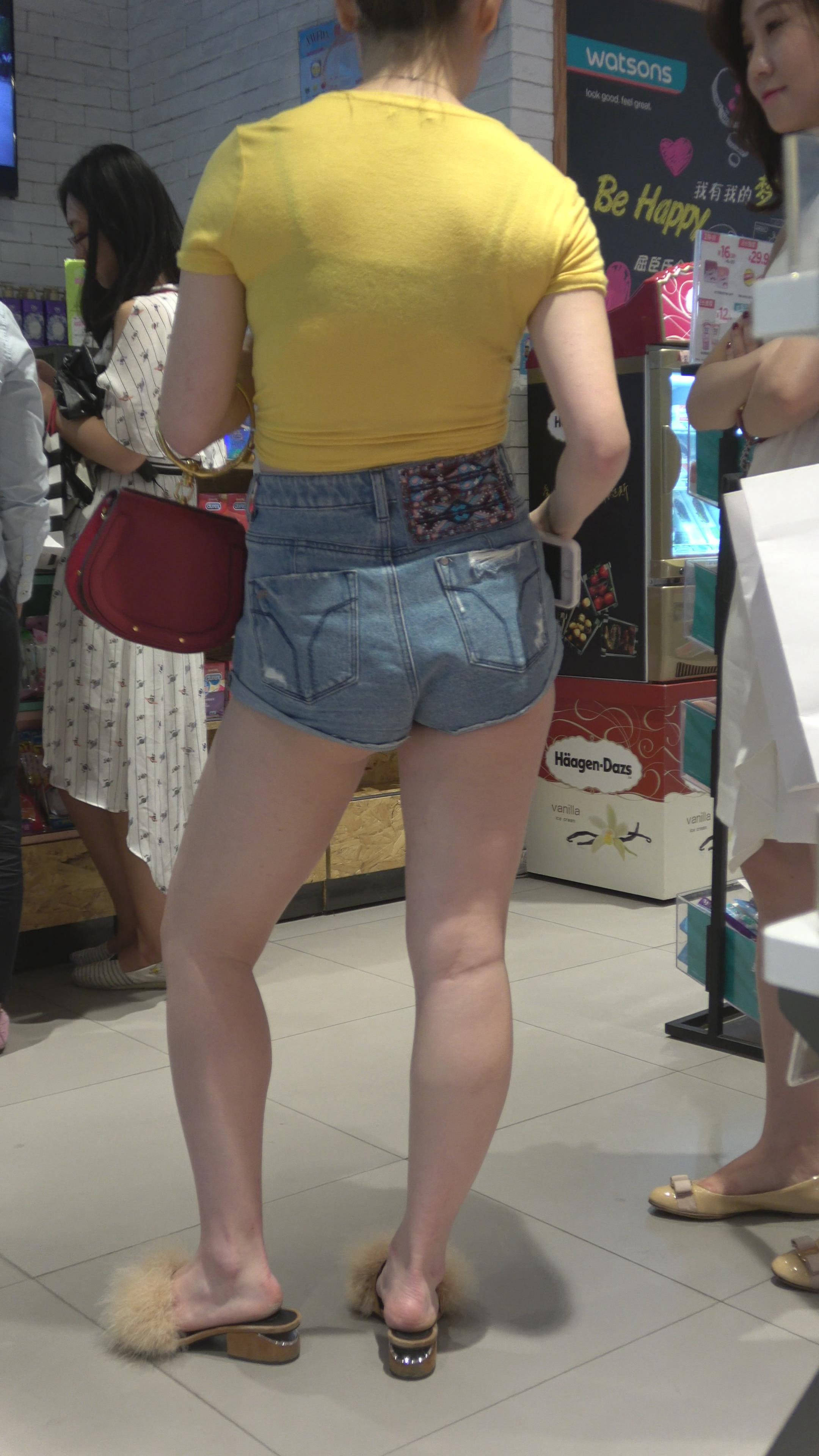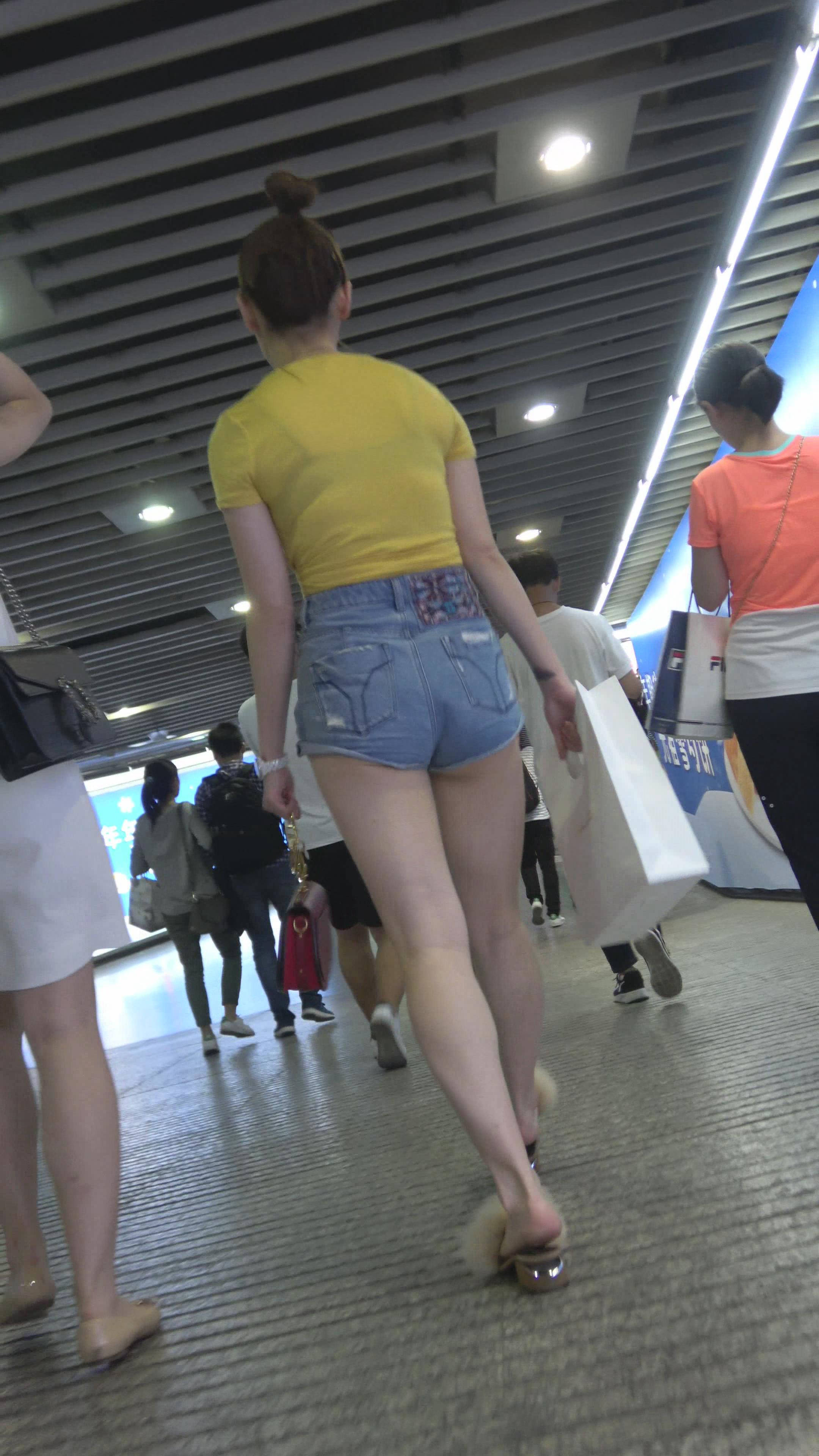 4K 黄色T恤高腰热裤街拍美臀丸子头小姐姐 编号7777
