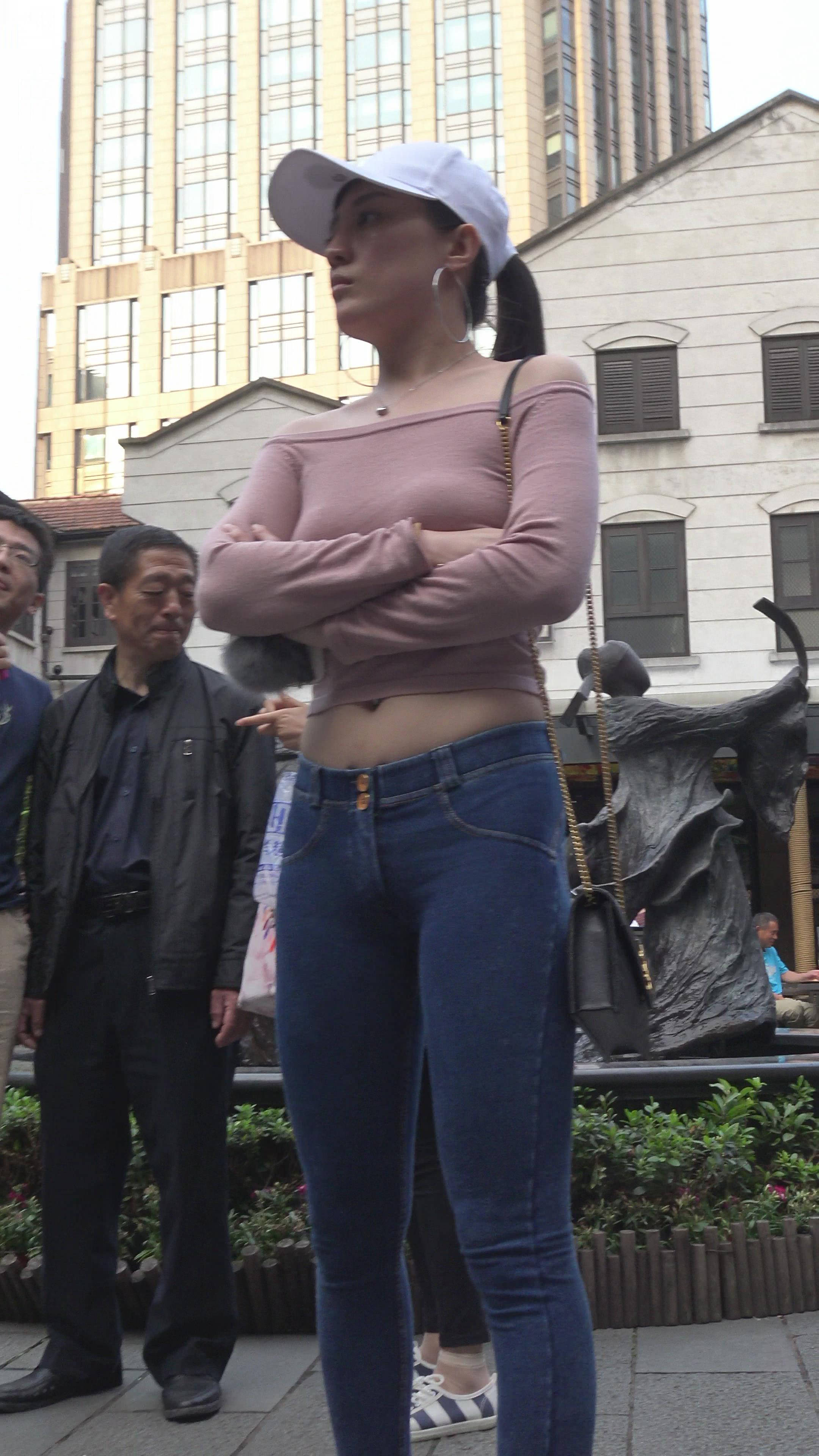 4K - 极品紧身蓝色牛仔裤街拍鸭舌帽美女 编号7821