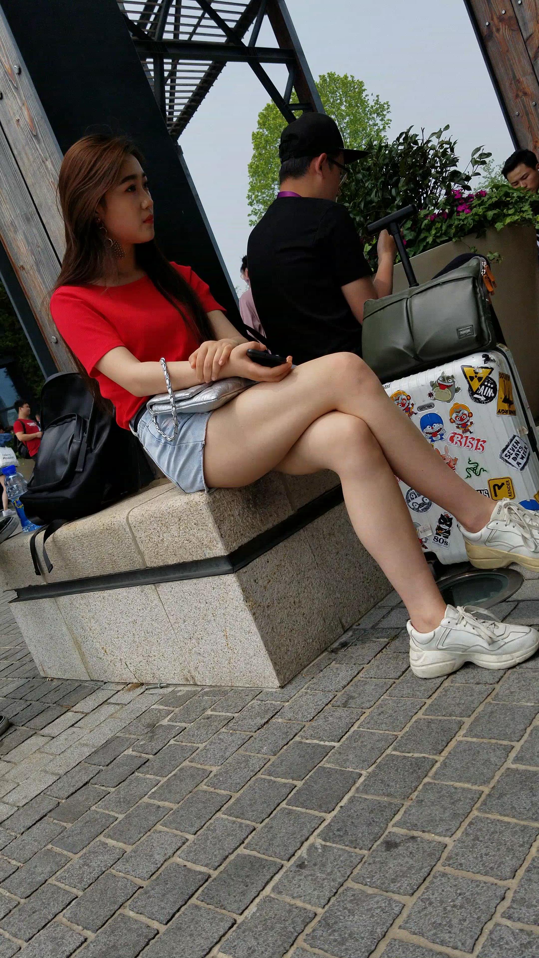 红T恤牛仔热裤白皙美腿小姐姐美若天仙 编号5191