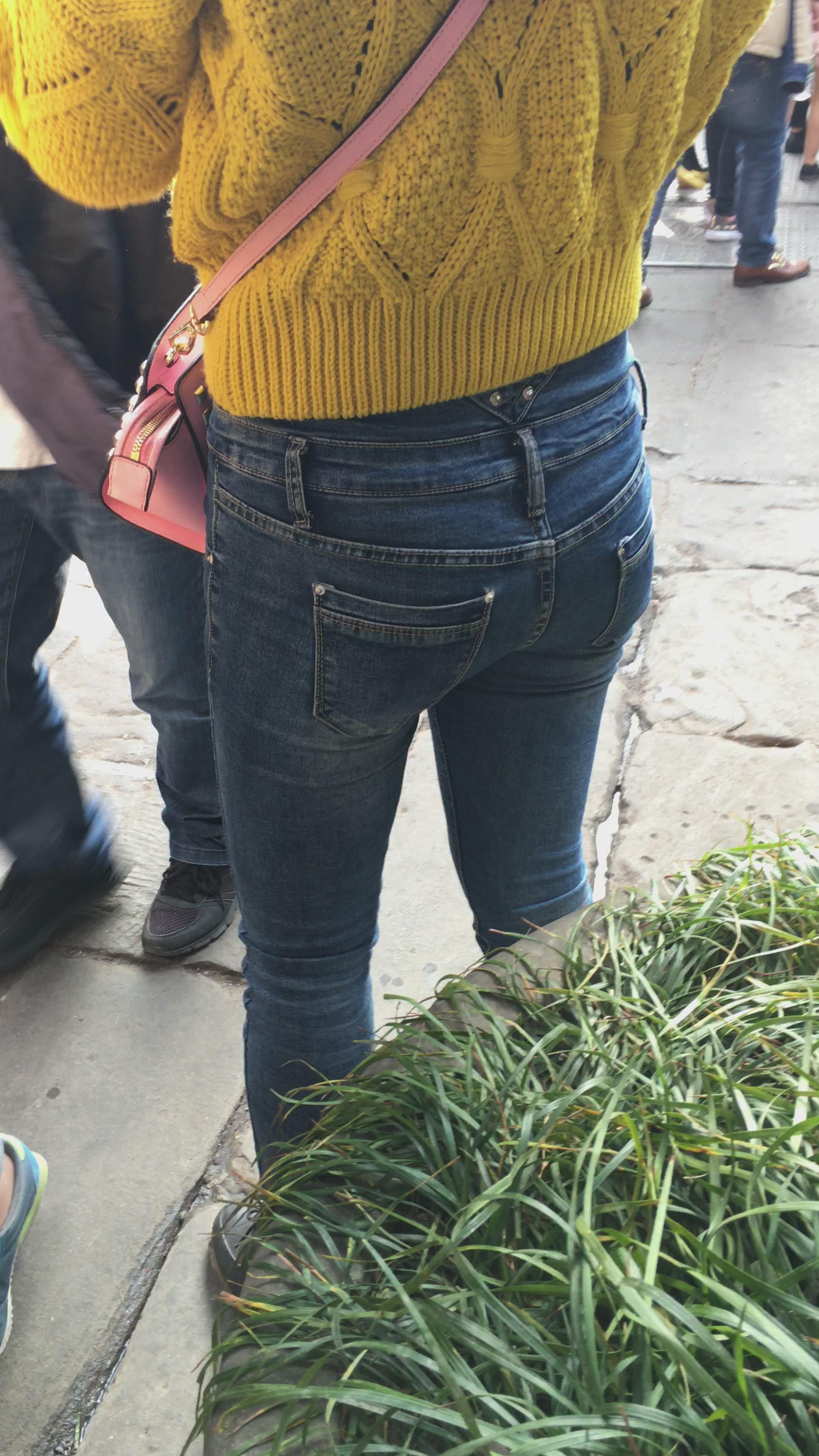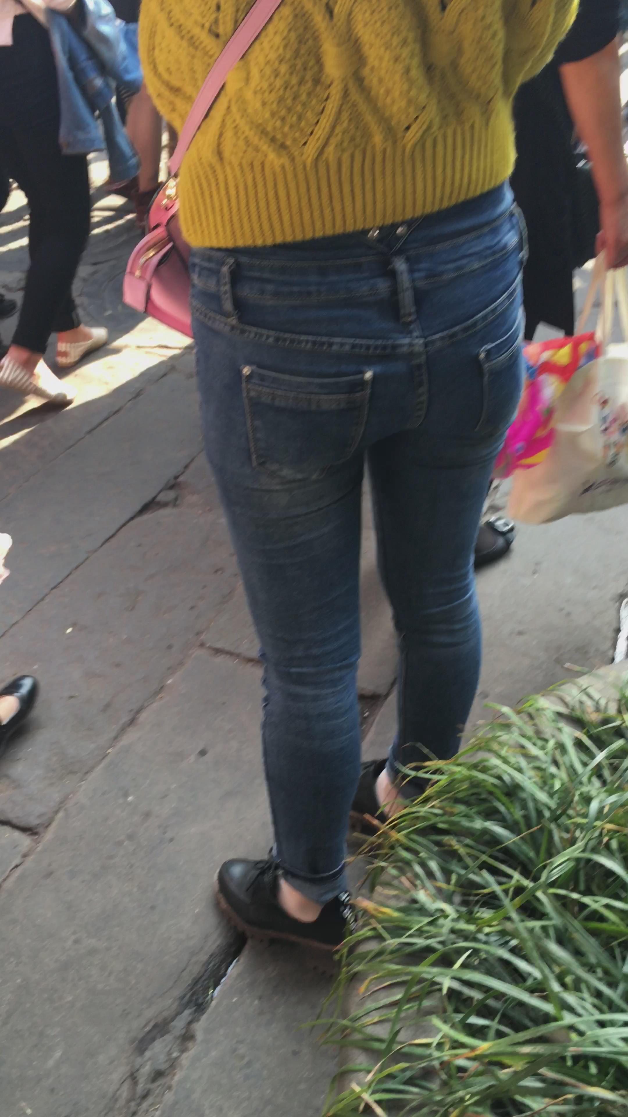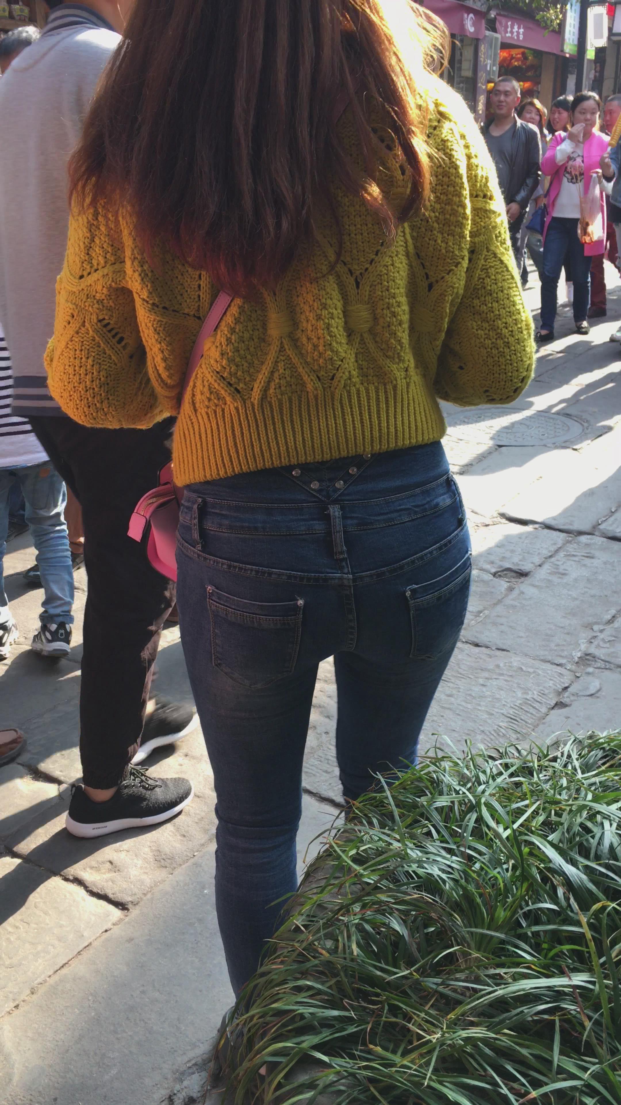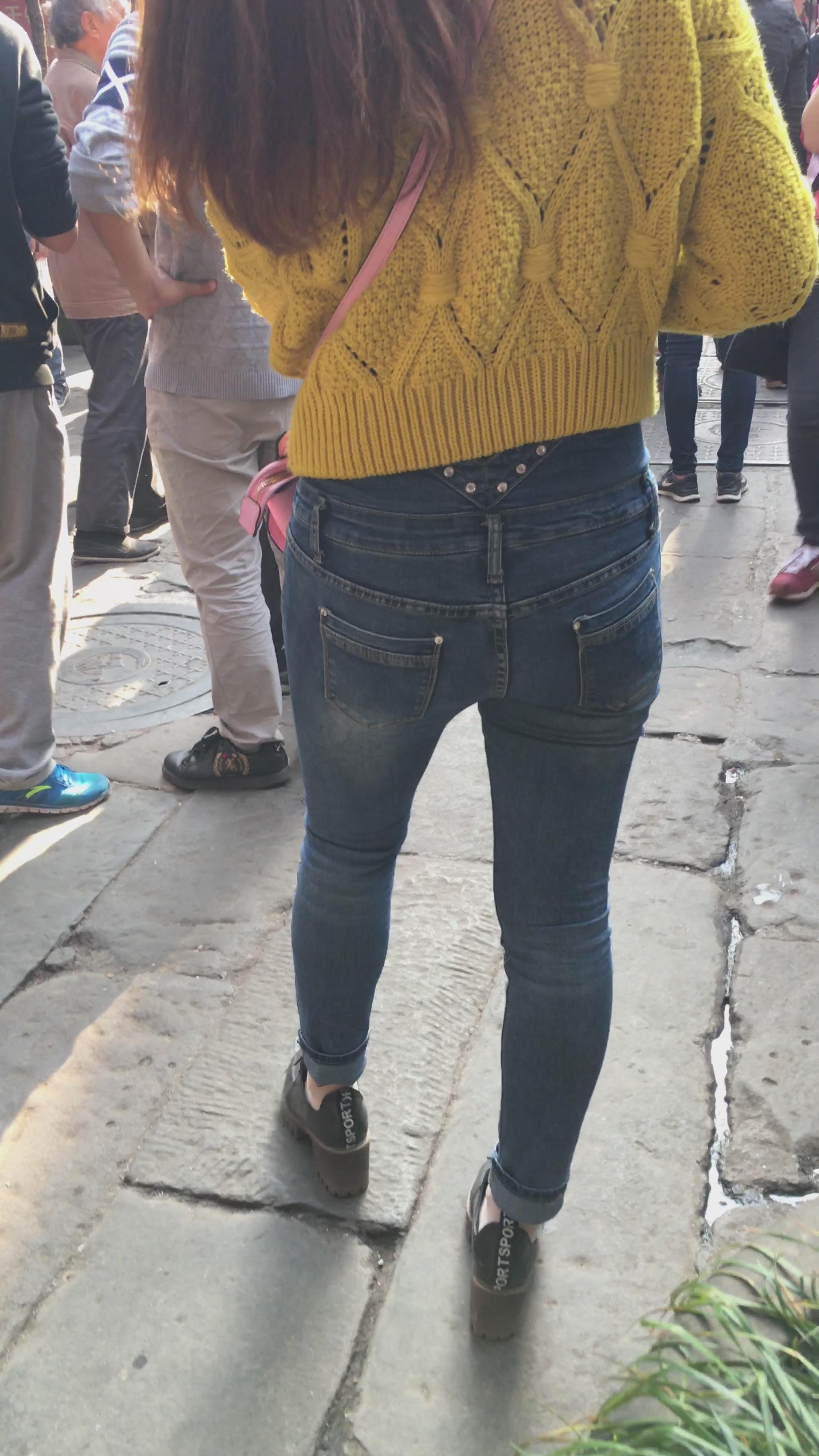 黄色毛衣街拍牛仔紧身美眉编号3910