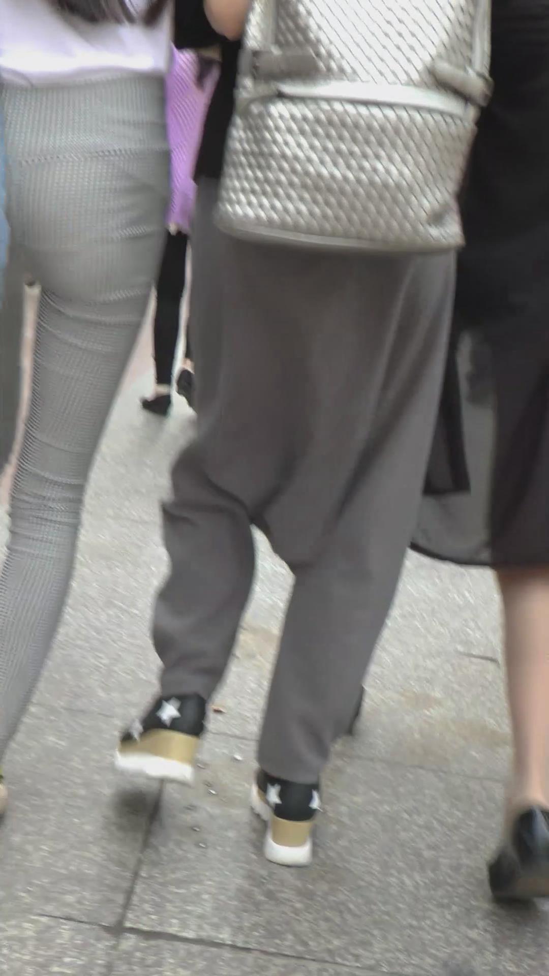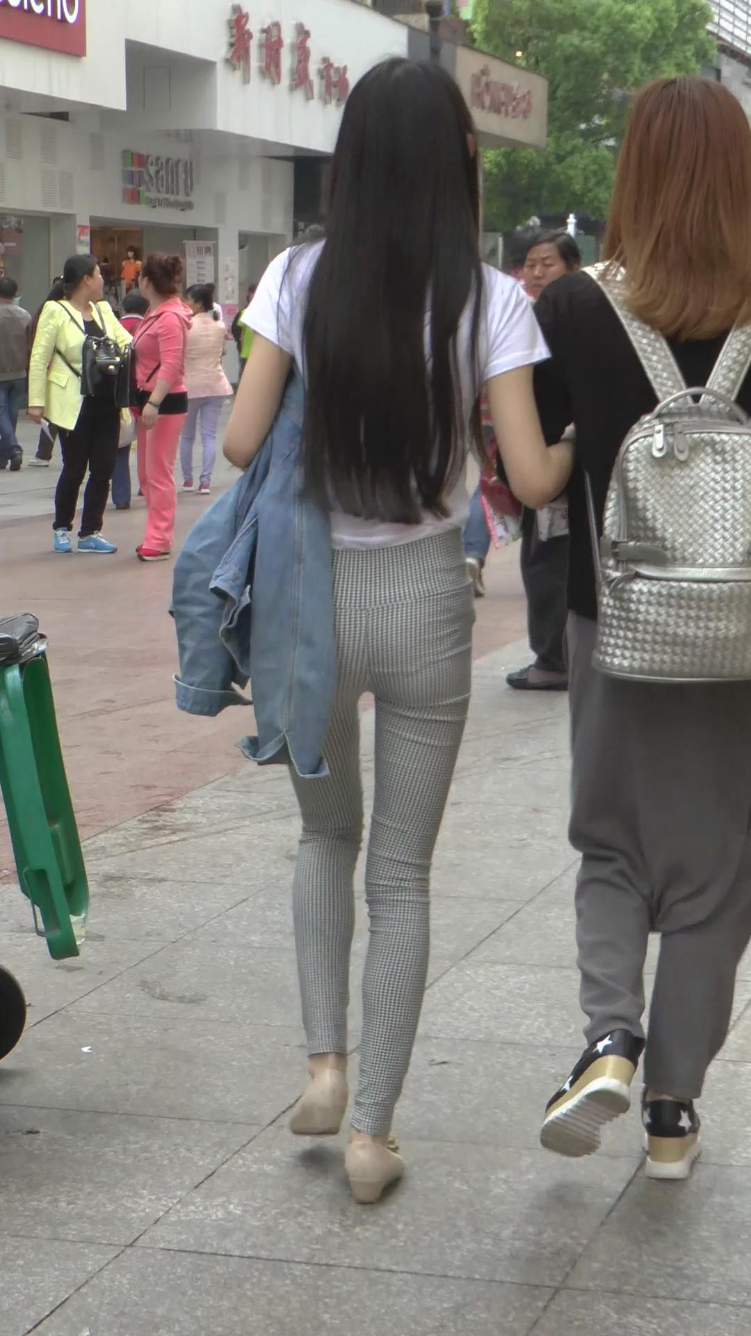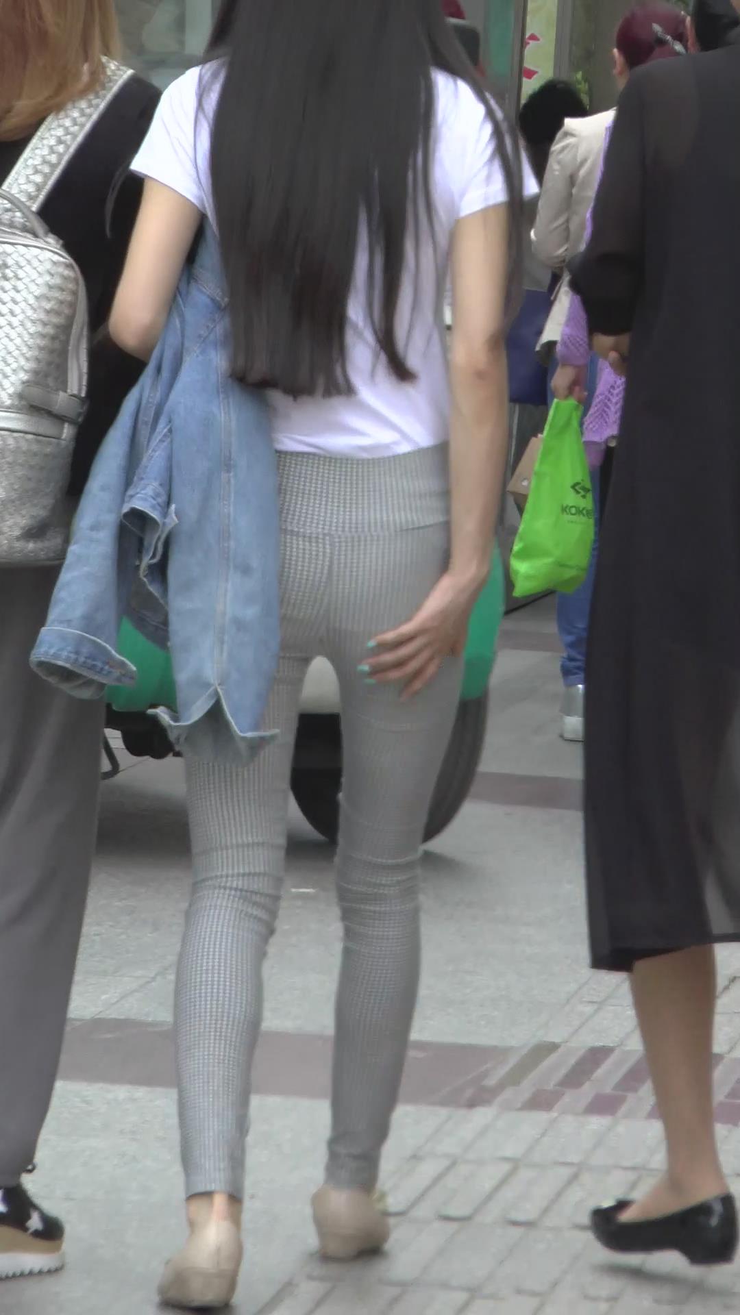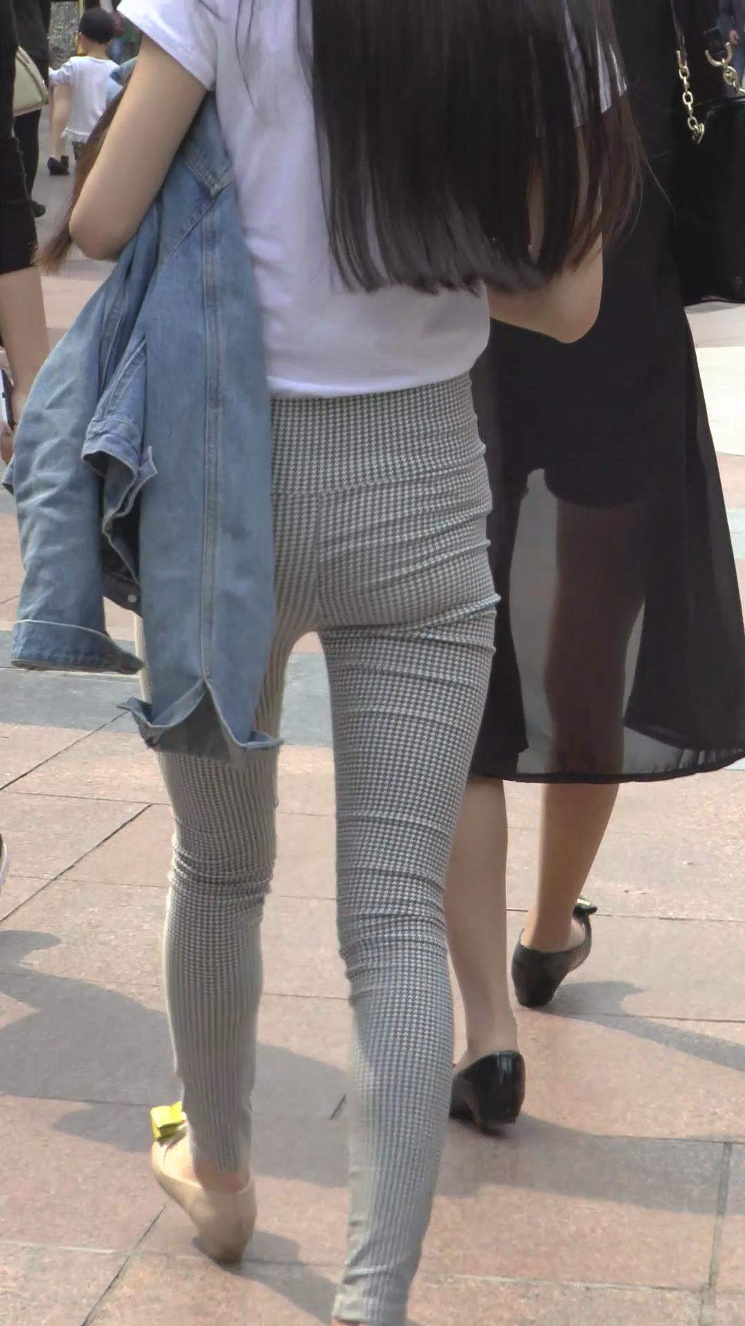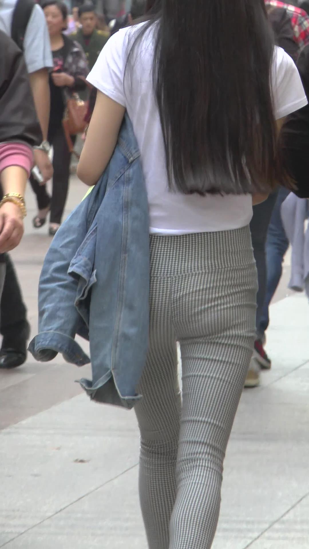 街拍格子紧身裤白T恤美臀美女 编号6072
