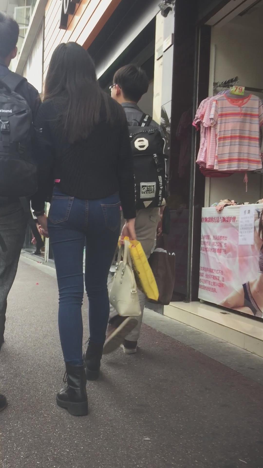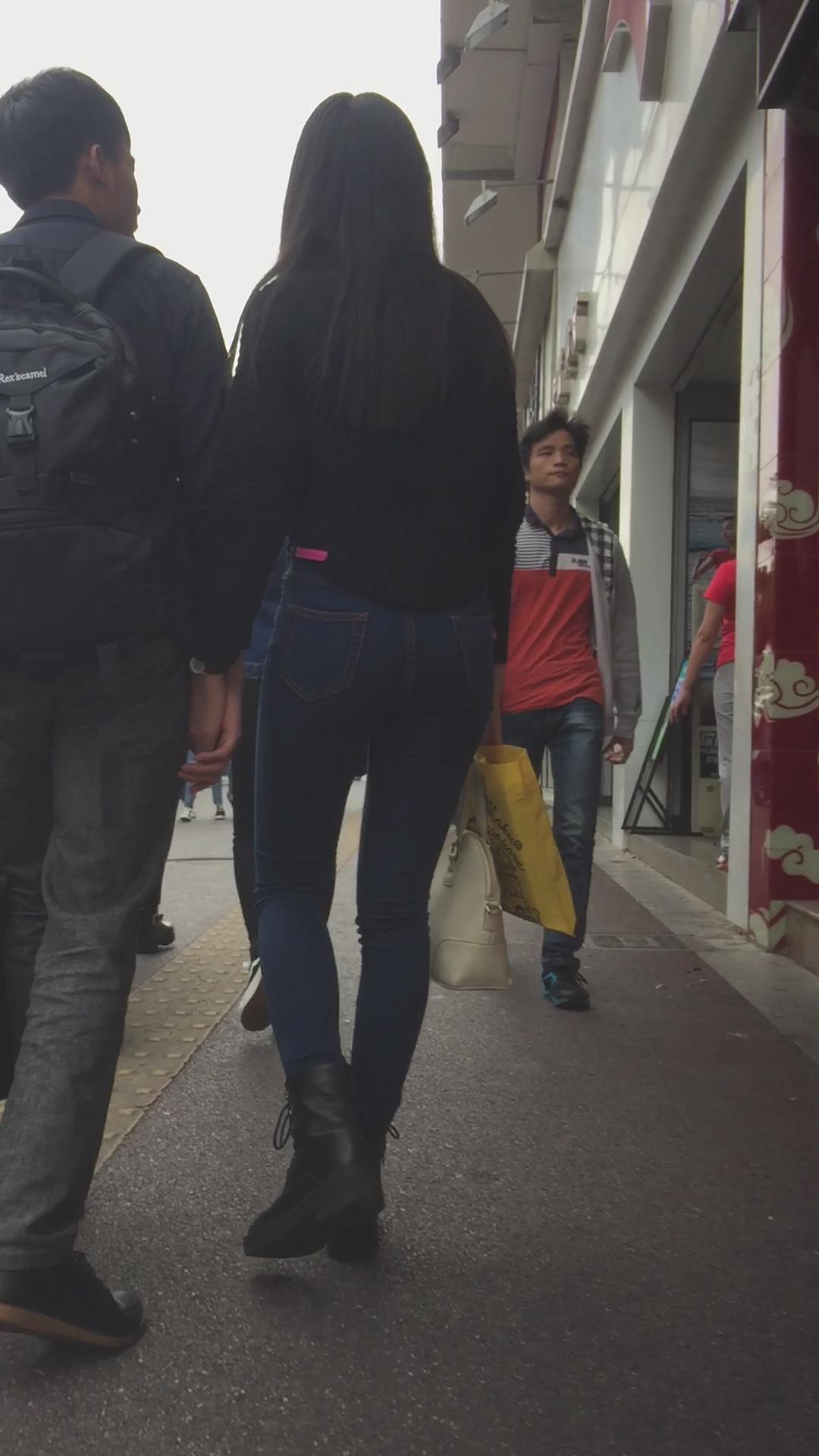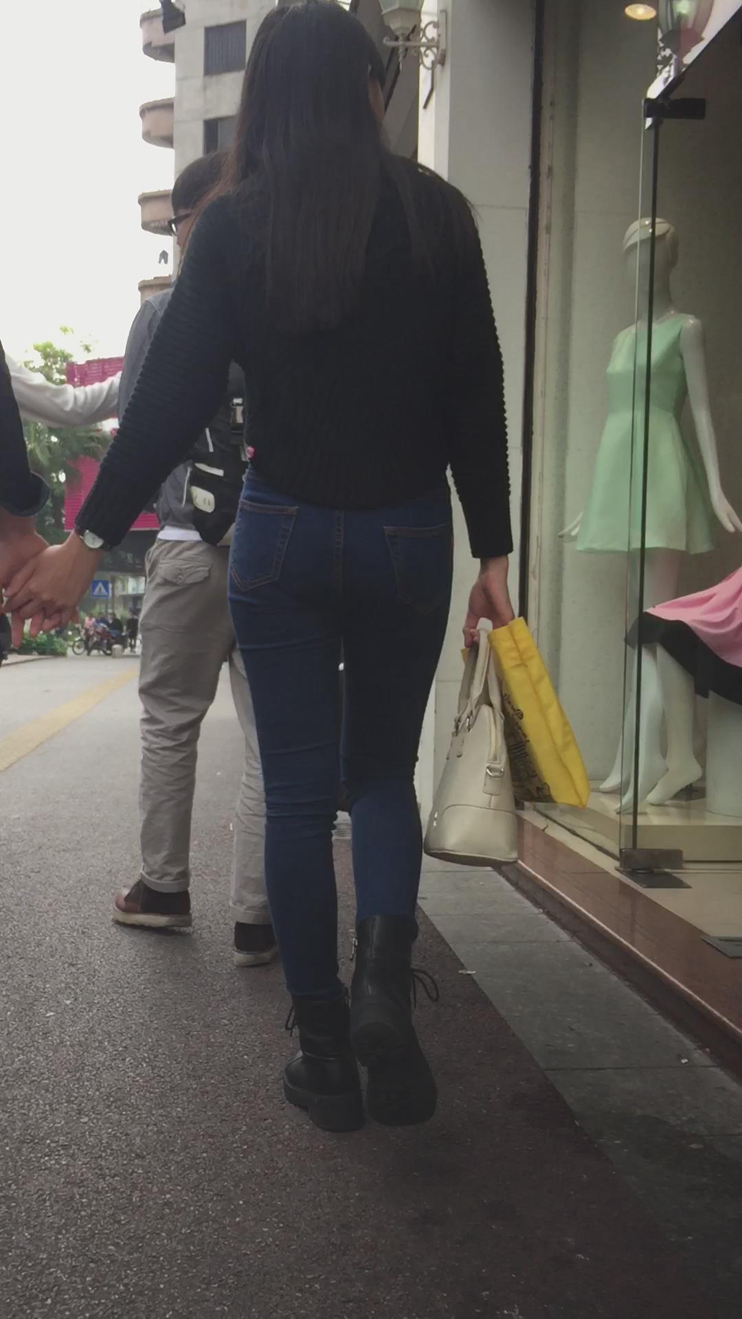 蓝色紧身牛仔裤圆润饱满美臀妹子陪男友逛街 编号6091