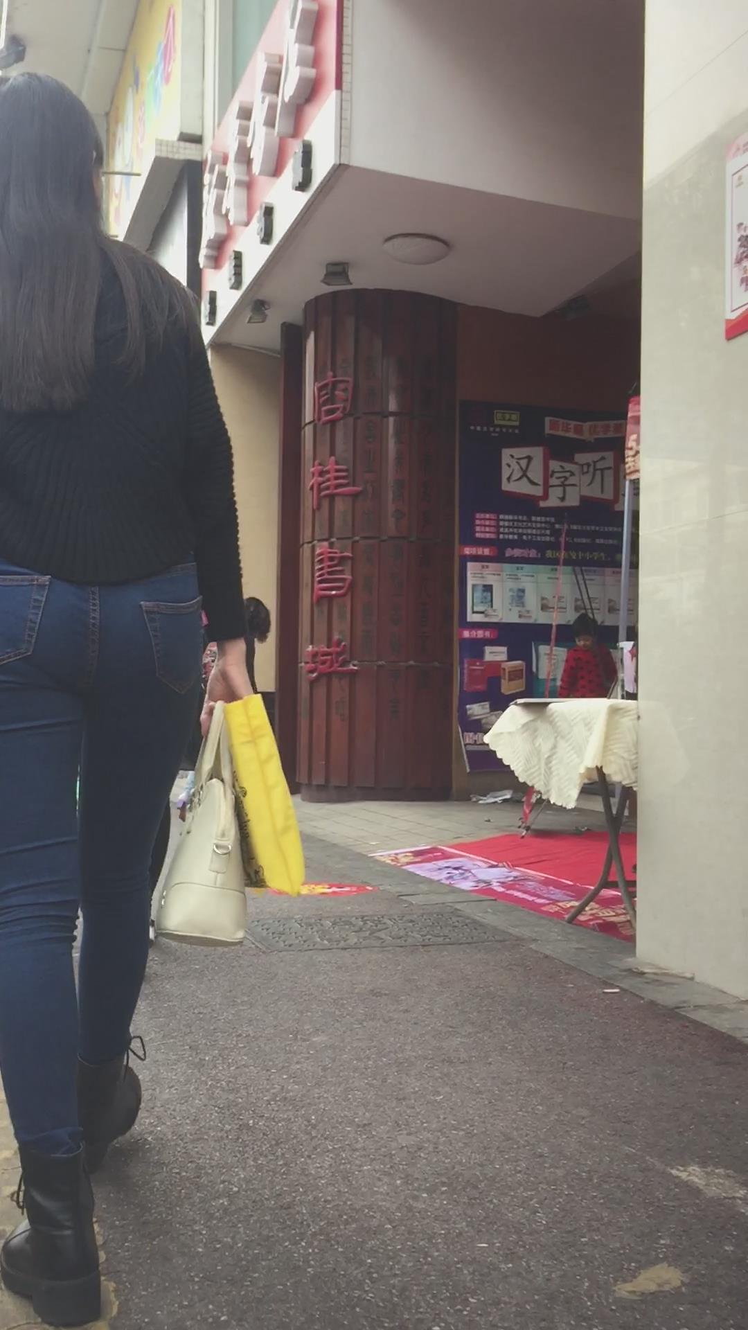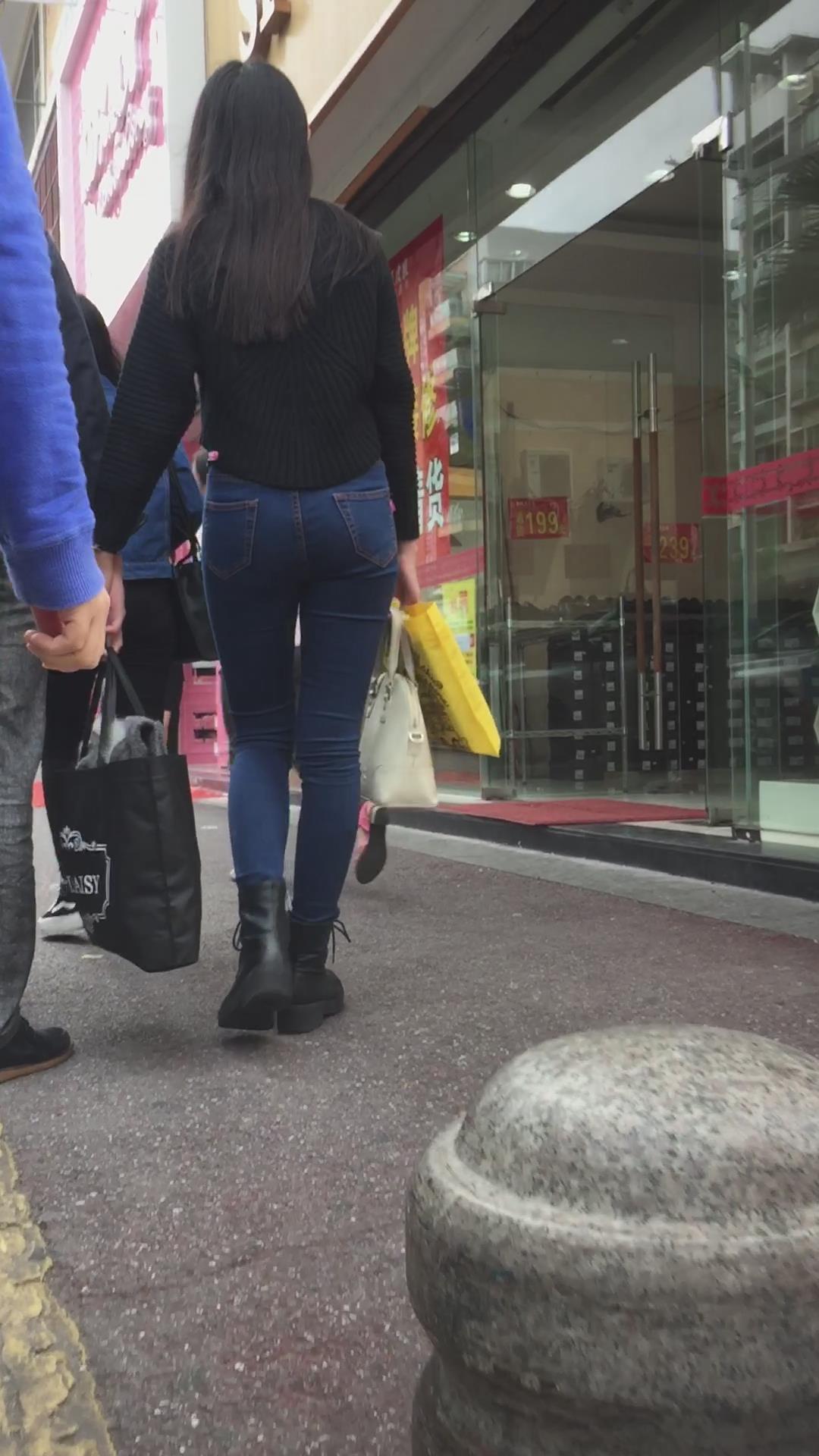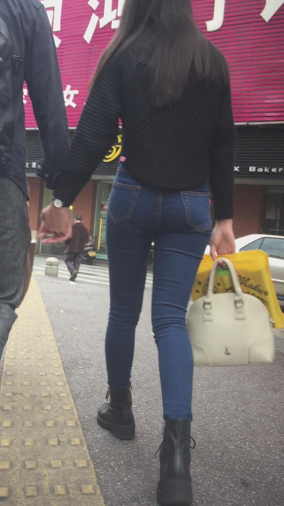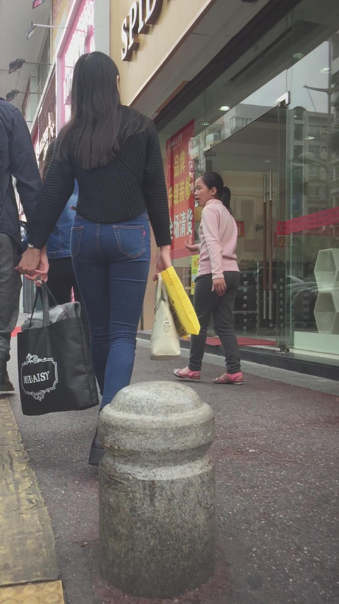 蓝色紧身牛仔裤圆润饱满美臀妹子陪男友逛街 编号6091