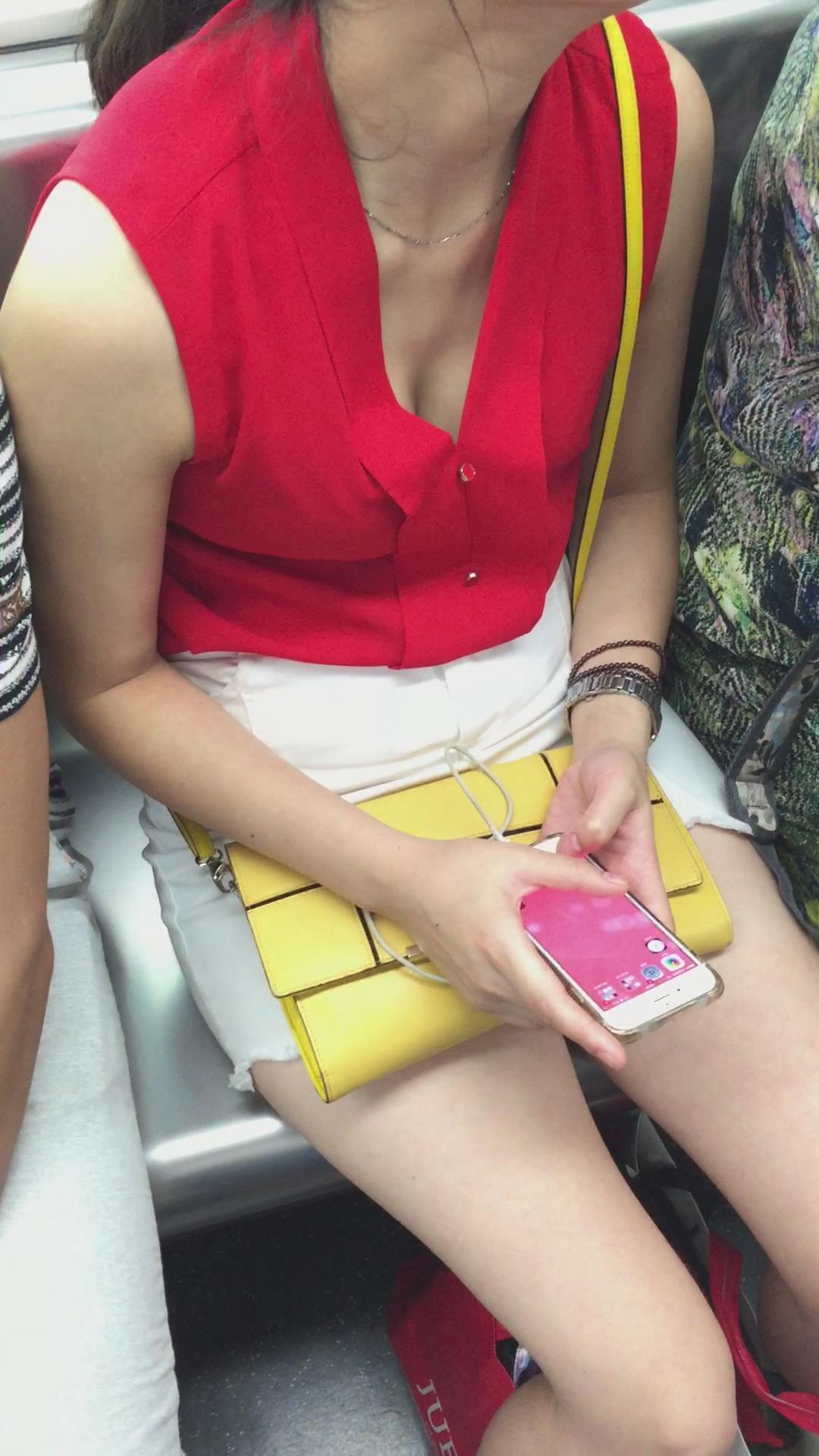 地铁上事业线很深的红衣女孩,很丰满 编号5186