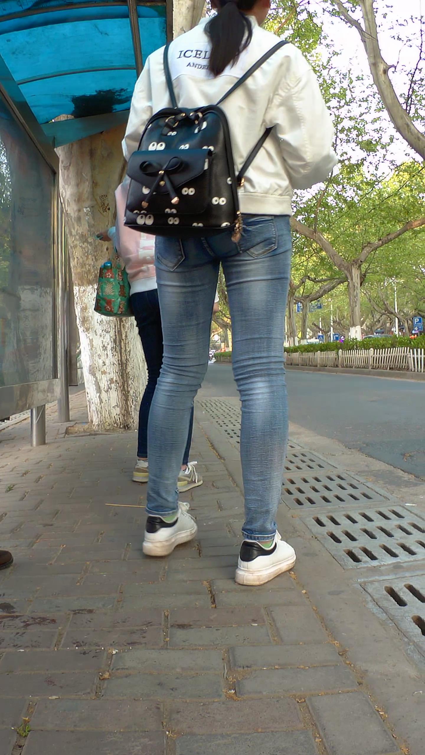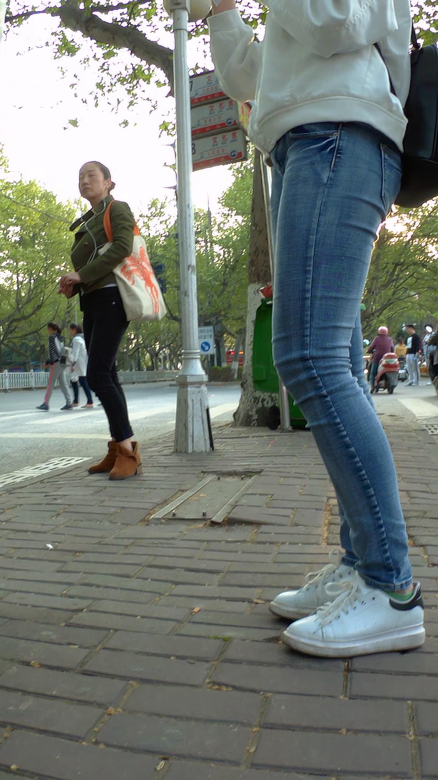 紧身牛仔小美女公交站等车 编号5302