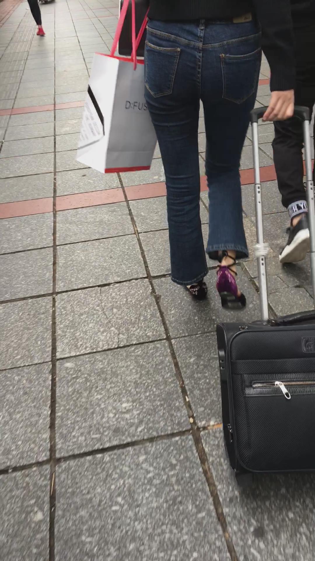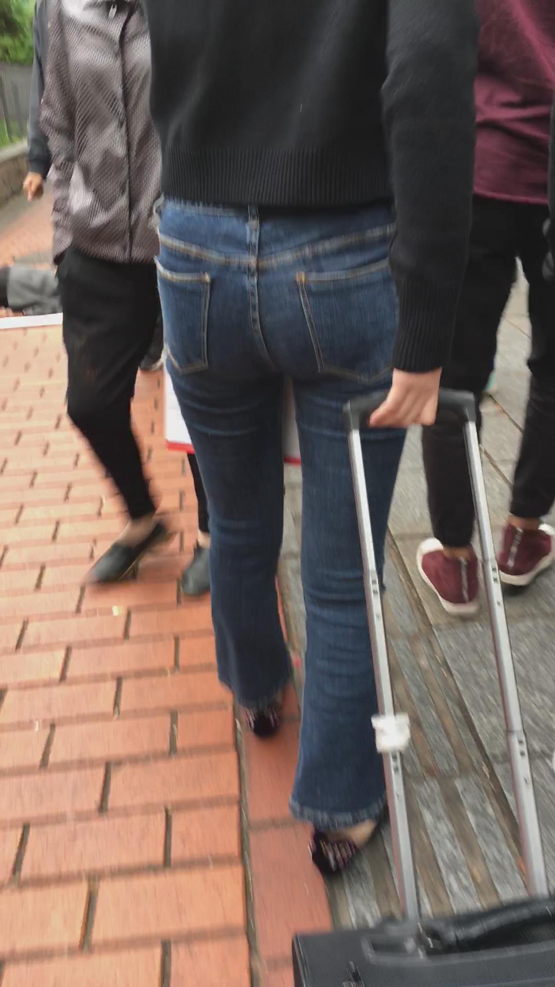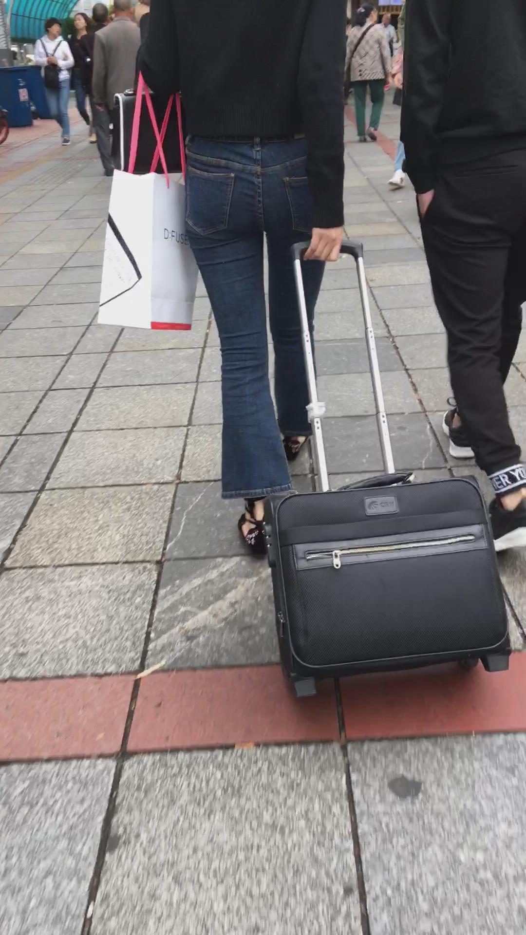 街拍蓝色紧身牛仔裤黑衣服美女 编号5338