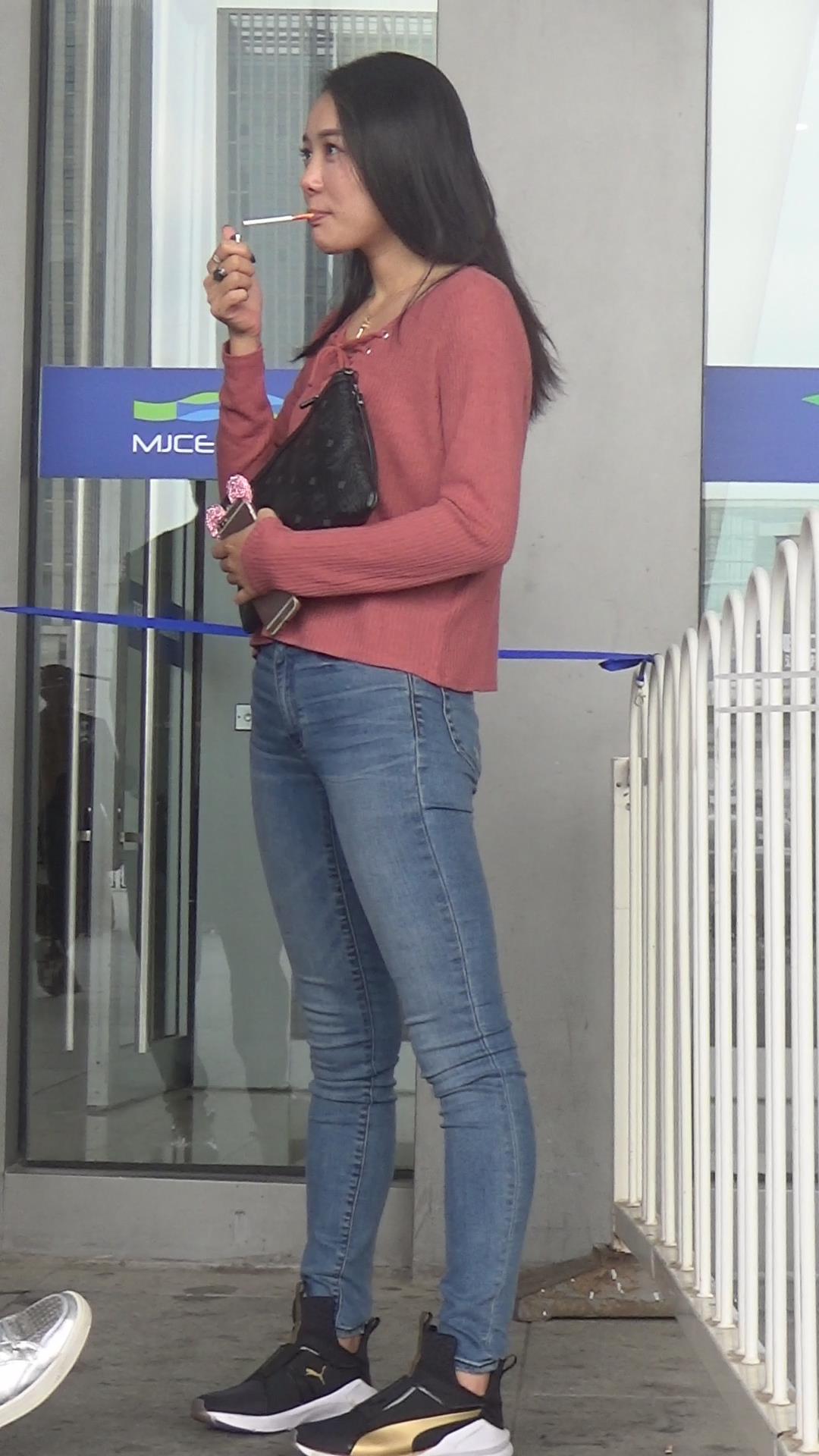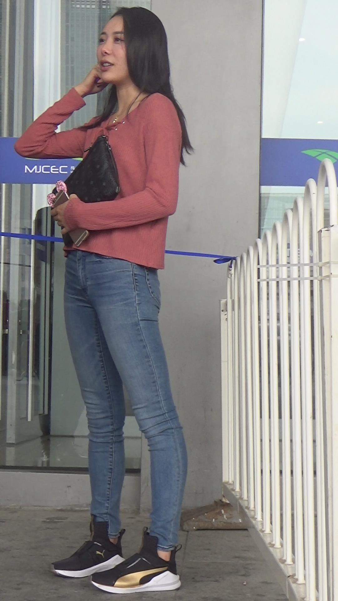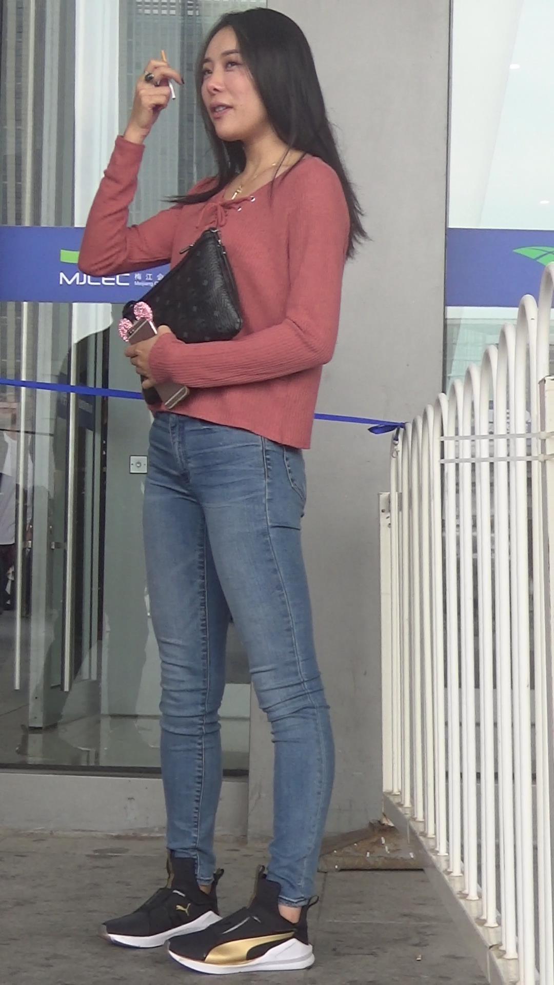 极品基本蓝色牛仔裤运动鞋粉衣街拍美女 编号5339
