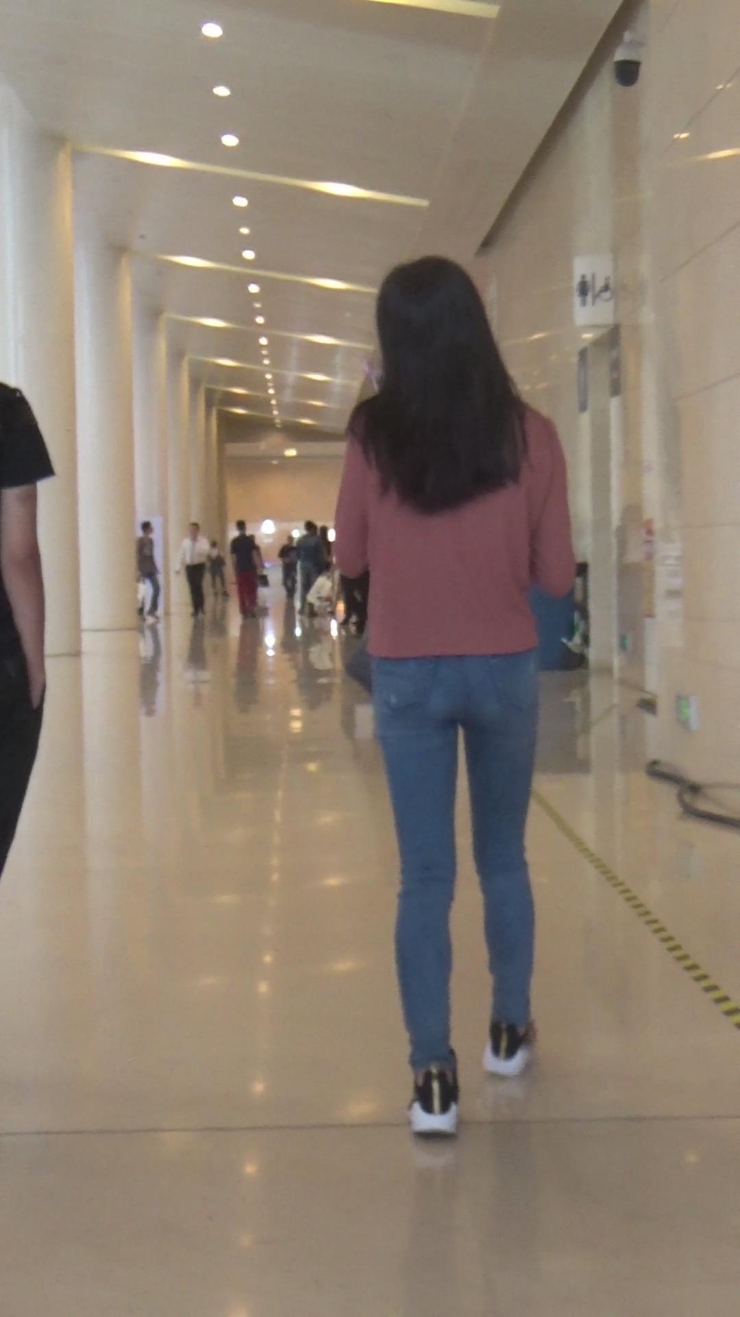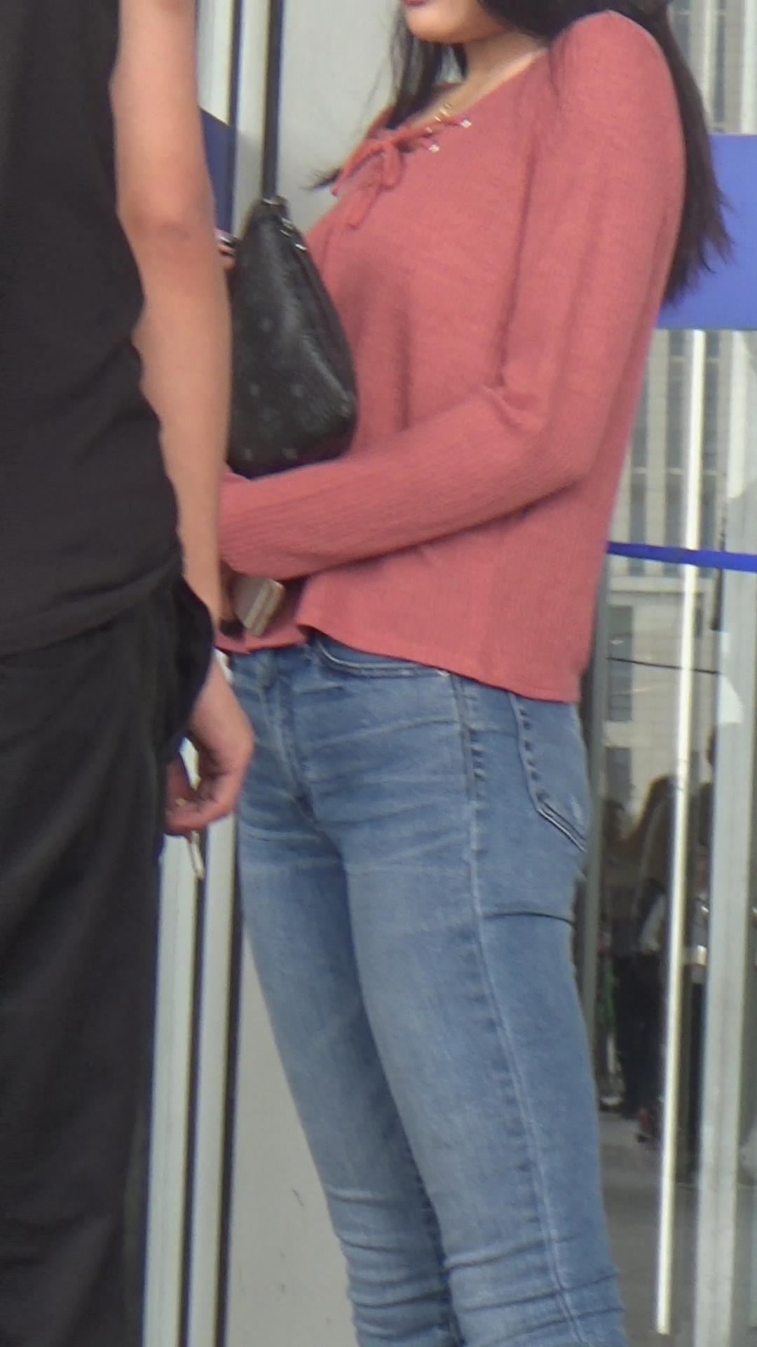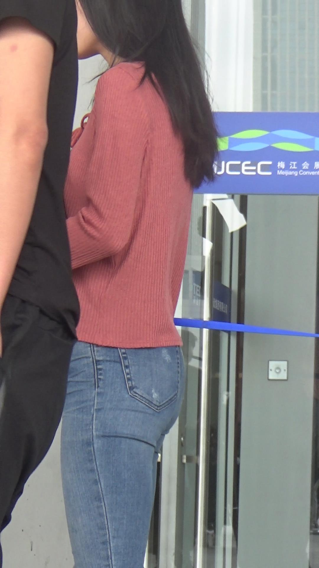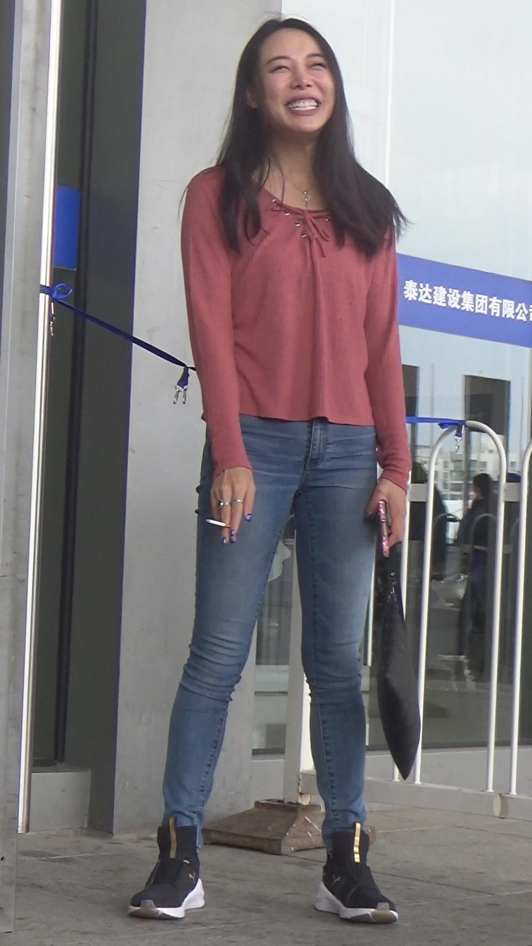 极品基本蓝色牛仔裤运动鞋粉衣街拍美女 编号5339
