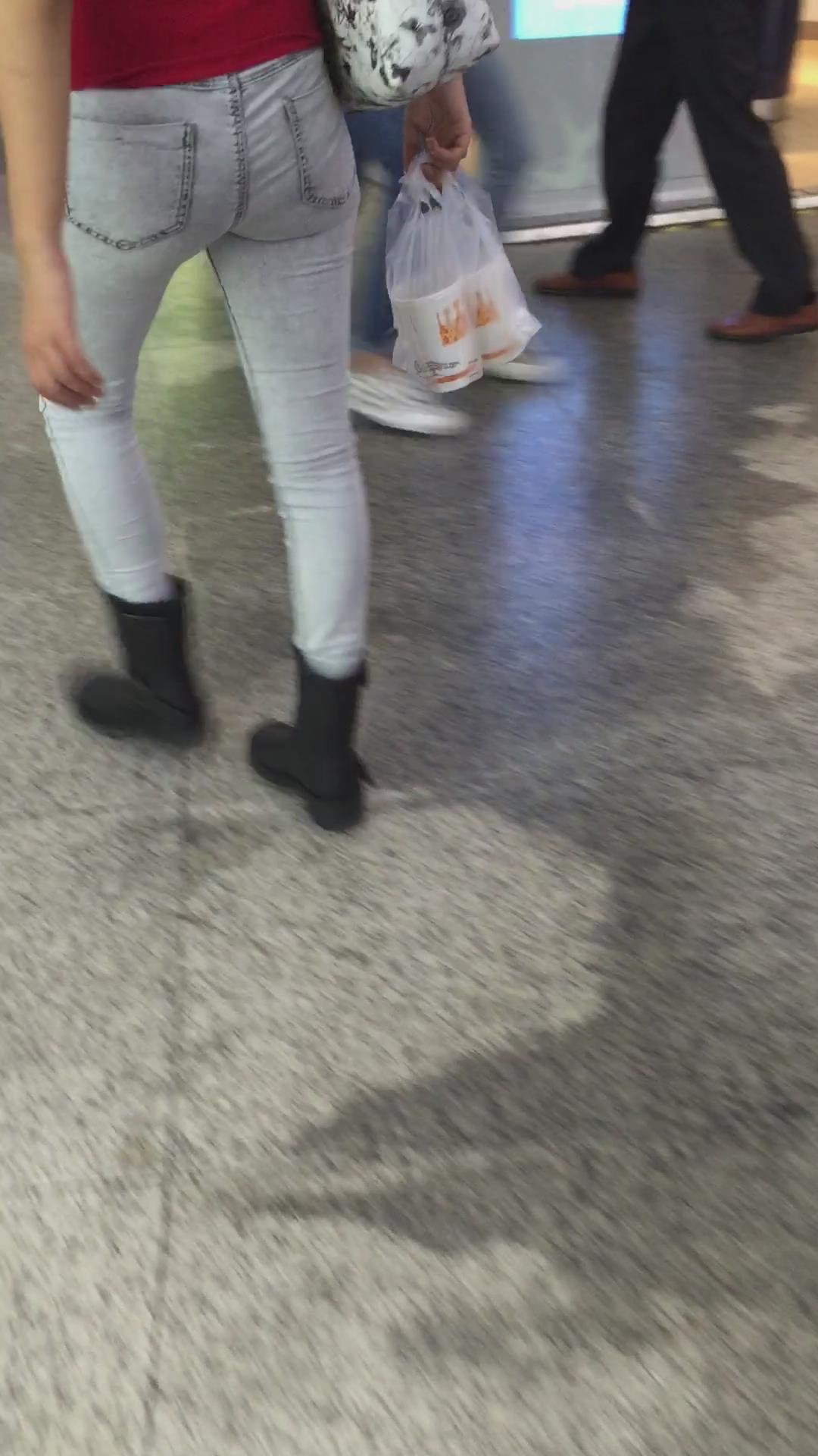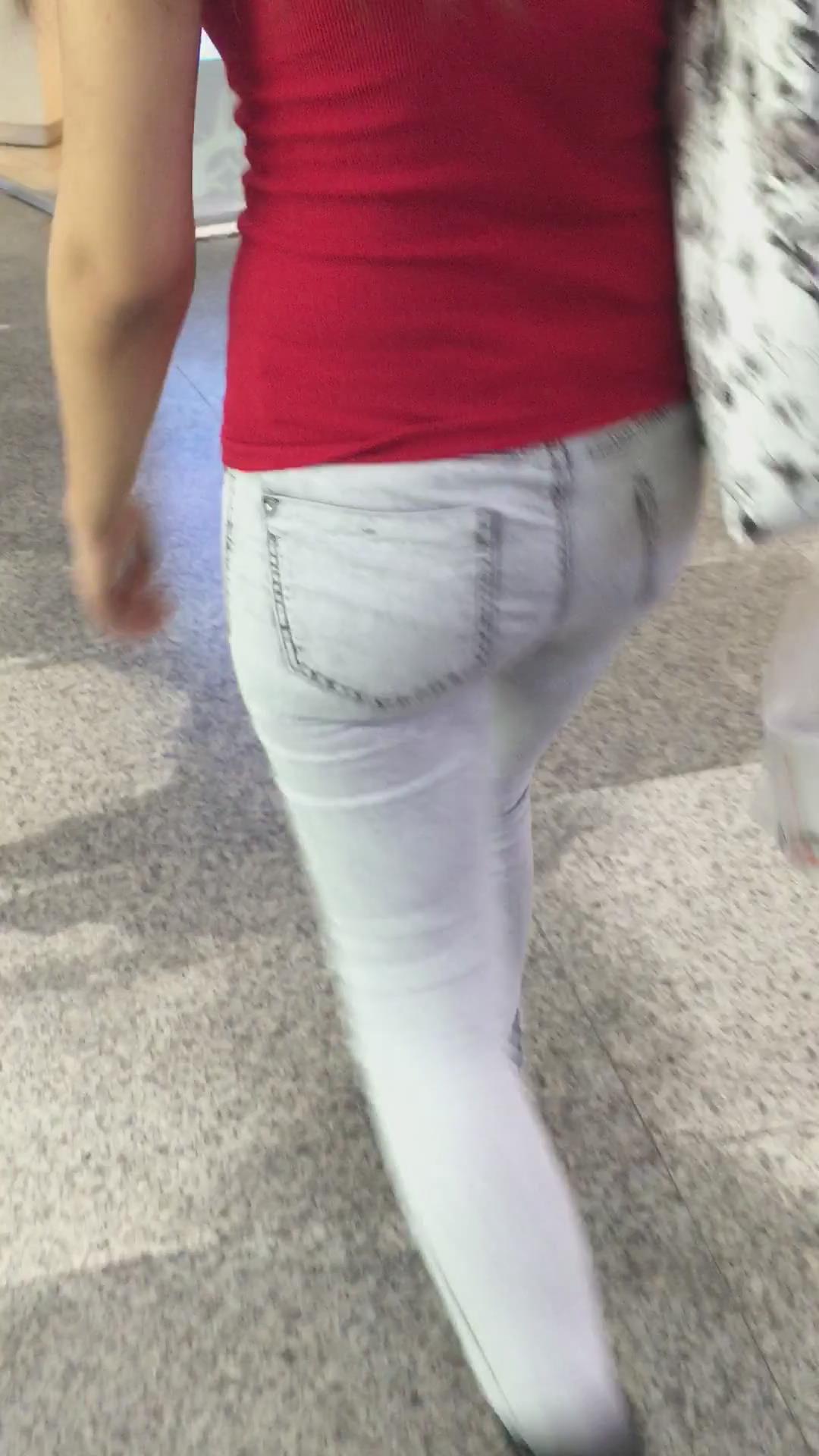 红T恤超紧绷牛仔裤街拍美臀 编号5343