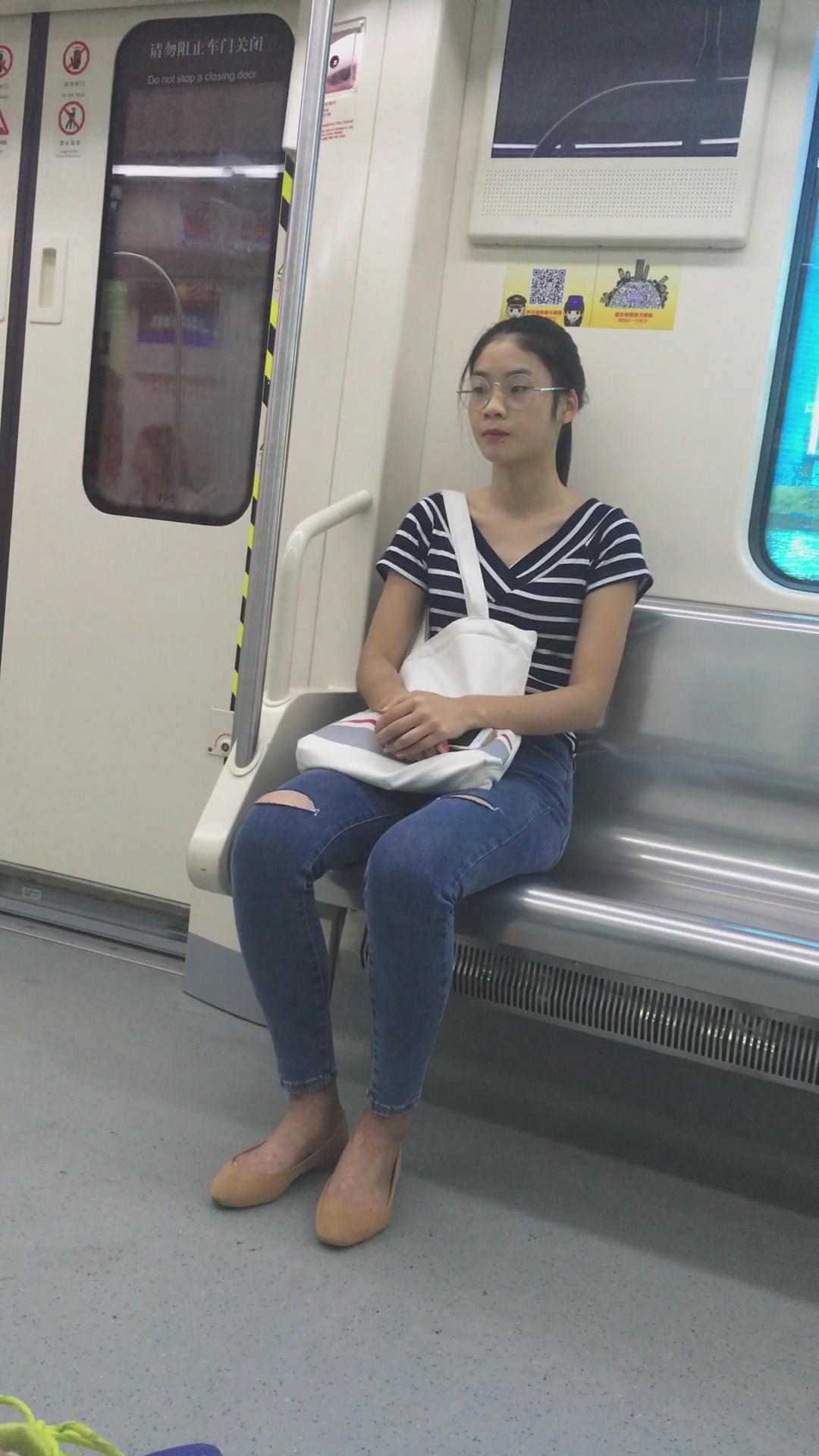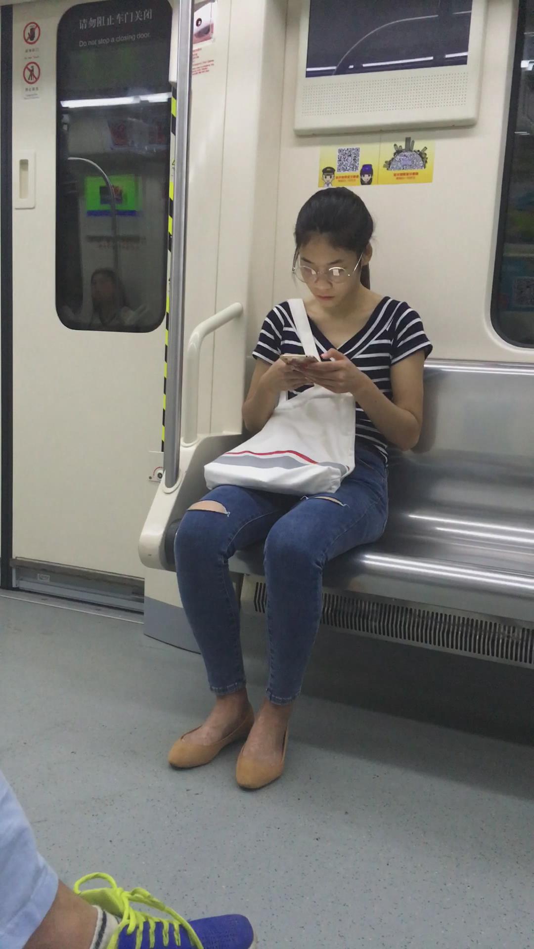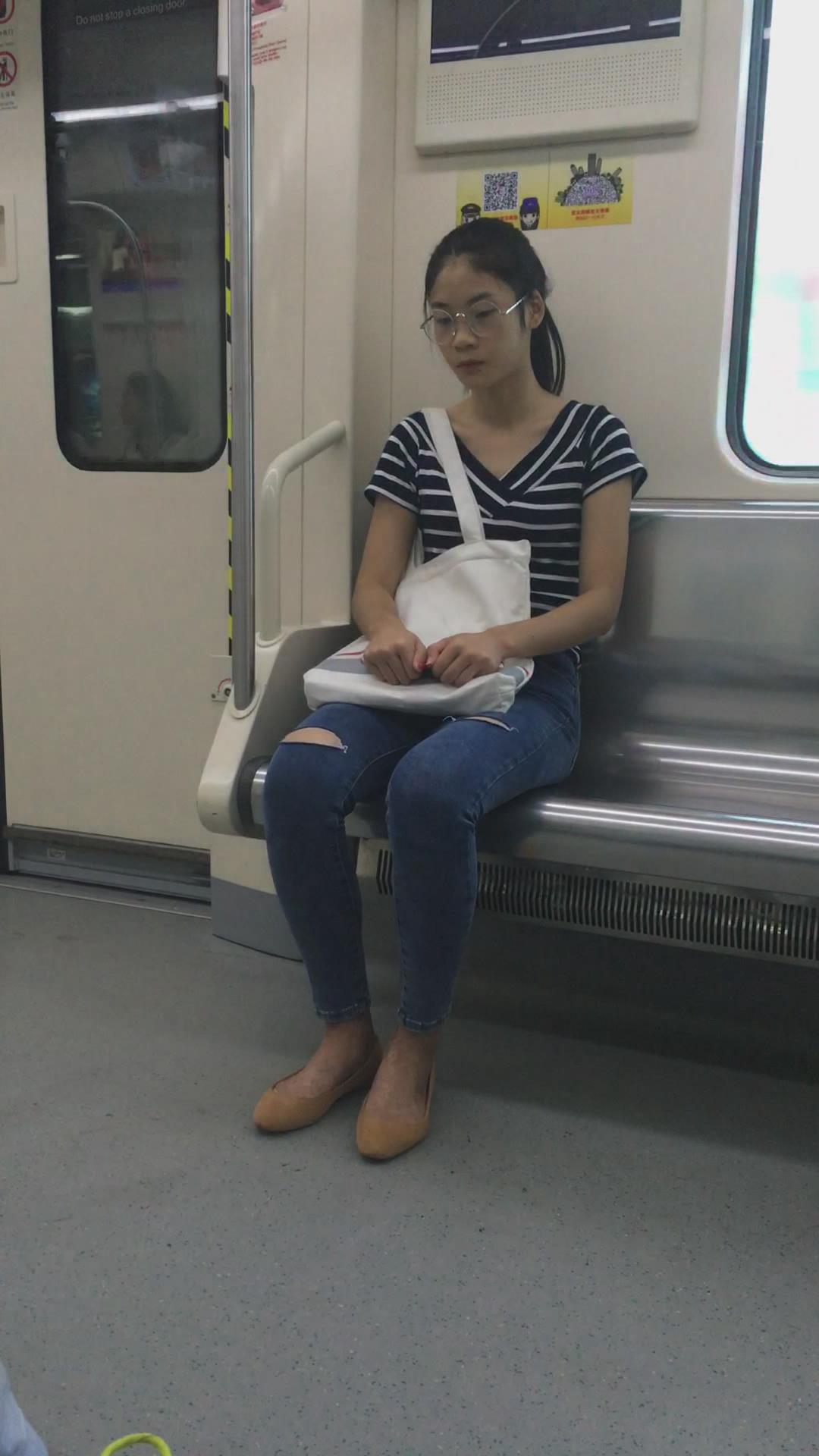 地铁上的眼镜蓝色牛仔裤美眉 编号5454