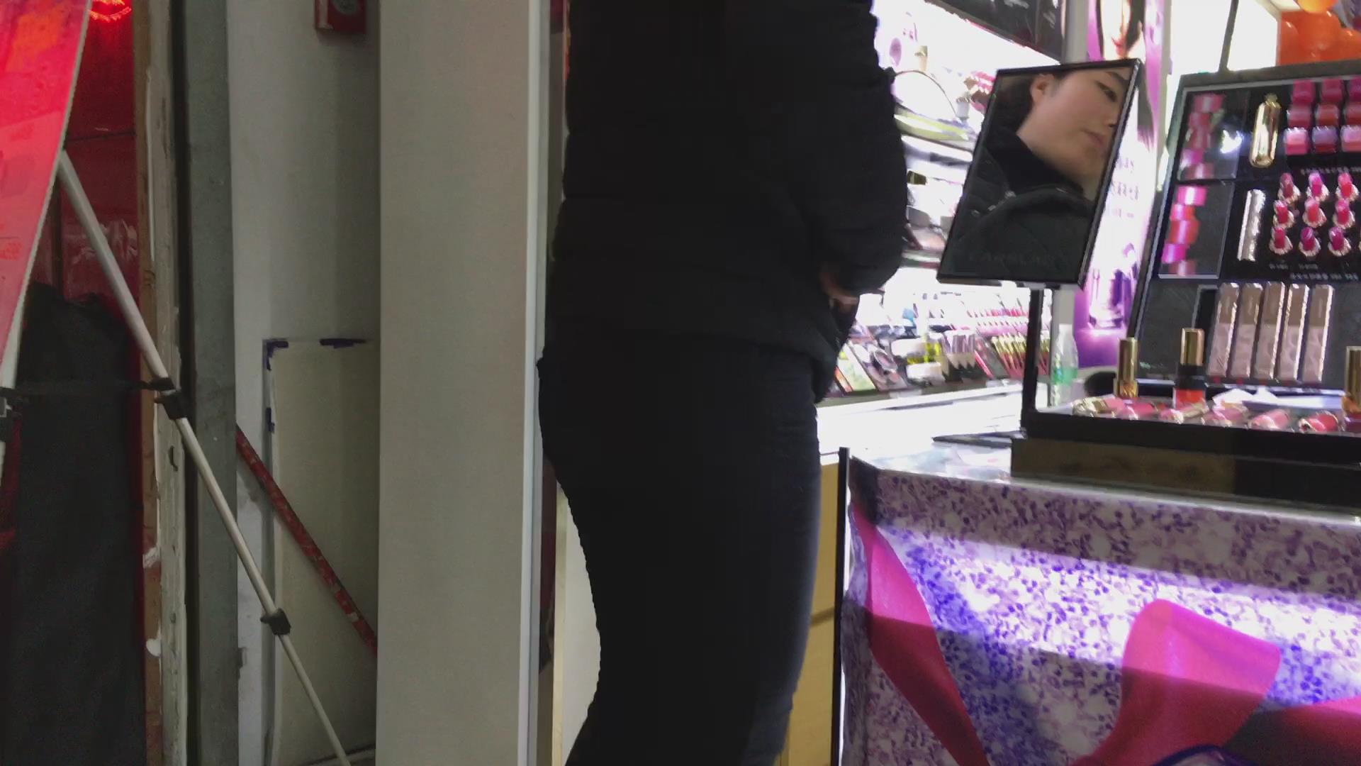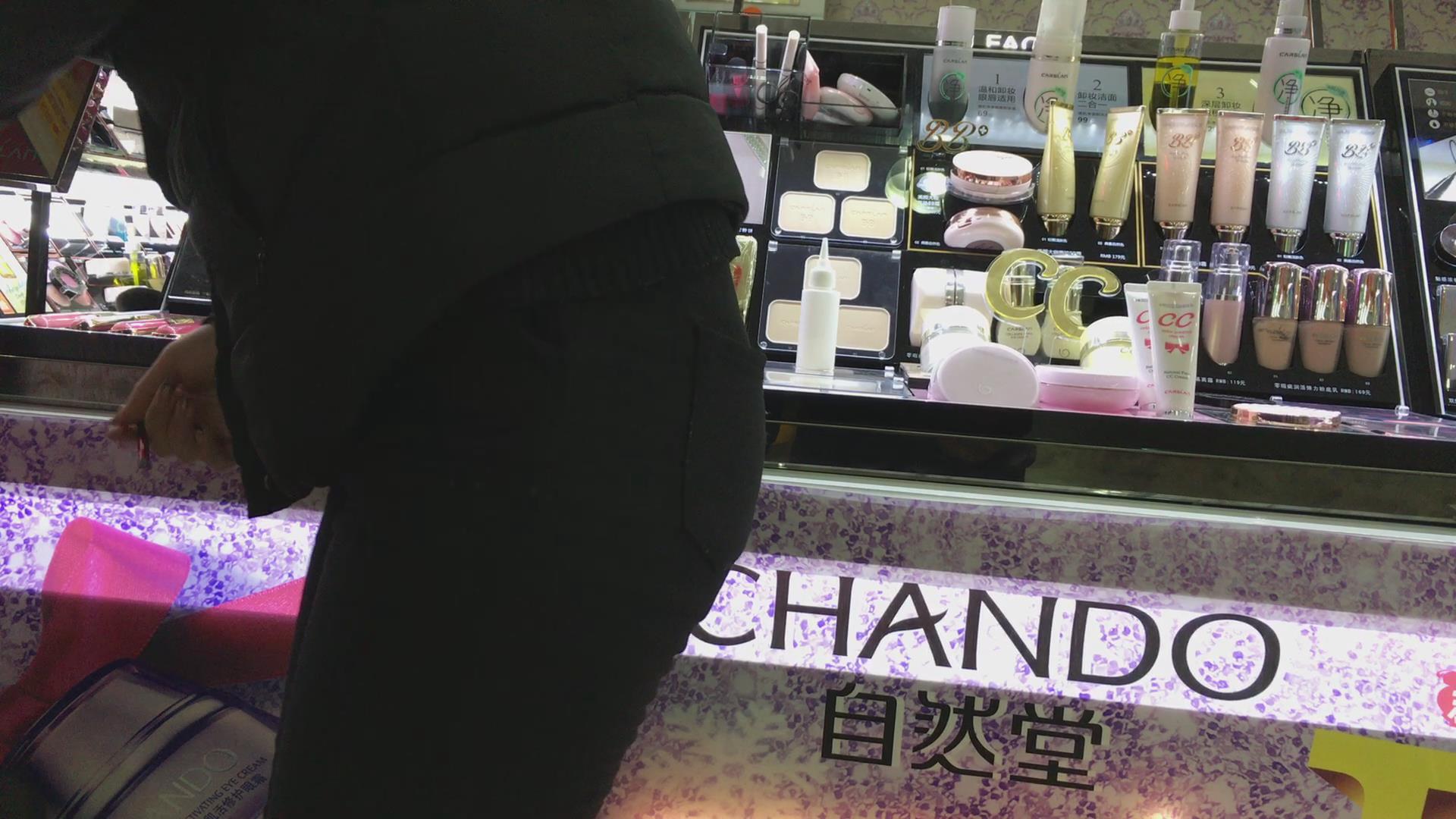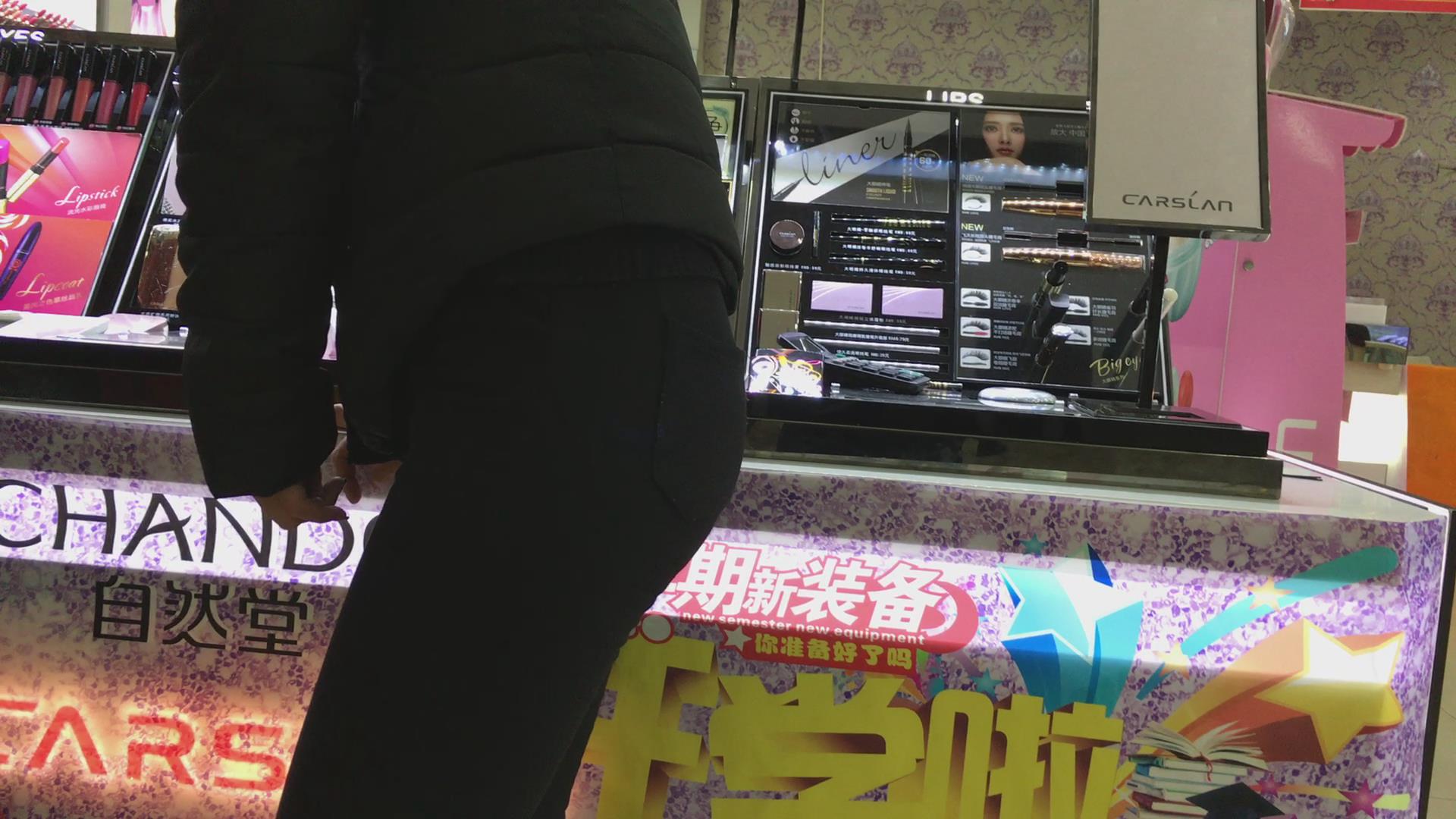 黑色紧身裤小妹在挑选化妆品,可惜光线不是太好 编号5729