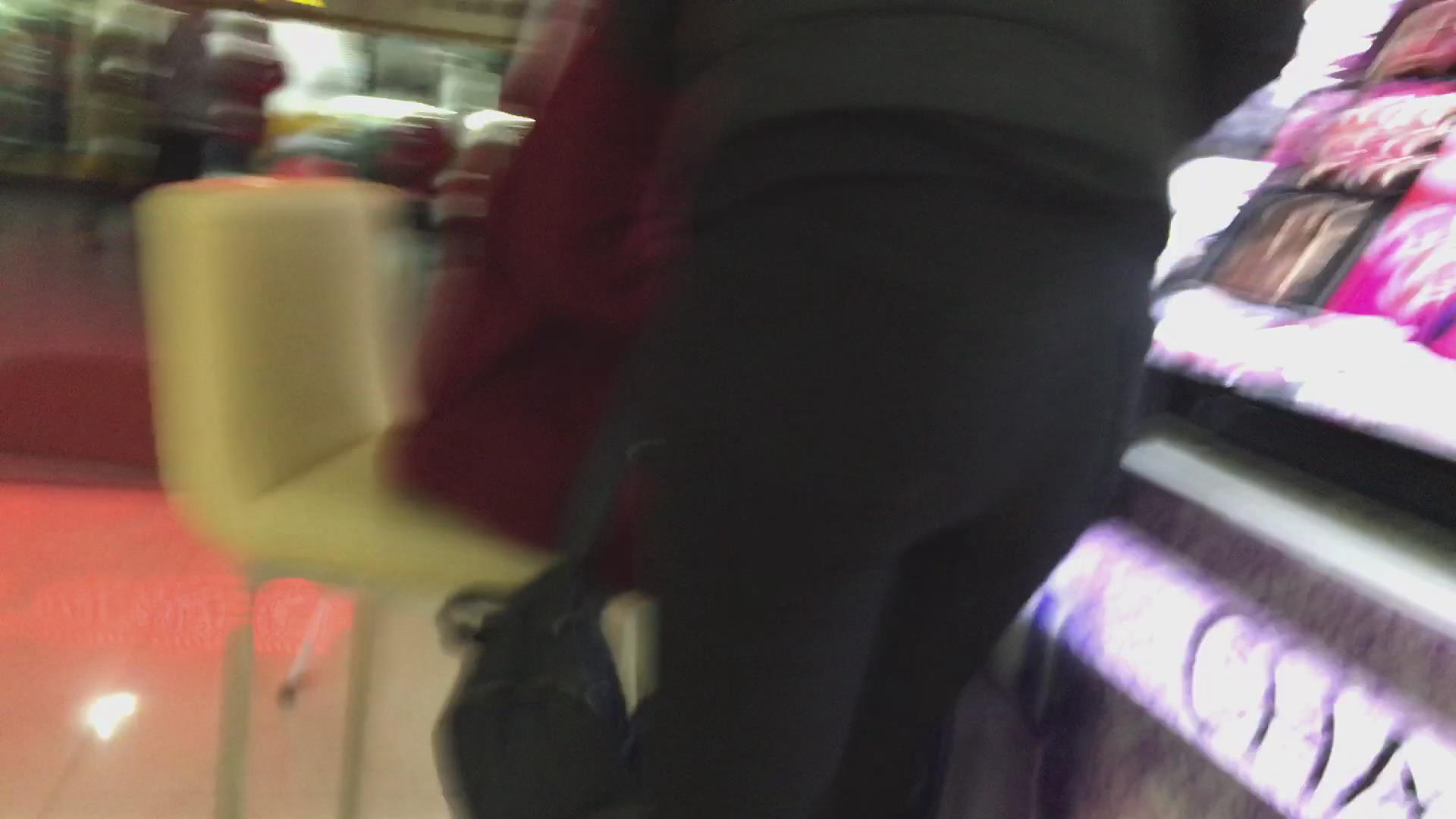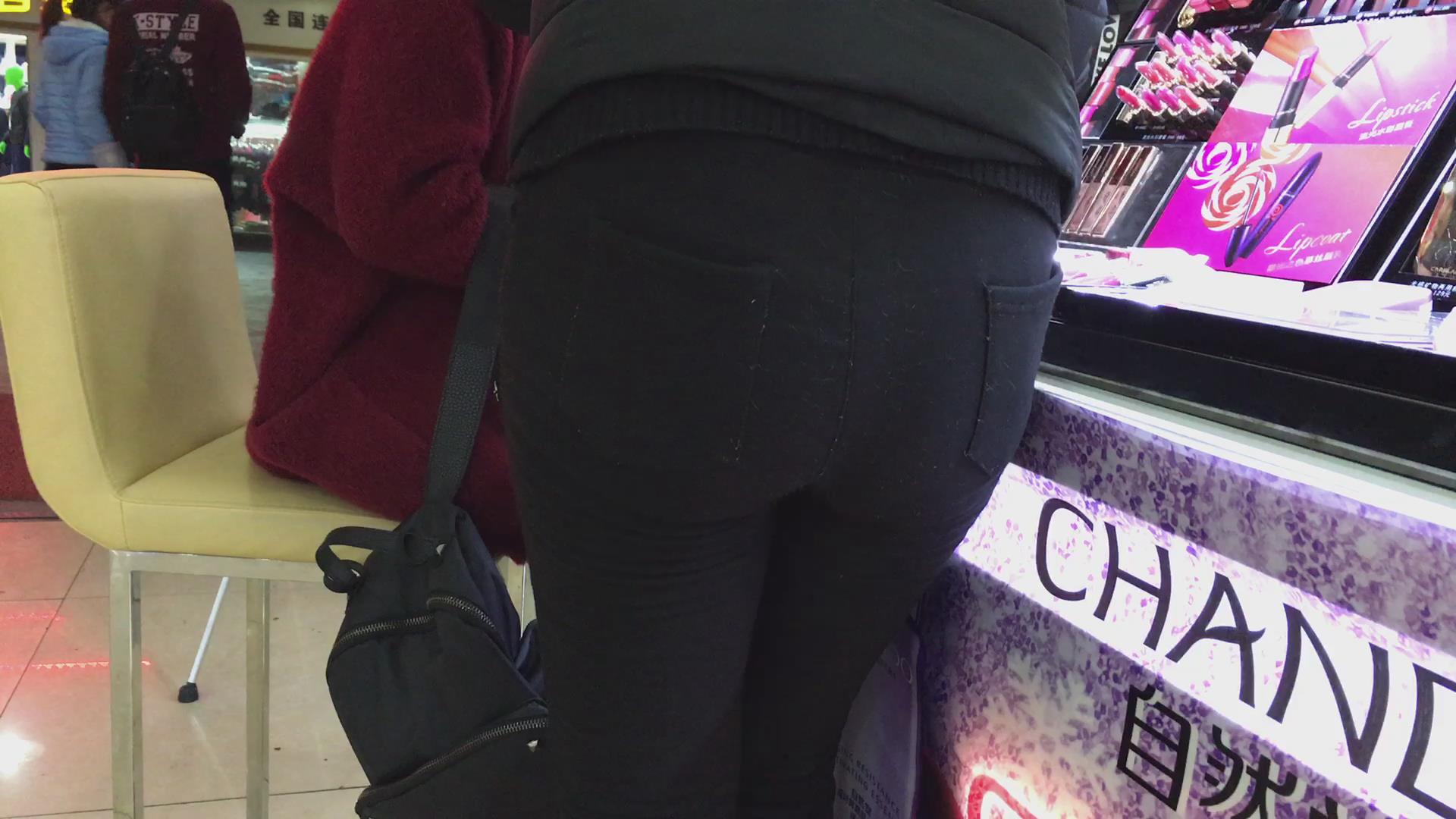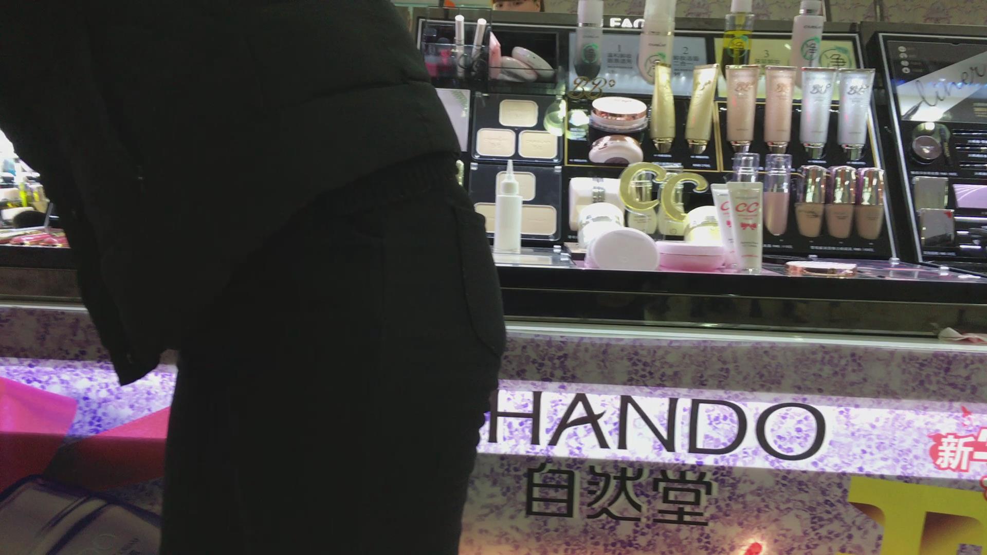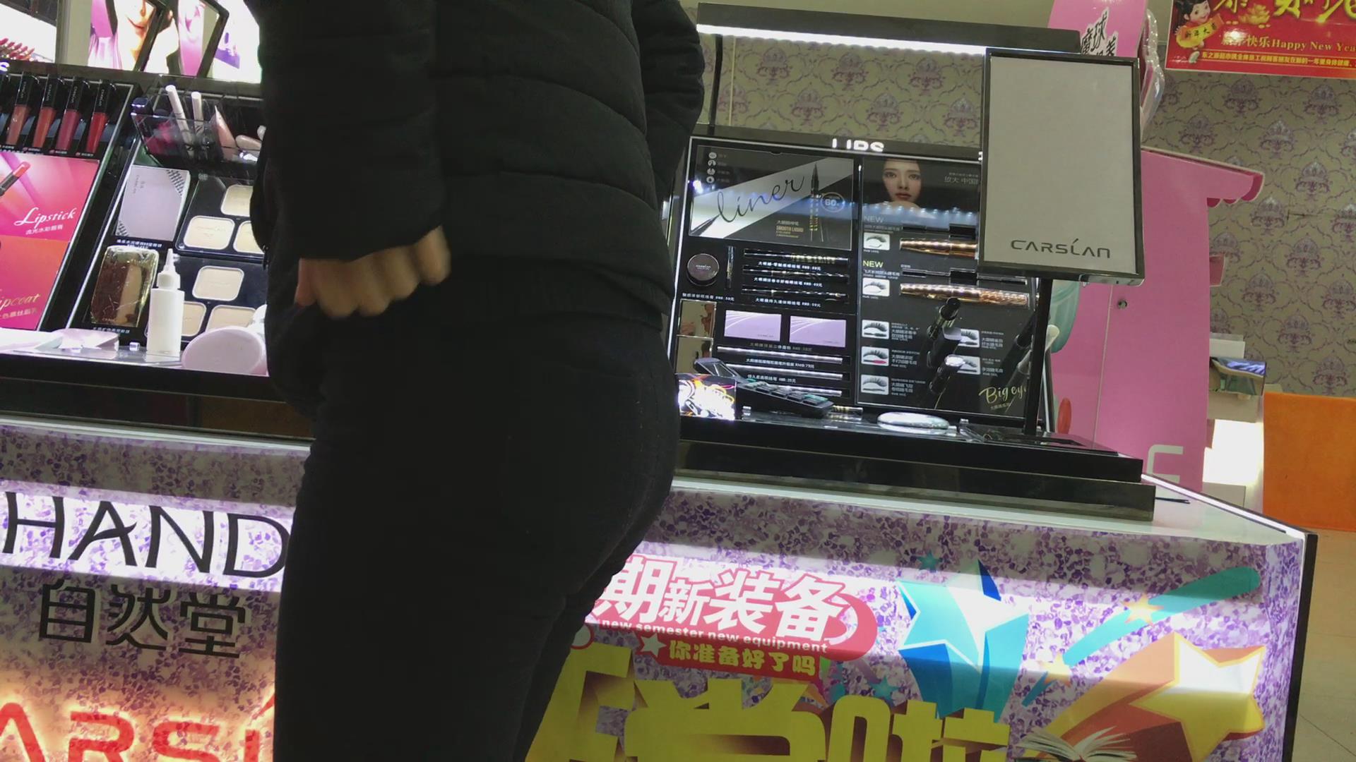 黑色紧身裤小妹在挑选化妆品,可惜光线不是太好 编号5729