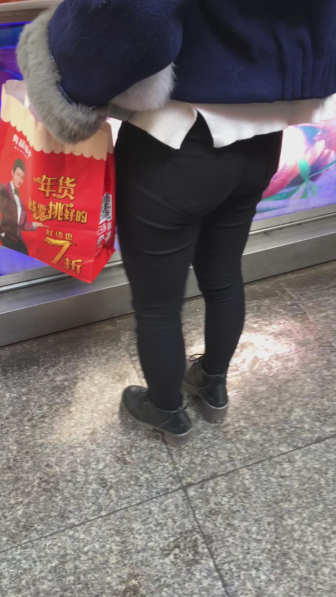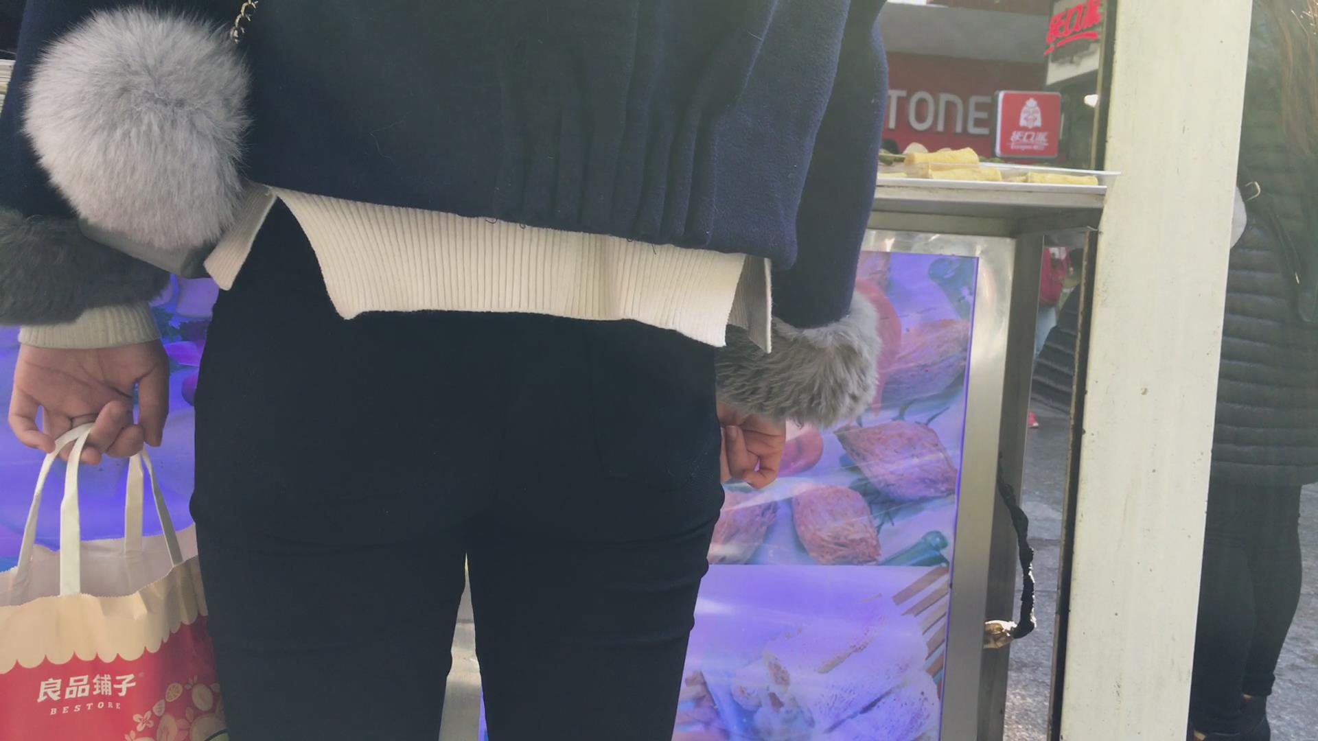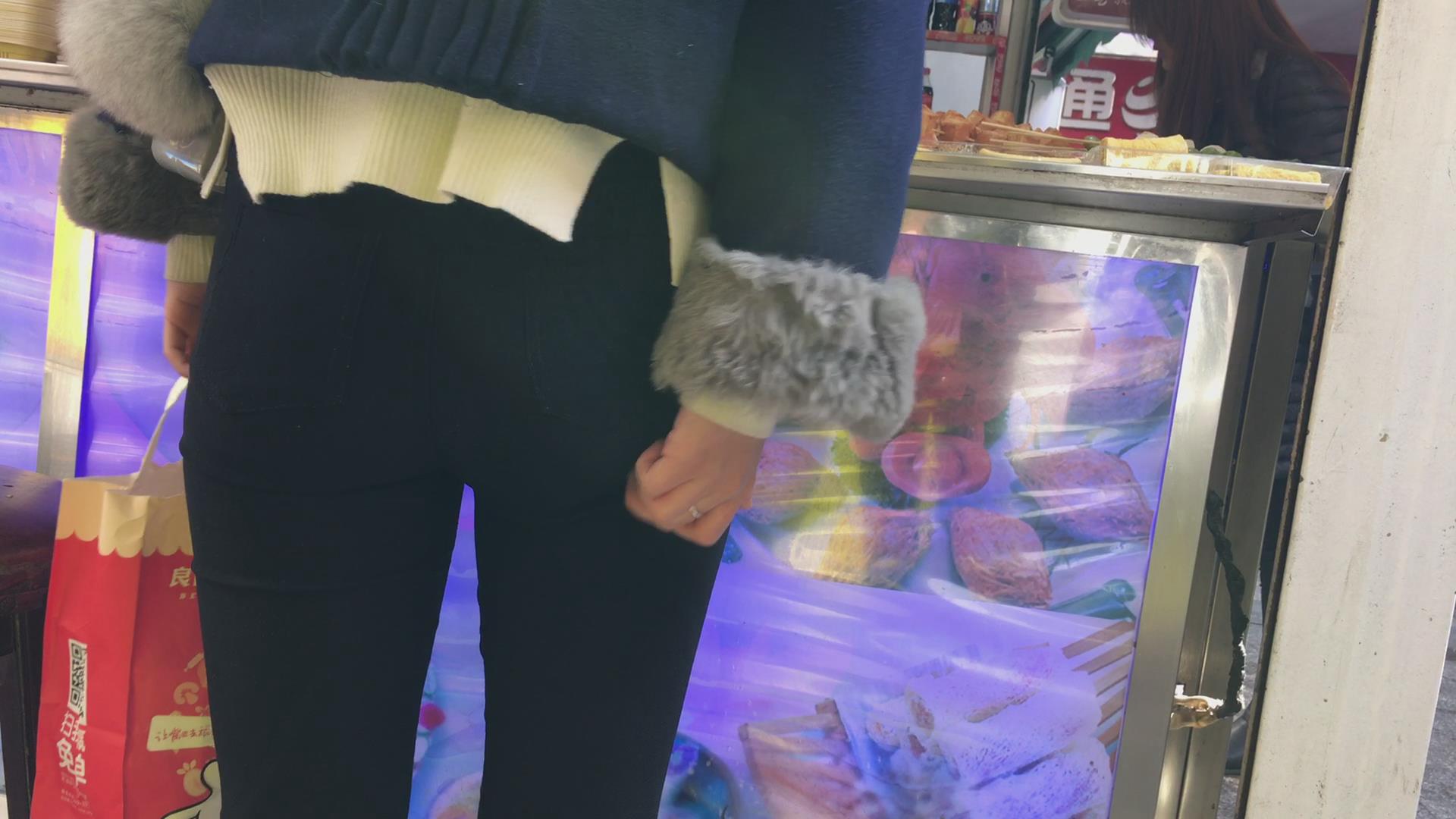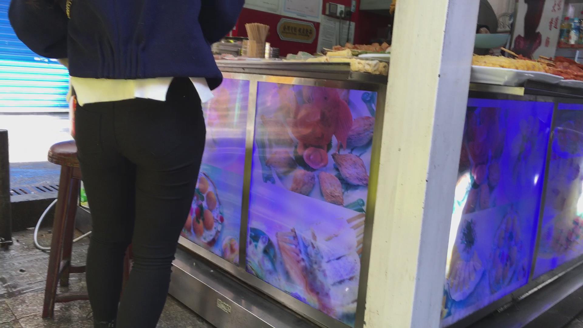 圆臀紧身黑裤小美女买鸡排 编号5730