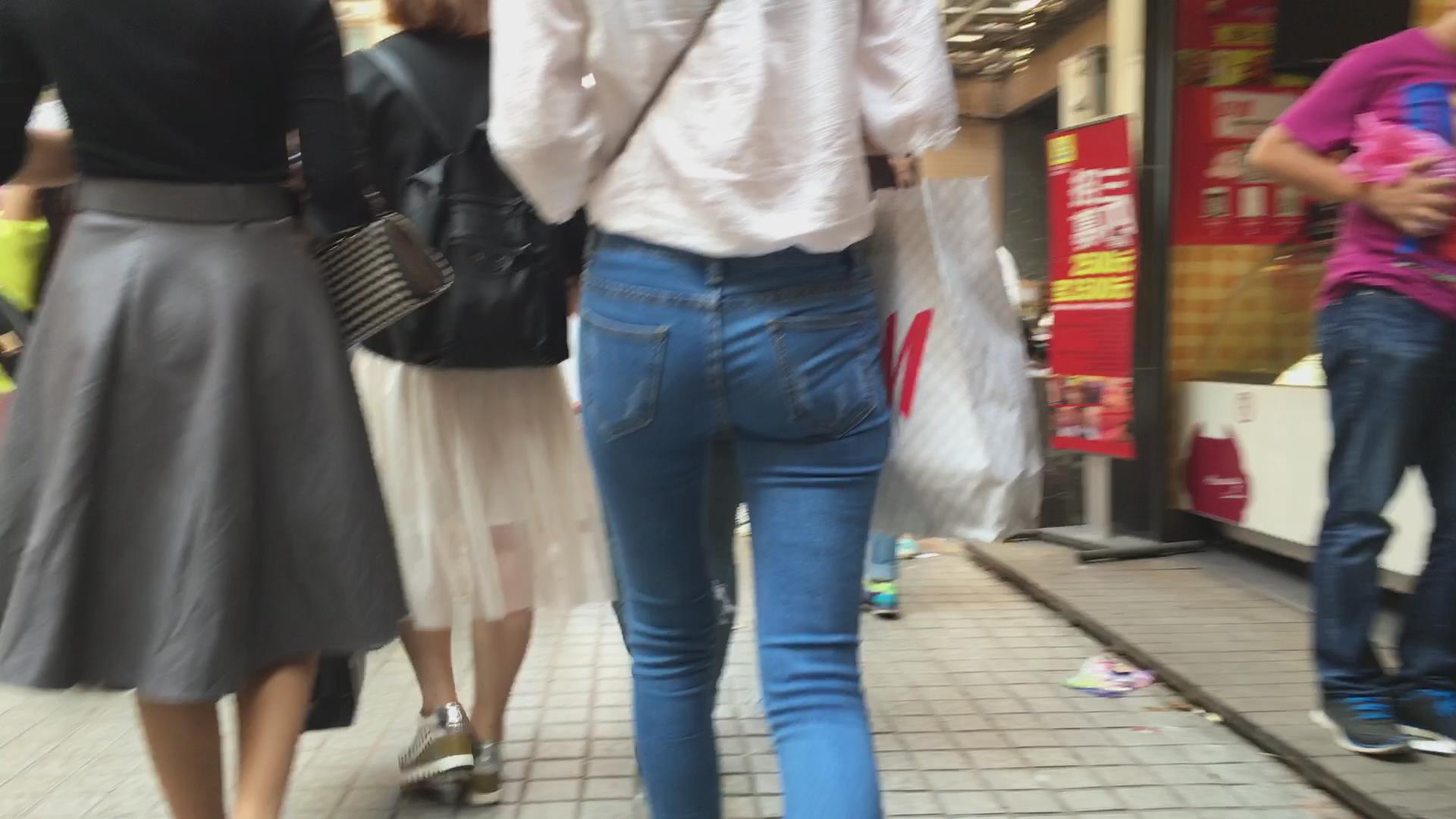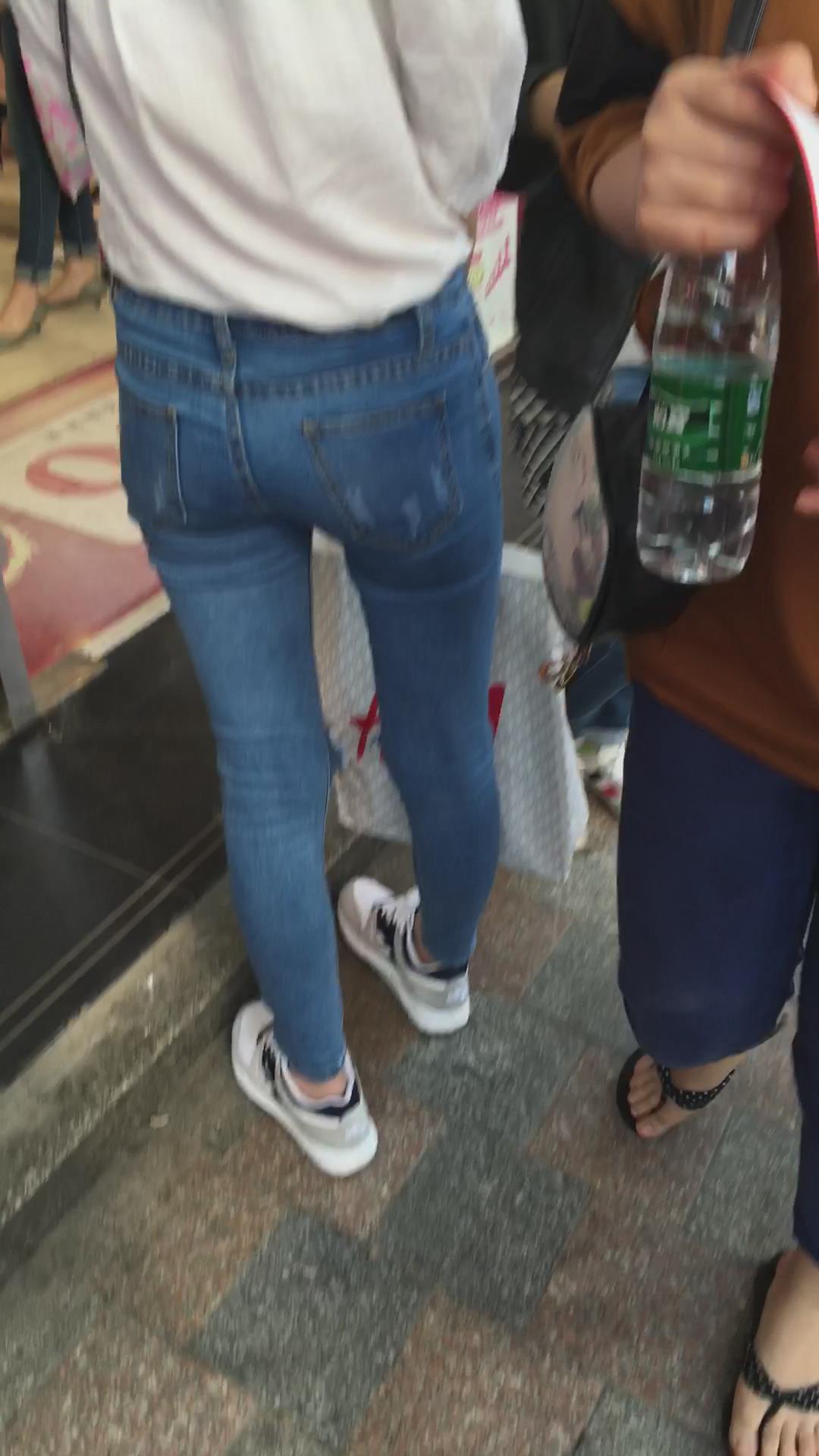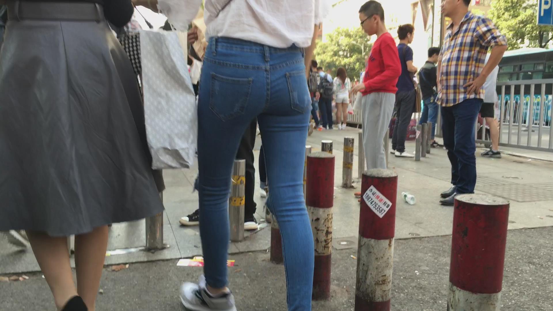 苗条的紧身宽臀牛仔小美女,微透视白衬衫 编号5776