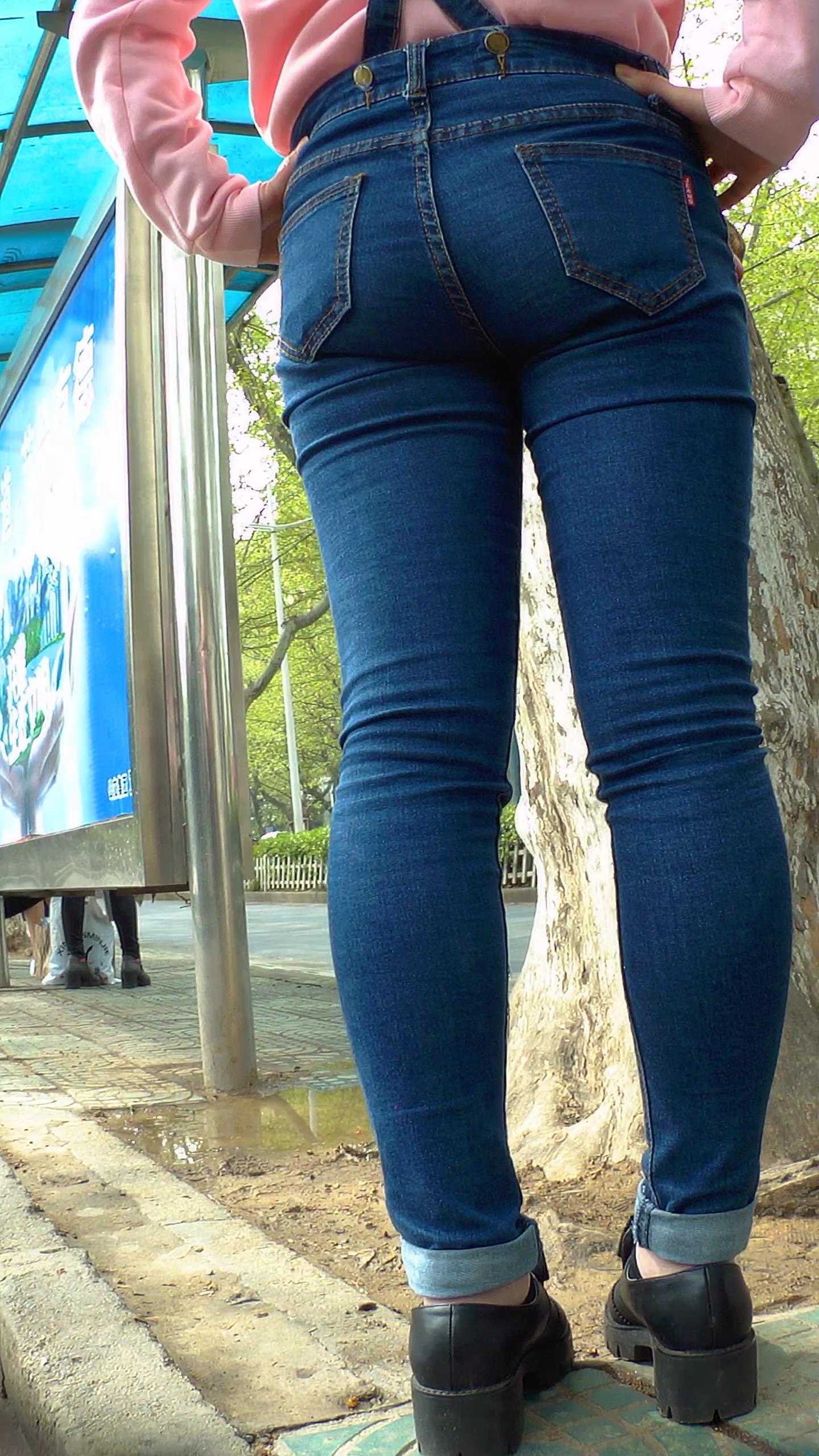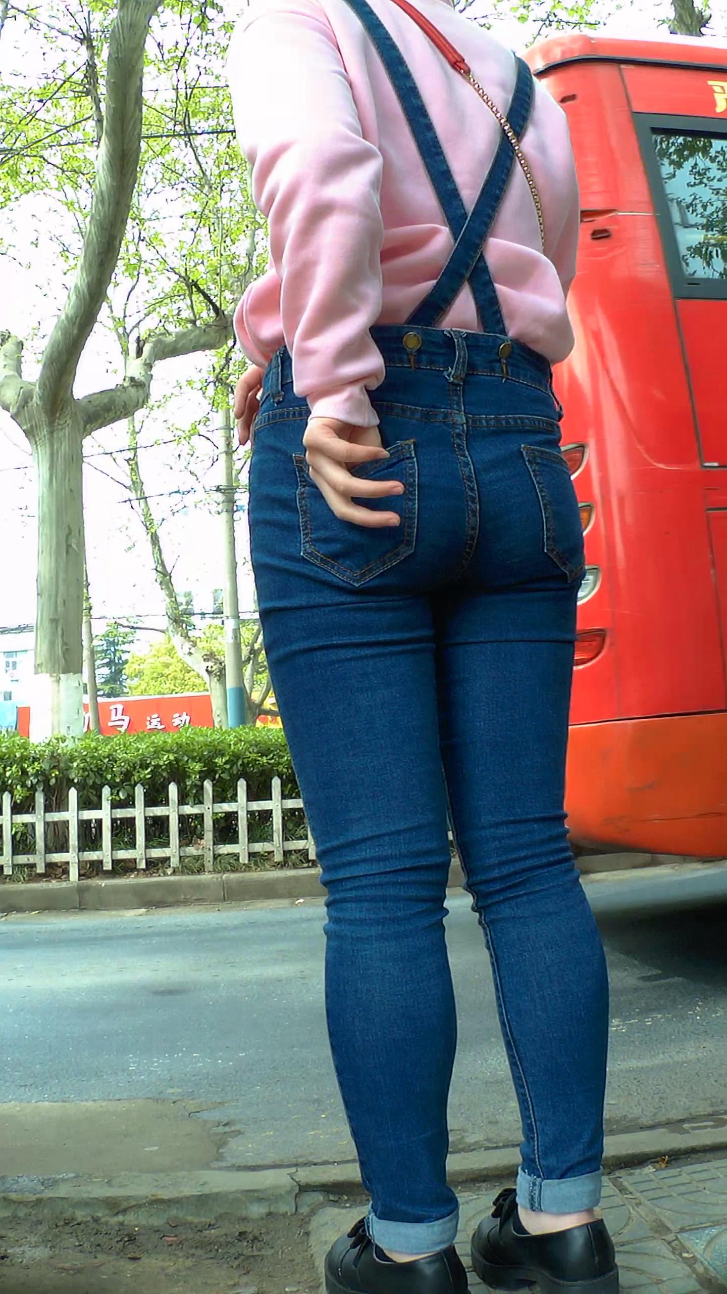街拍等车的粉衣紧身背带蓝牛翘臀小妹 编号5828