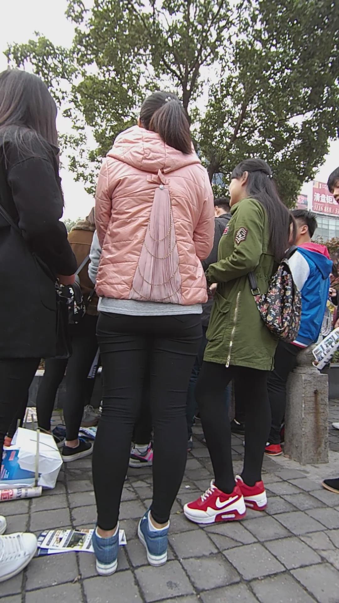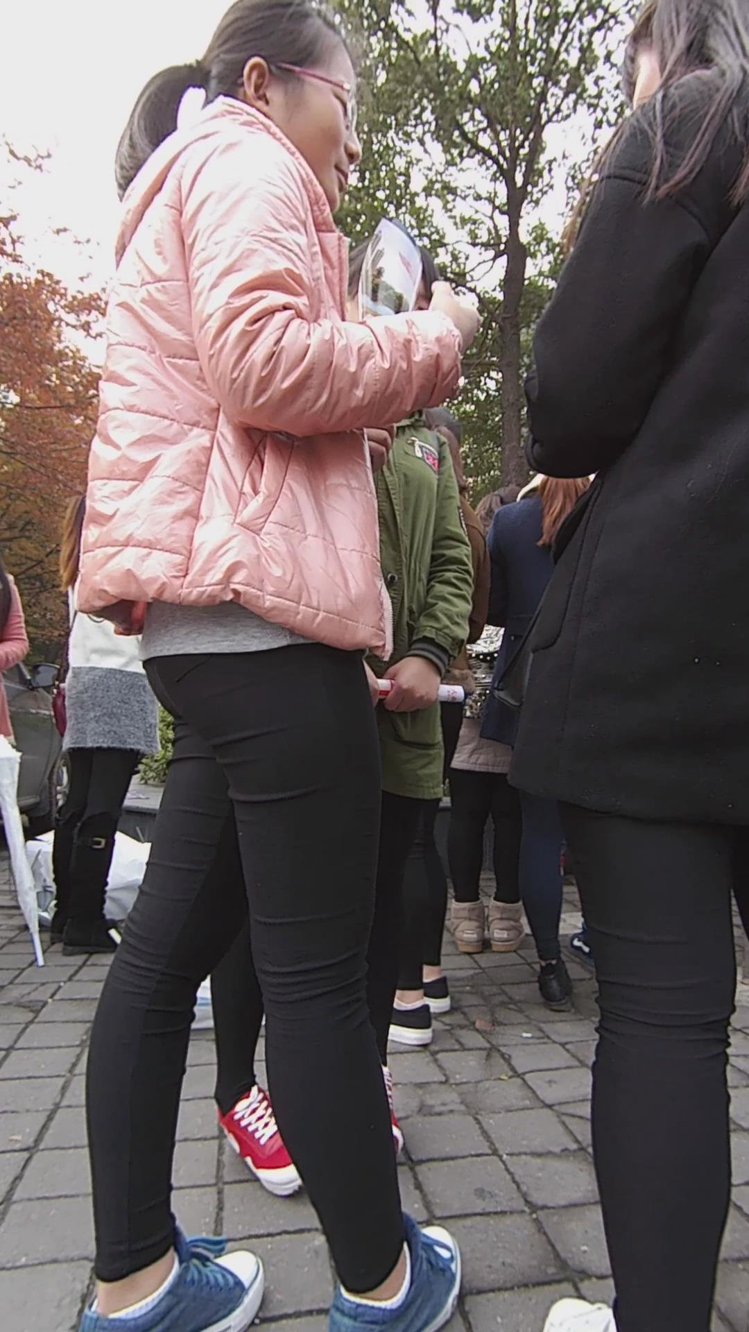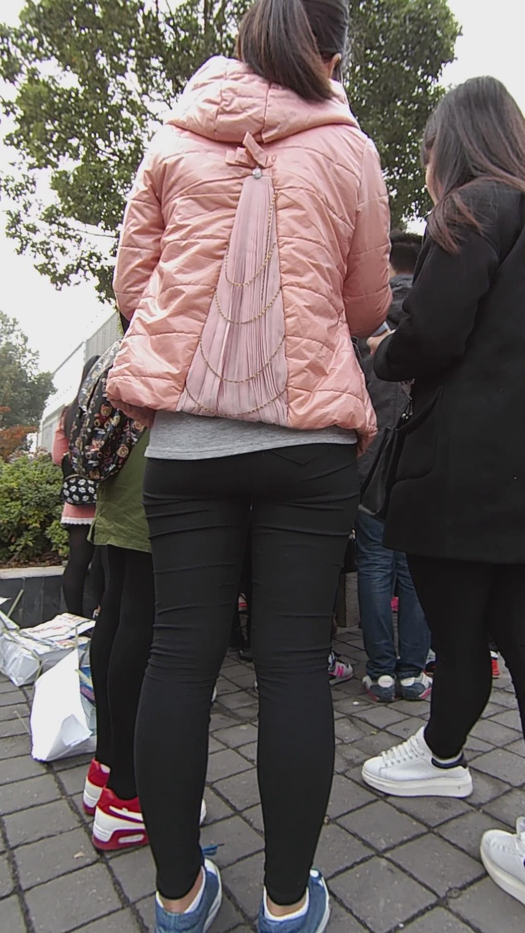 街拍路口发传单的紧身黑裤粉外套女孩 编号5830