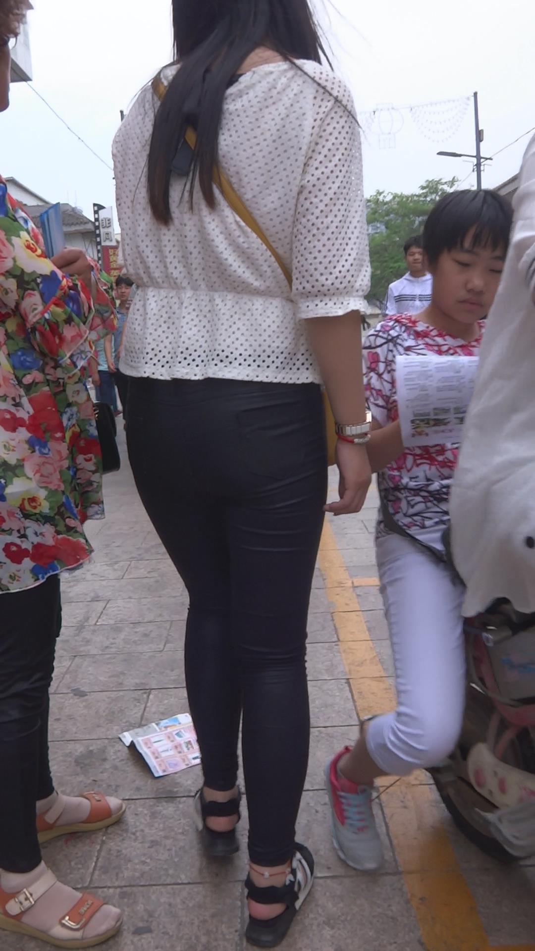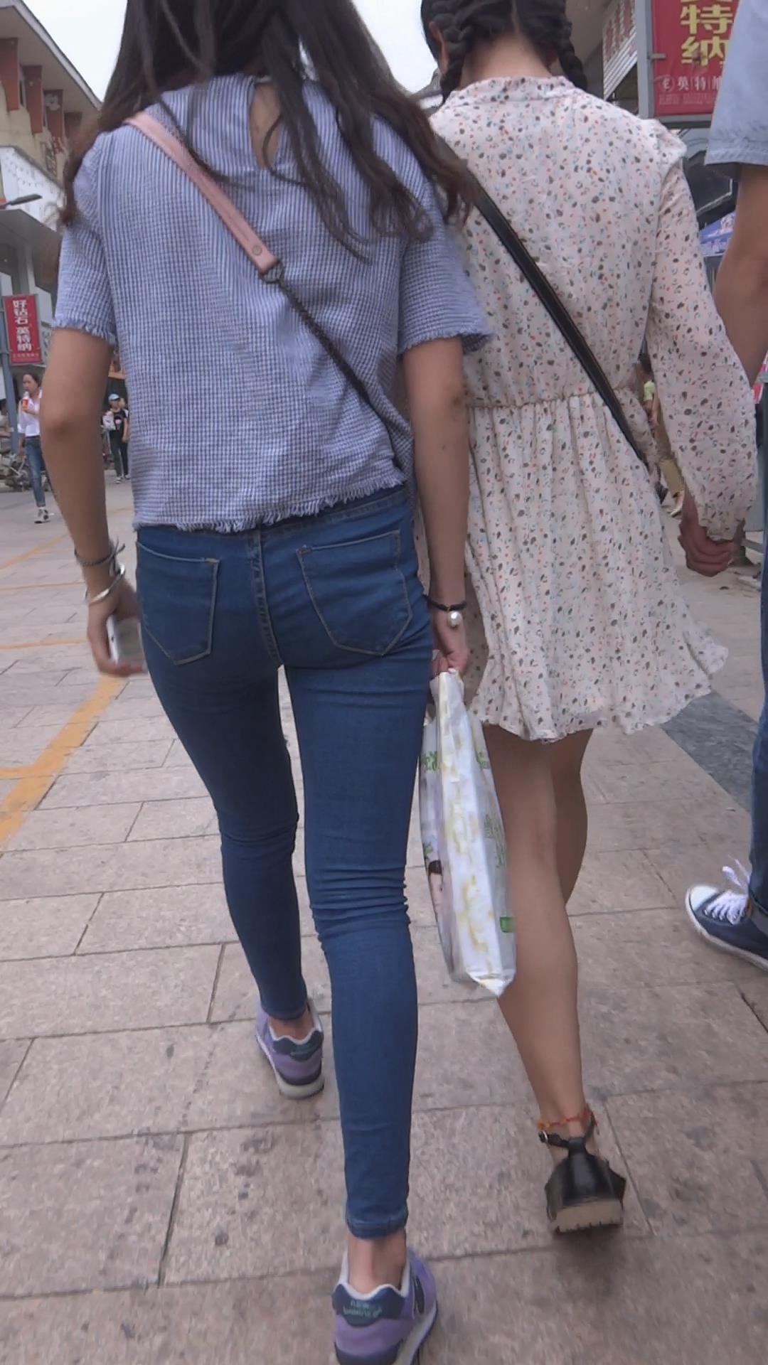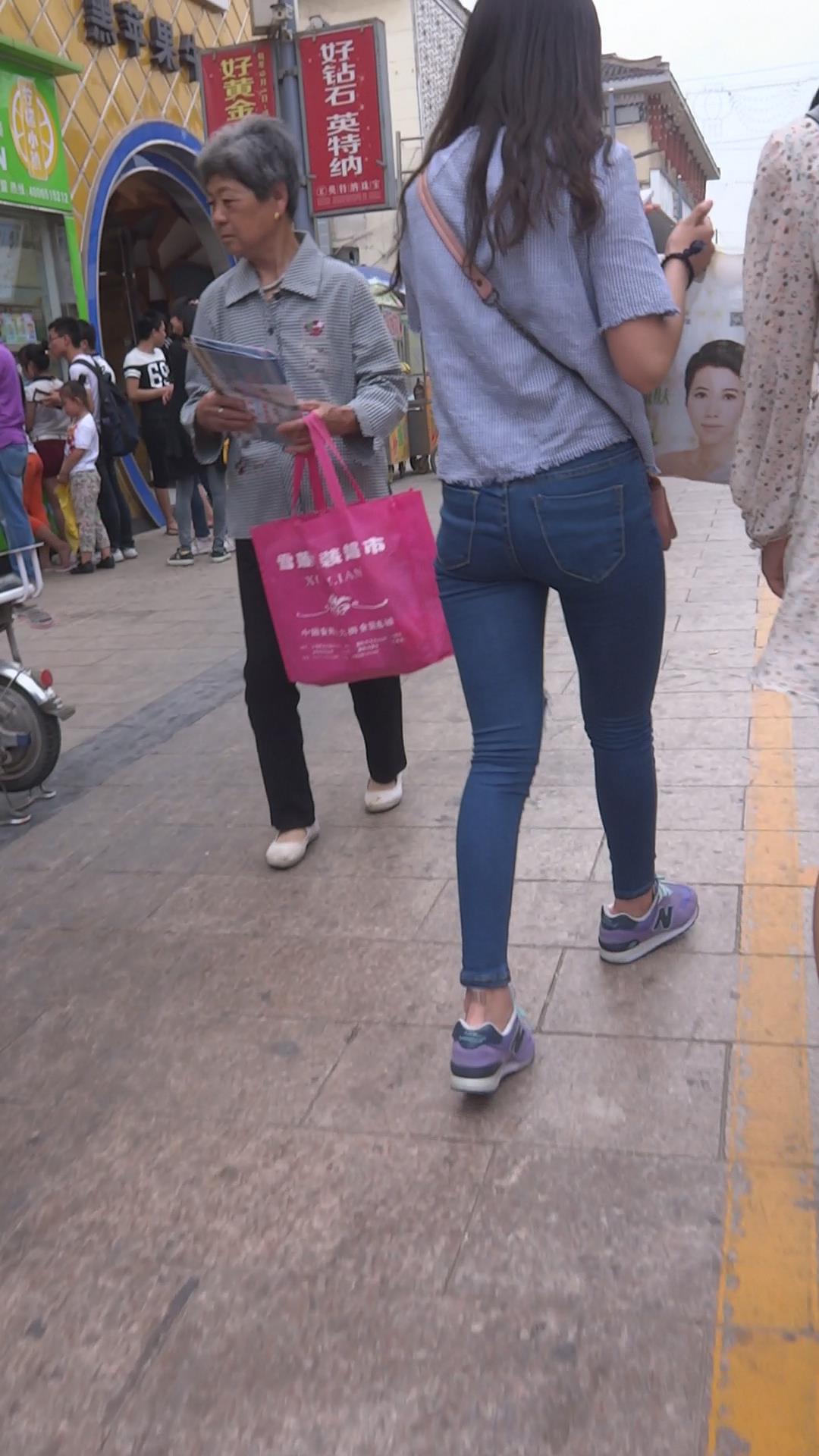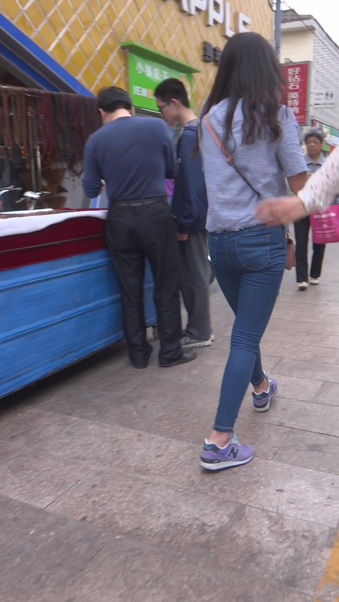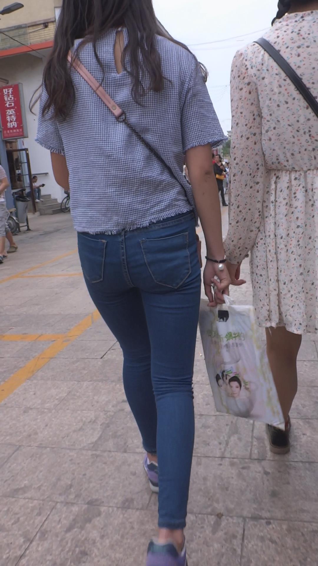 街拍紧身蓝色牛仔裤清秀美眉 编号5906