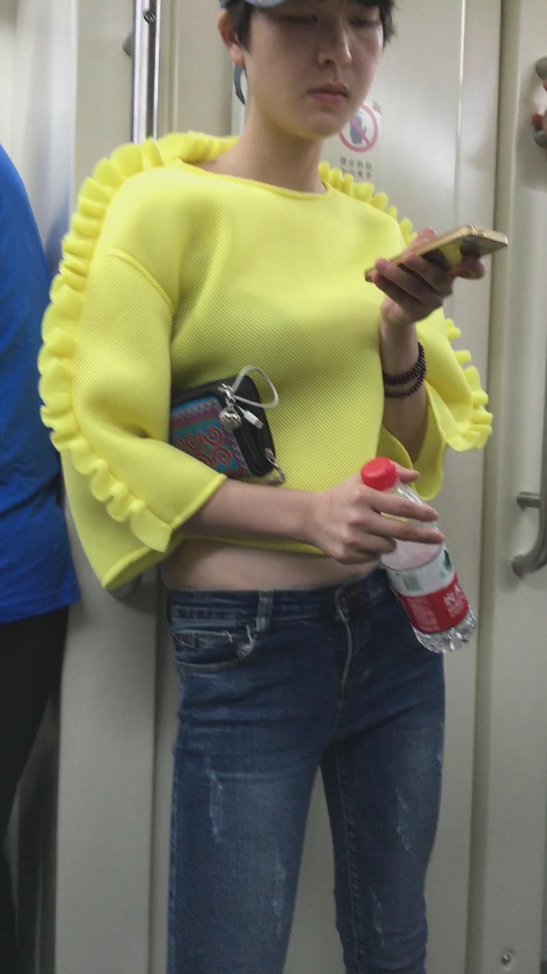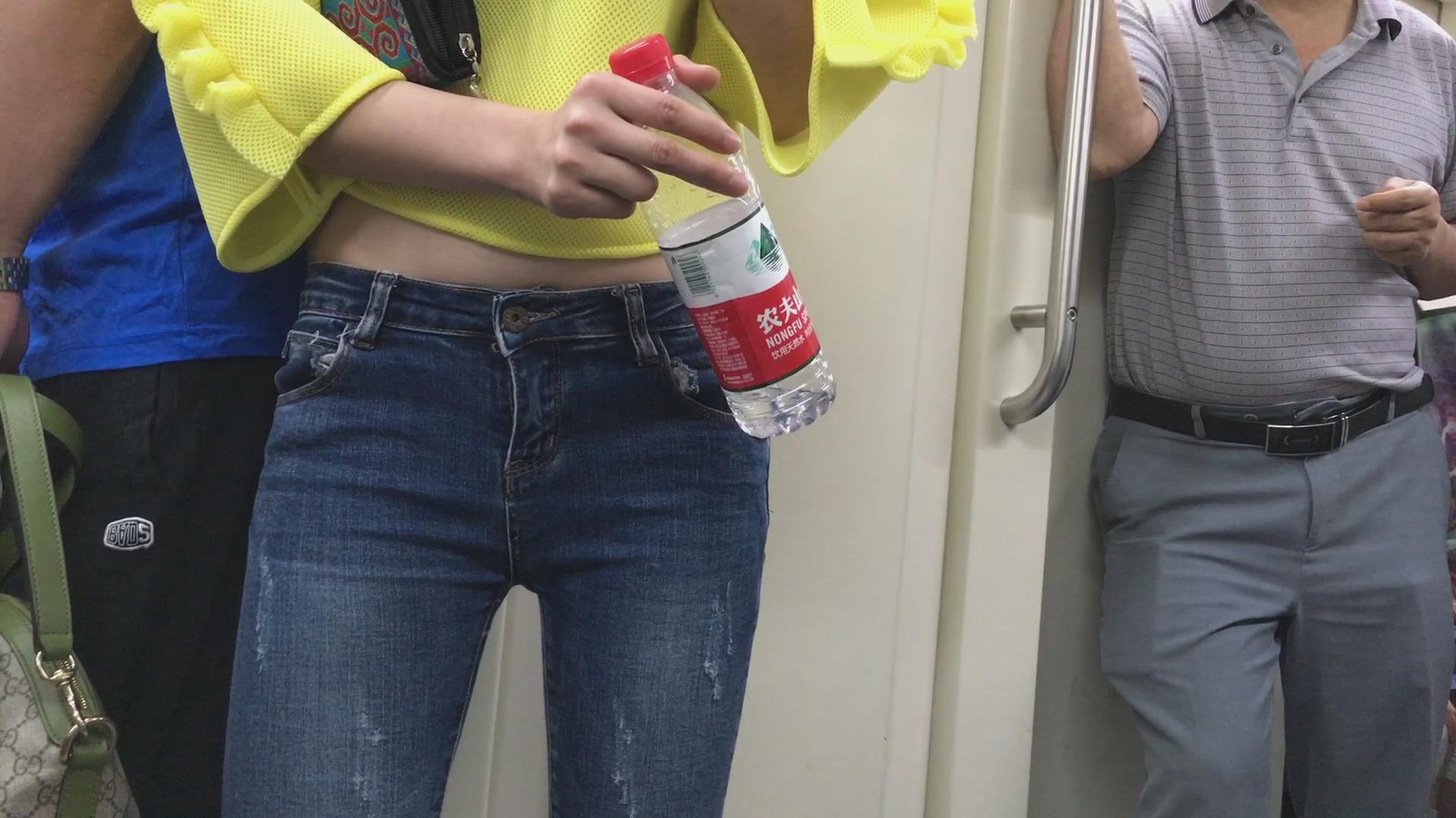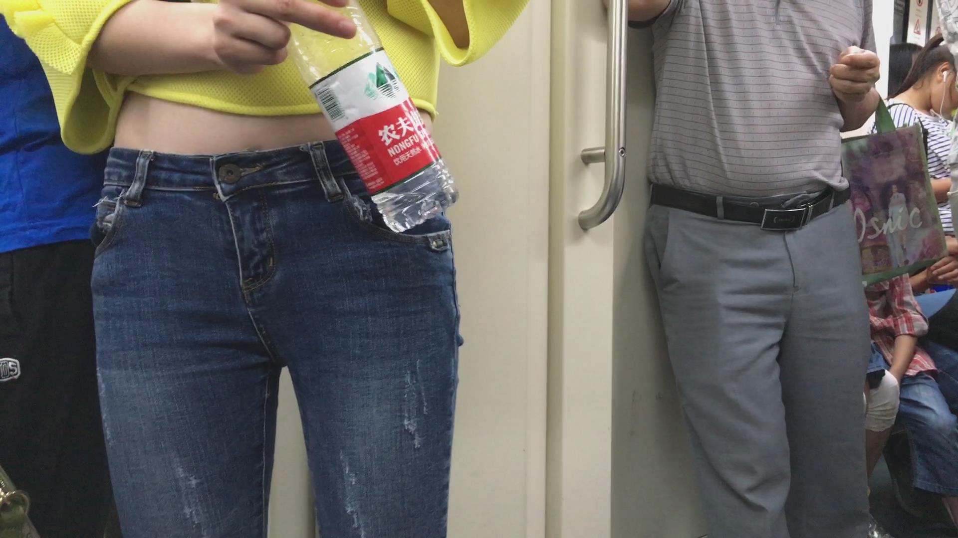 地铁拍摄肉肉小肚腩的蓝牛美女。 编号5933