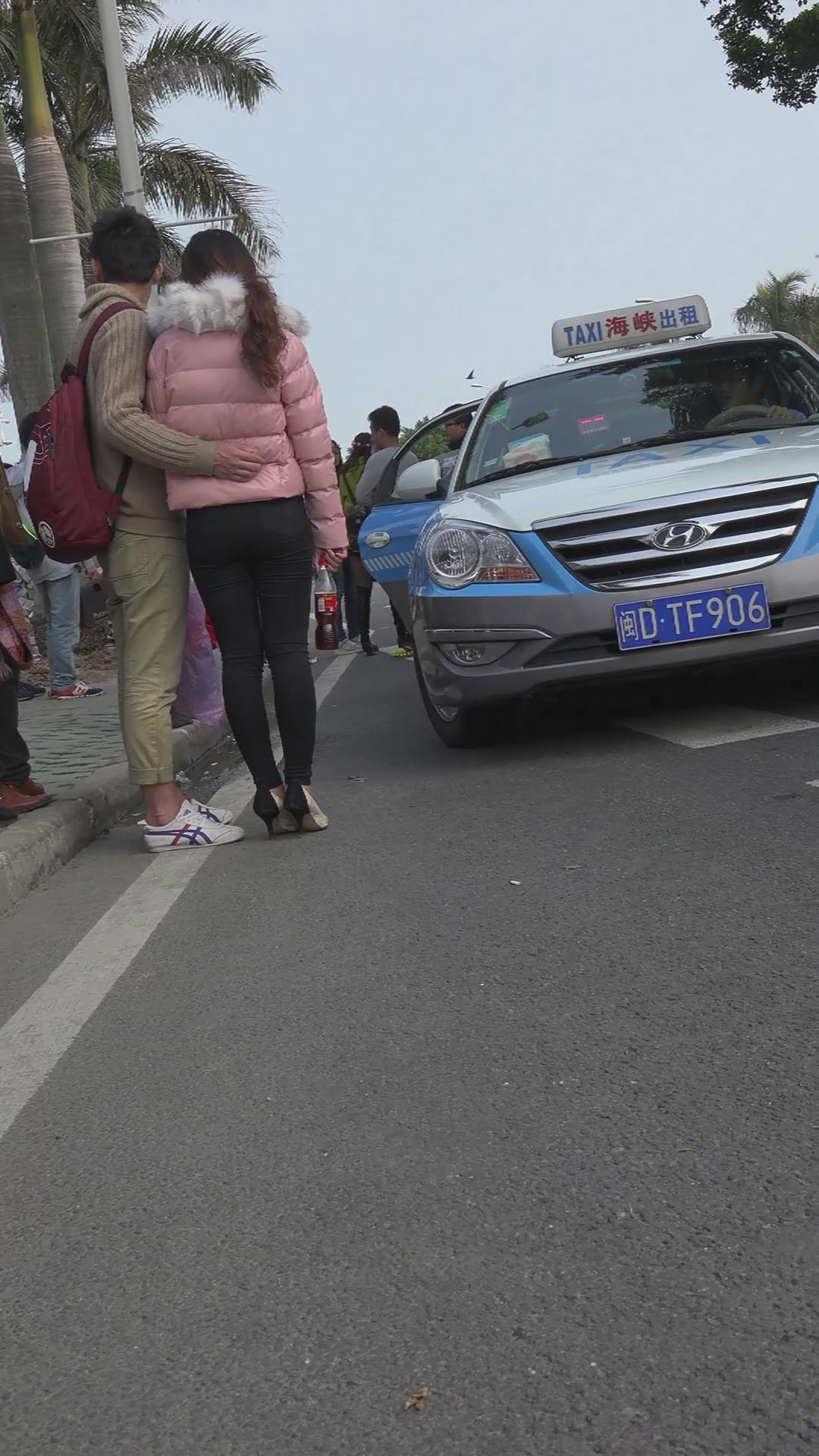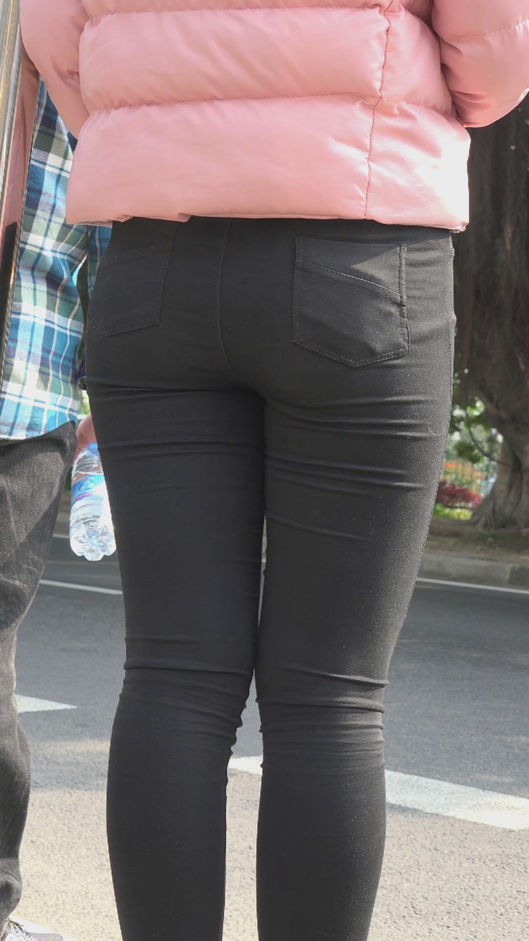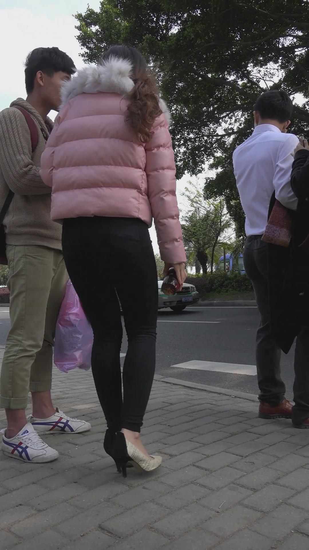 街拍粉色羽绒服紧身裤高跟鞋美女 编号5973