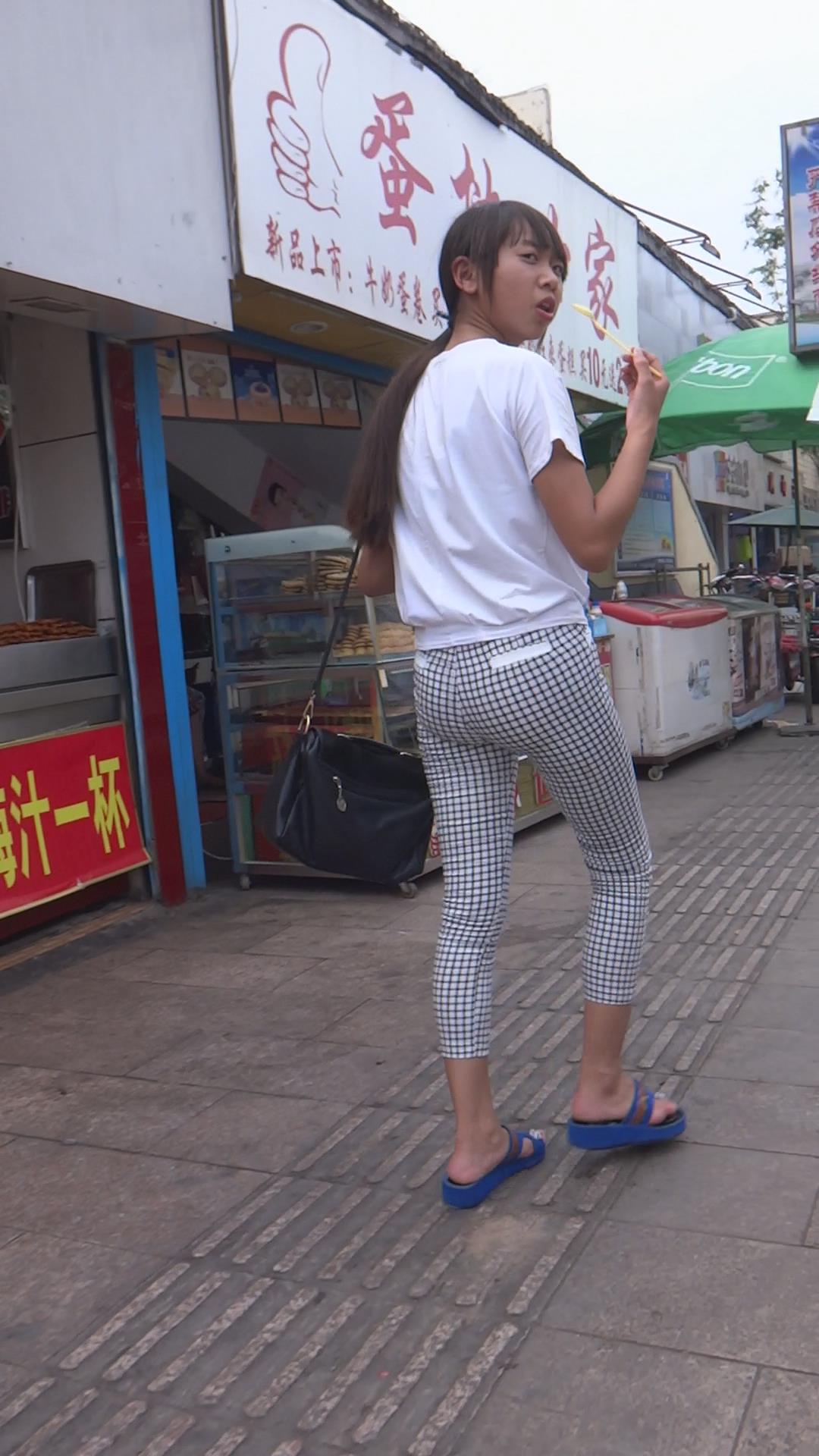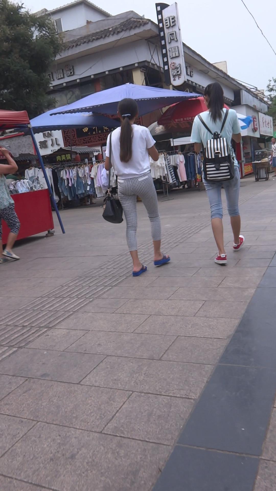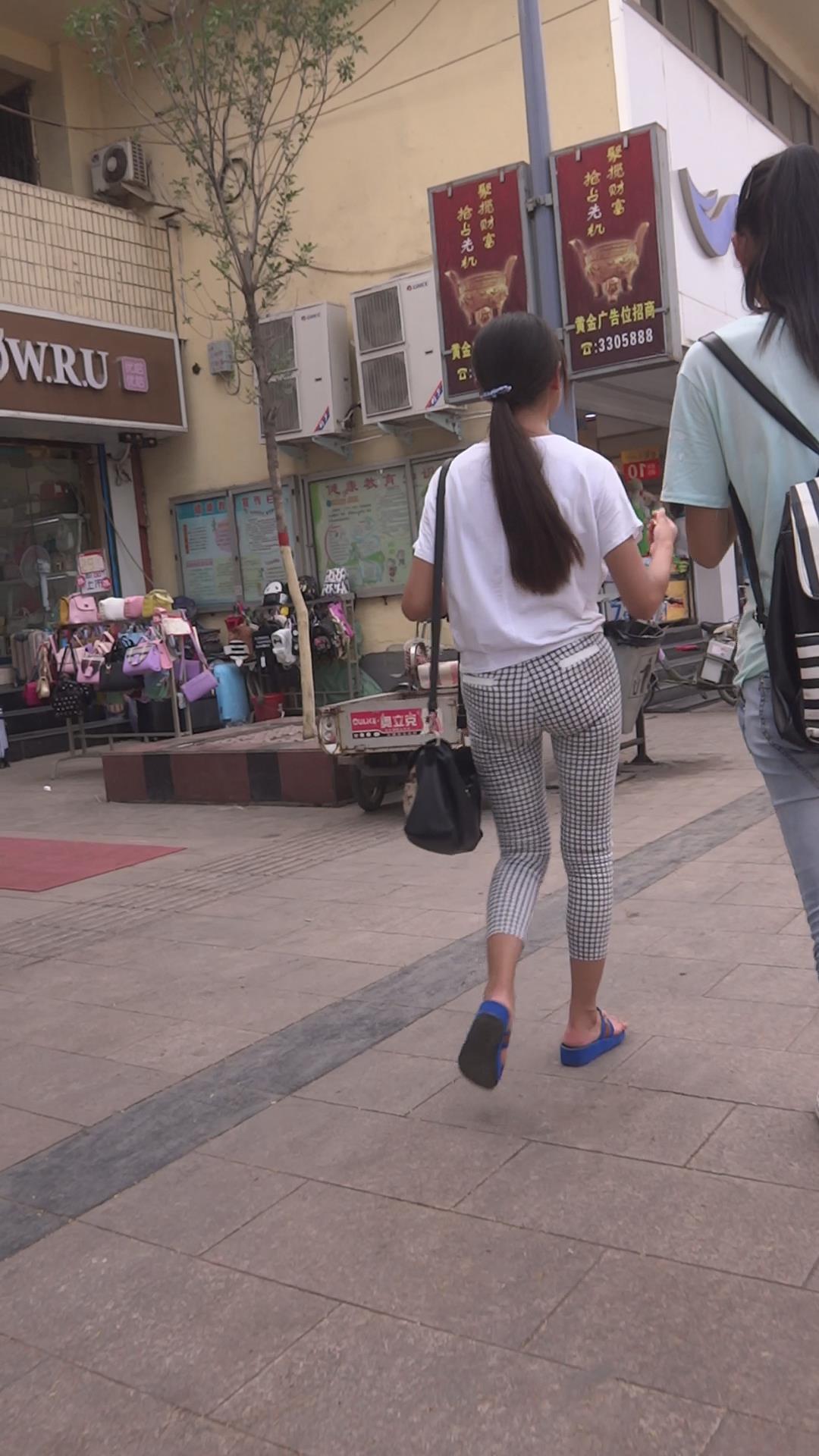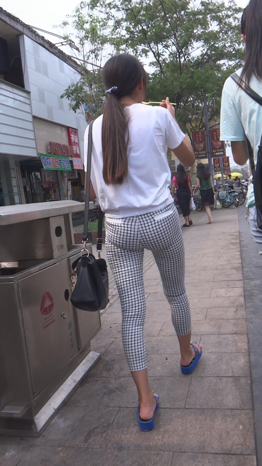 街拍的格子七分裤白T恤圆臀女孩。 编号5985