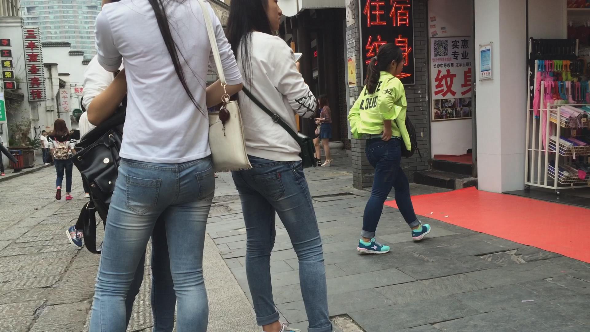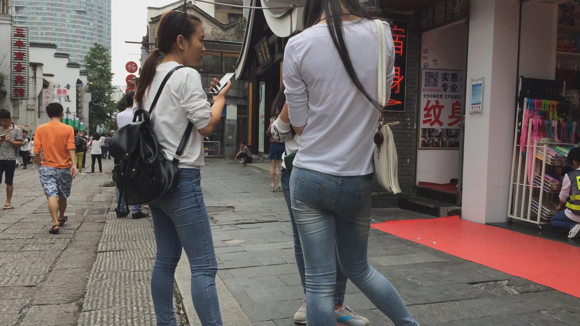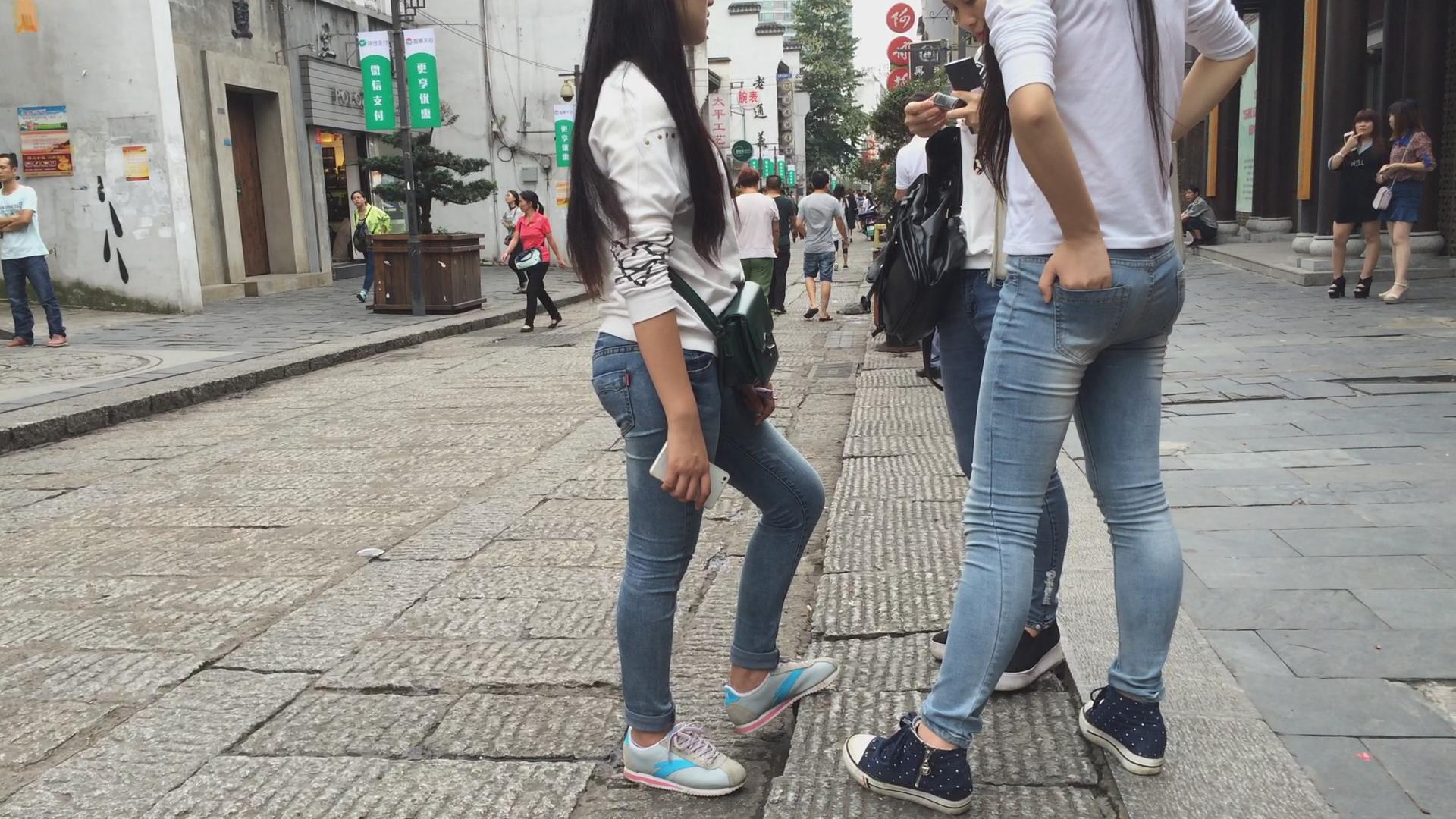 街拍三位紧身蓝色牛仔裤学生妹 编号5987