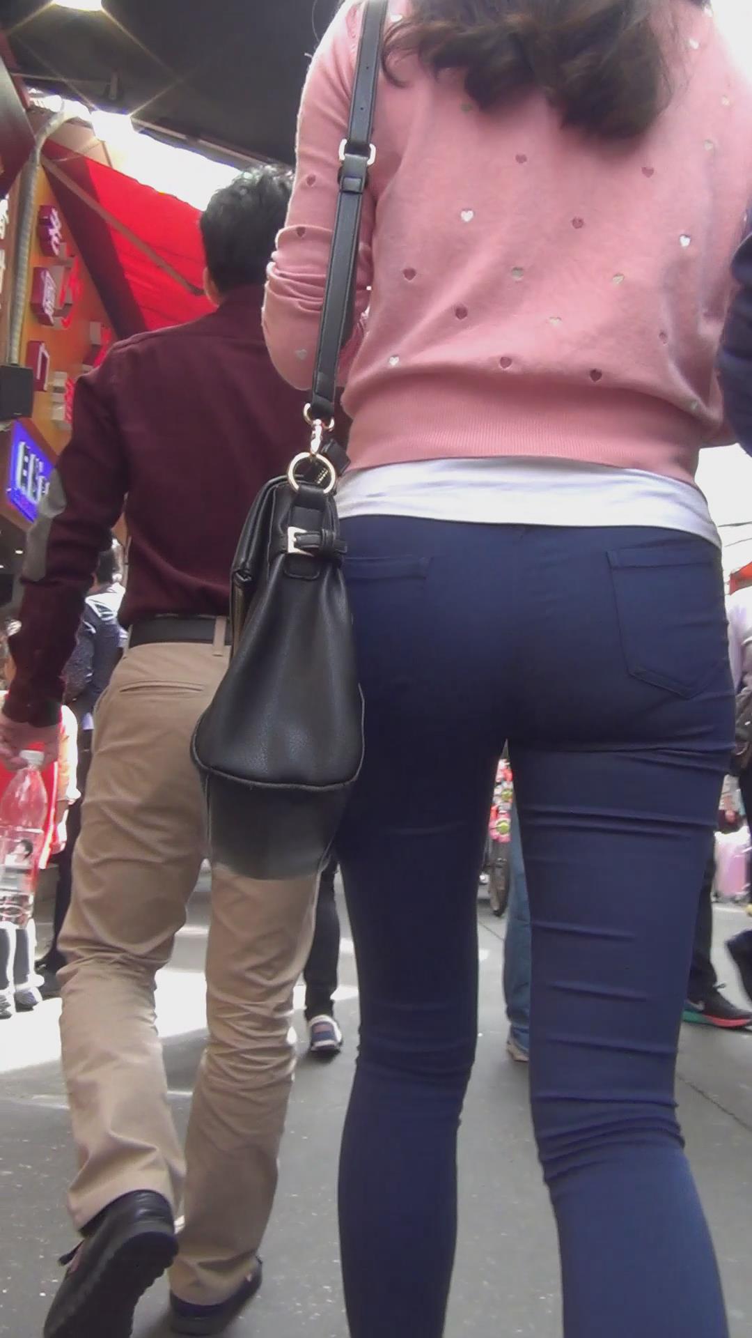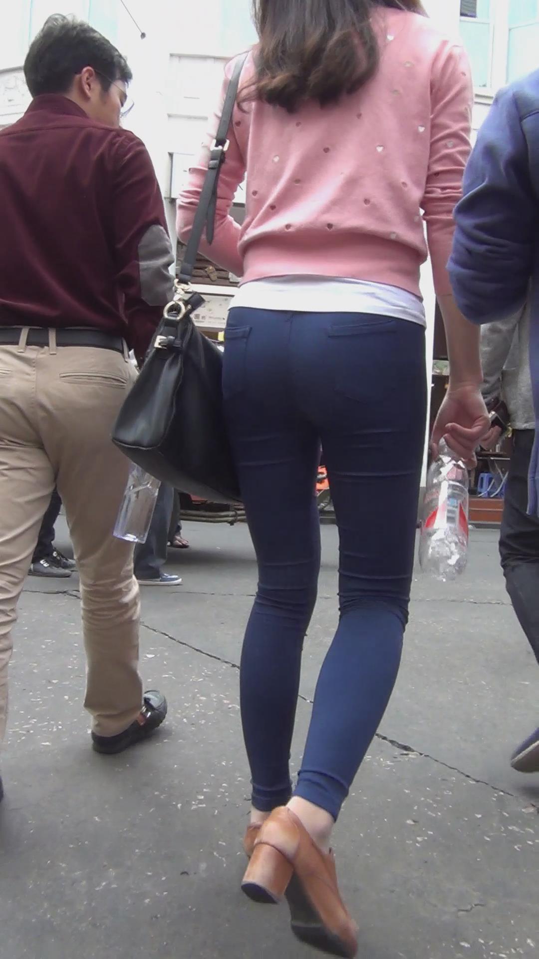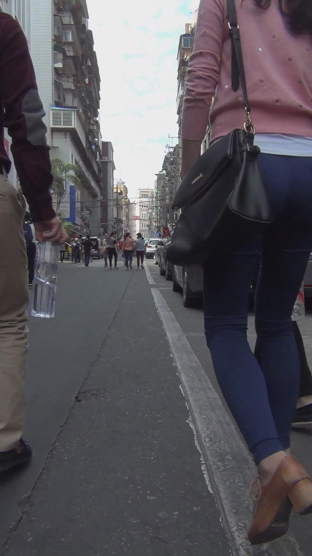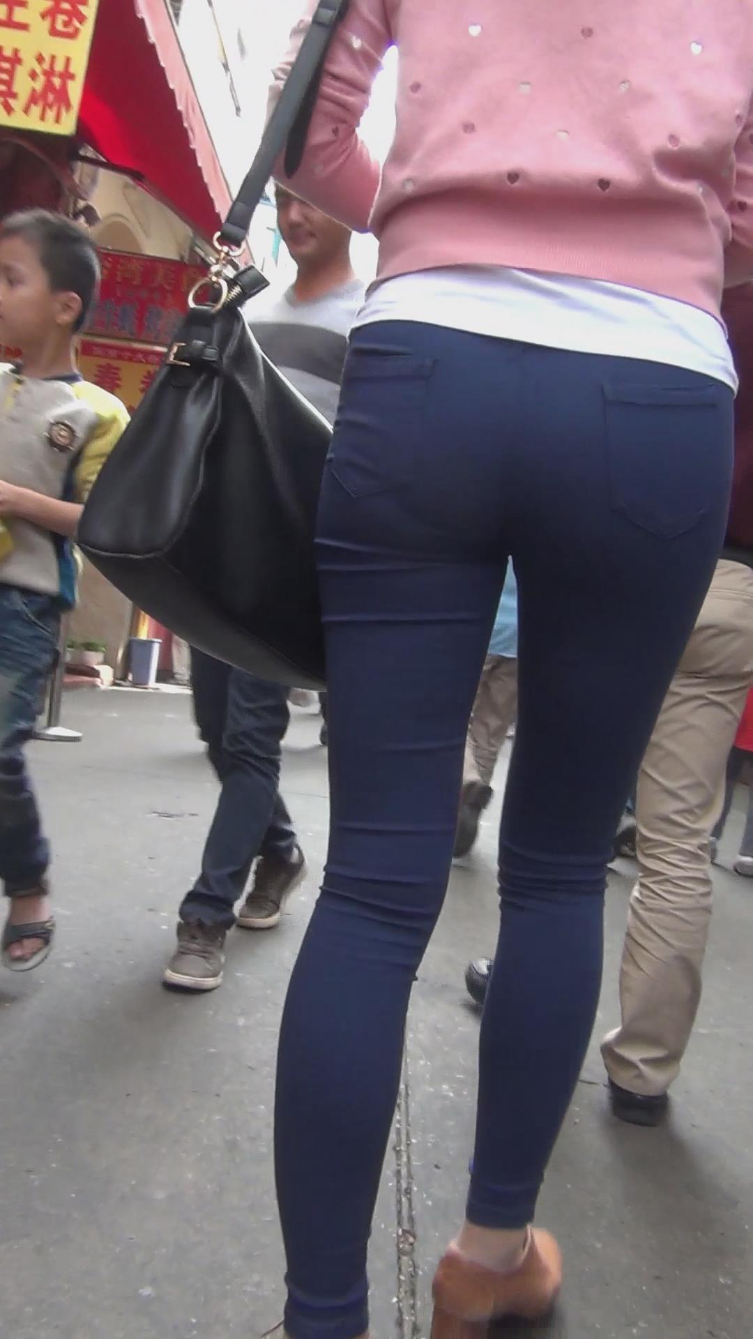 街拍蓝色紧身裤圆臀美眉 编号5989