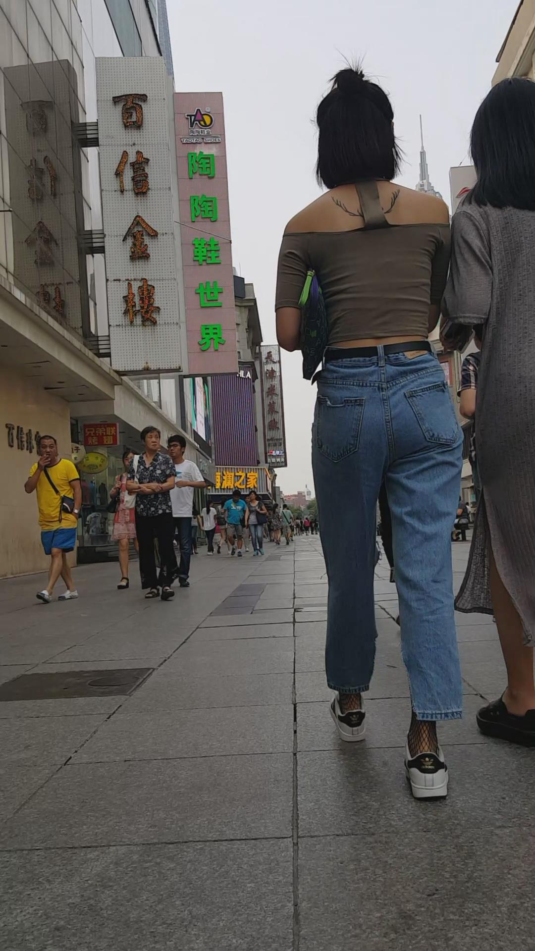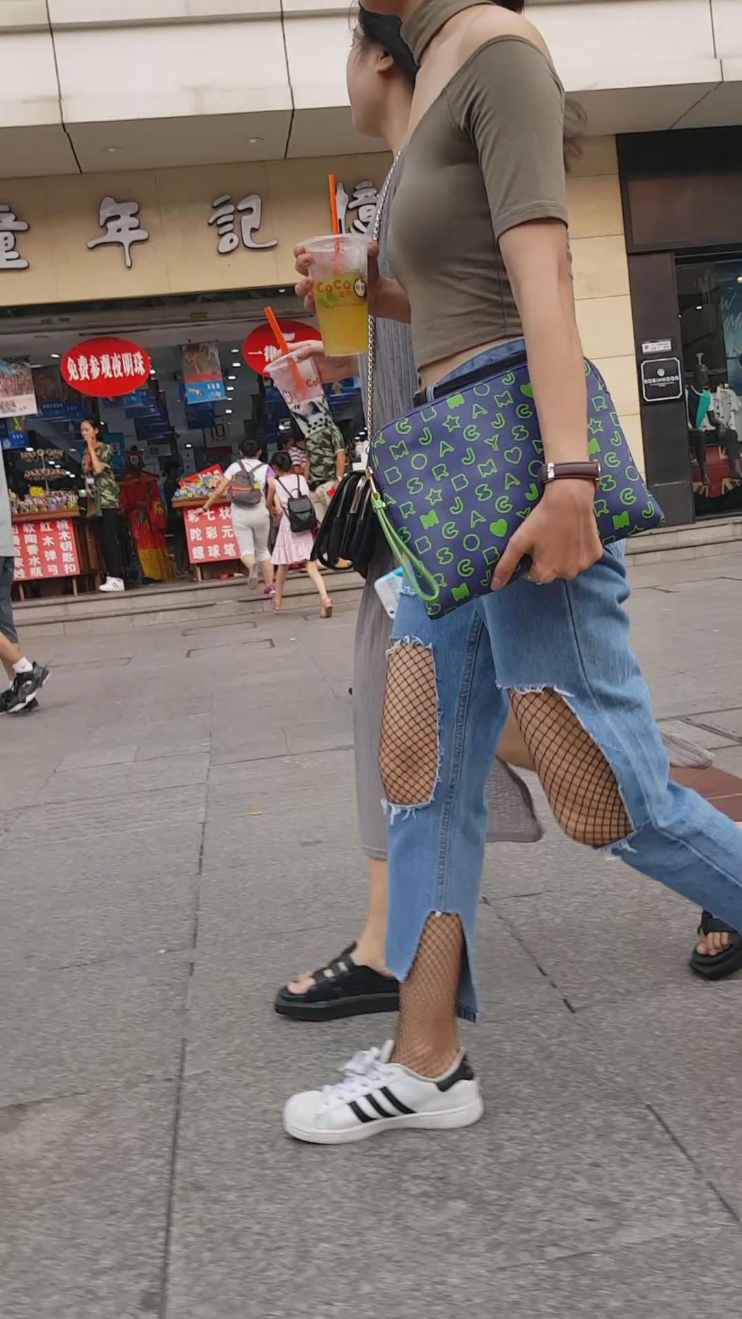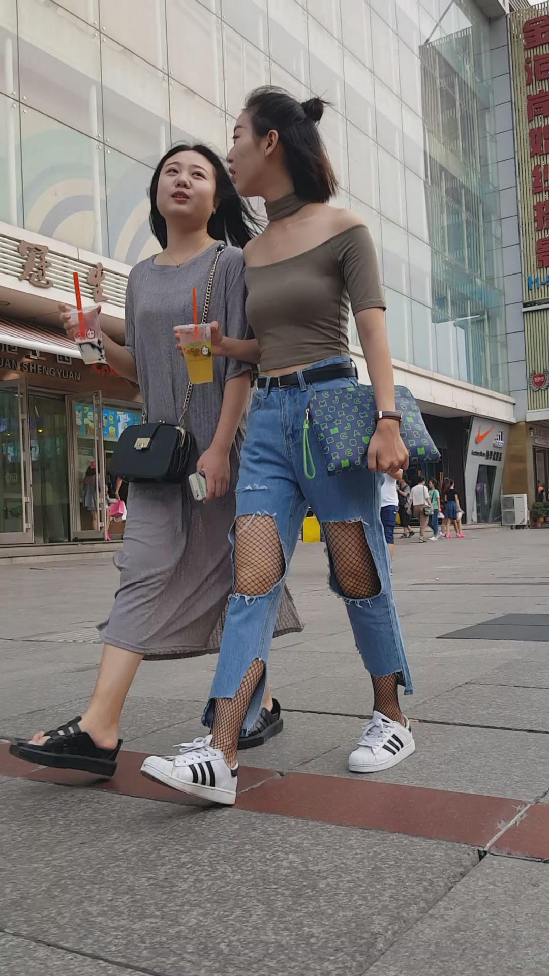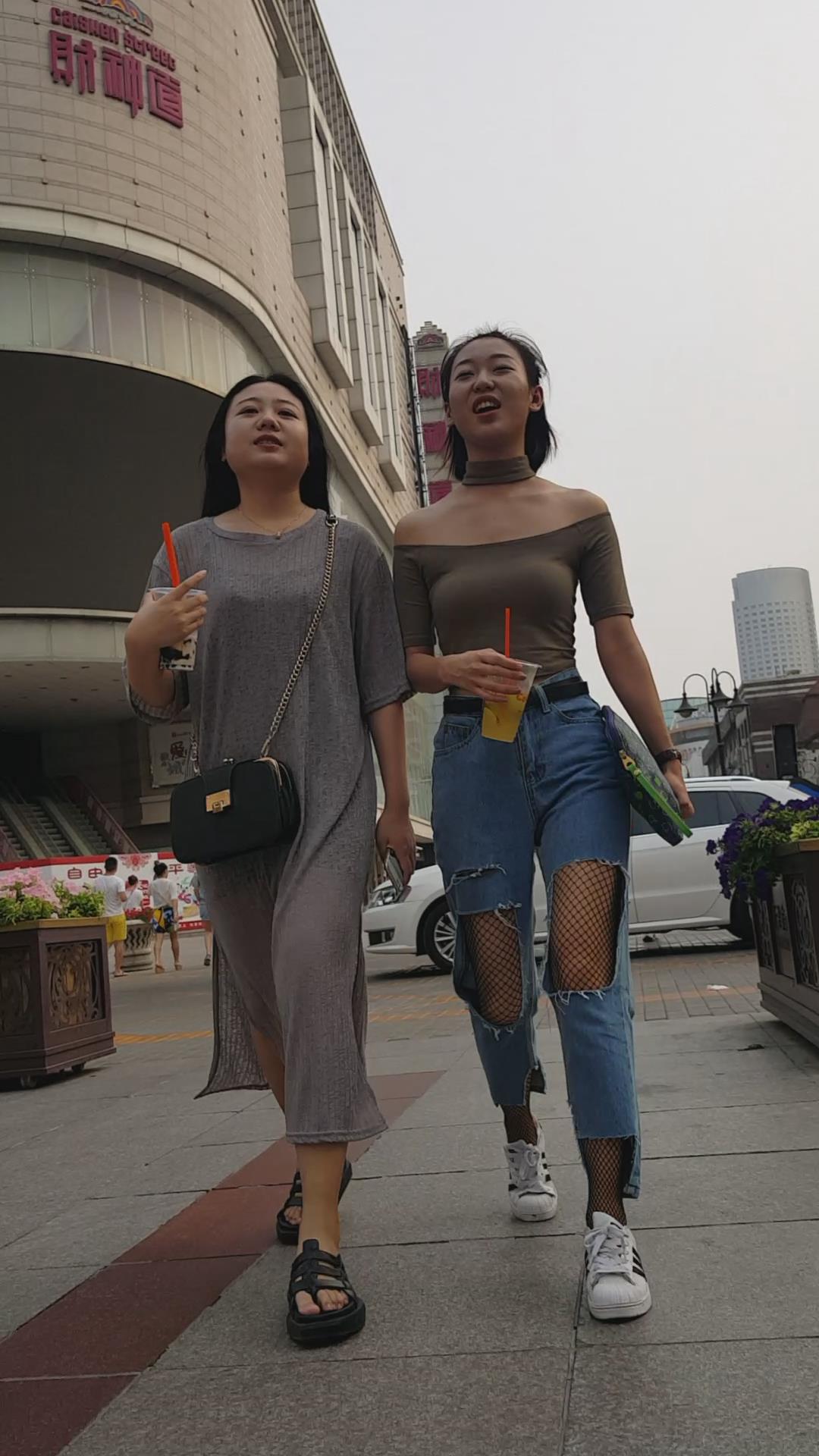街拍丰满甜美破洞牛仔裤两闺蜜。 编号6015