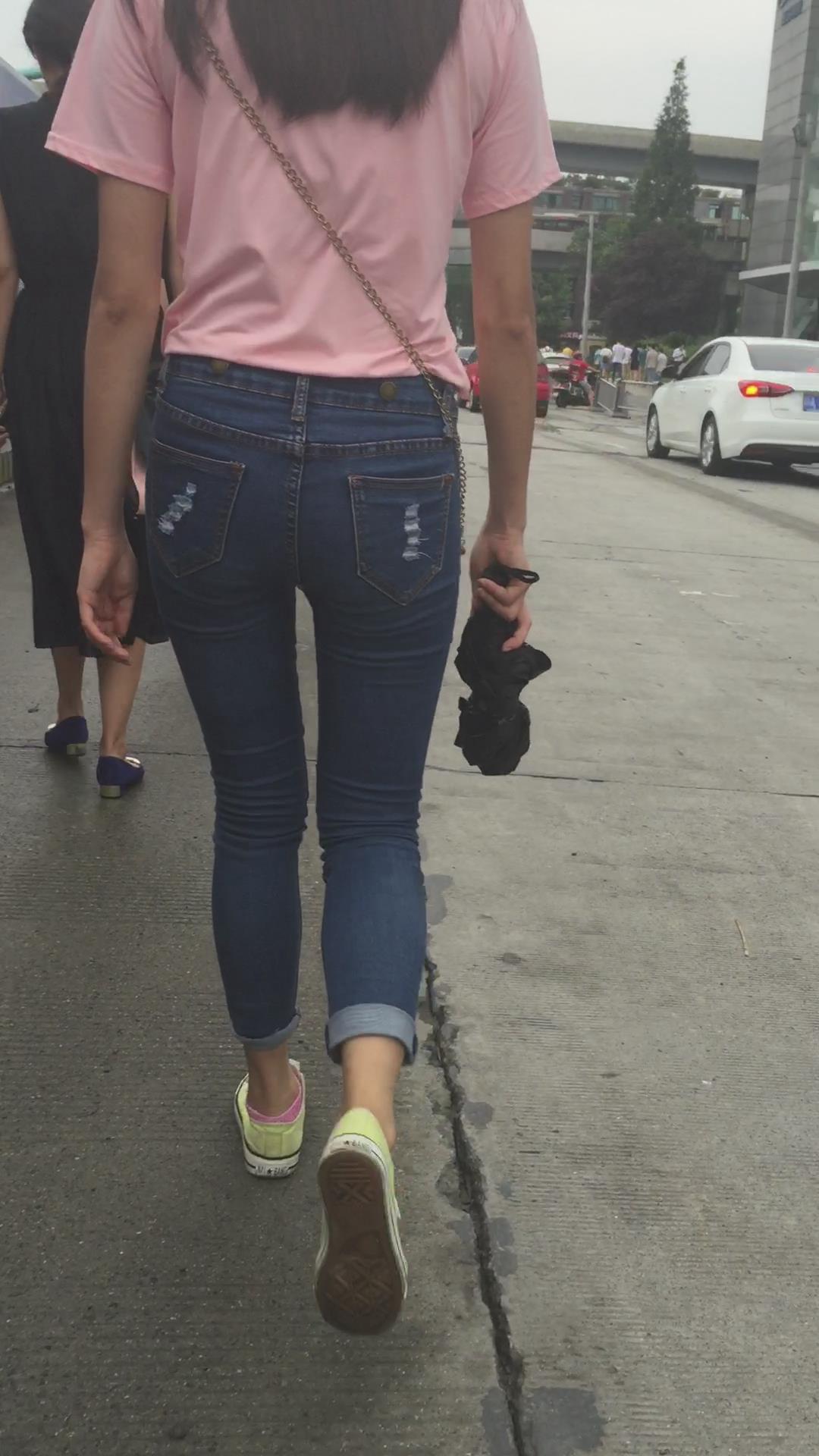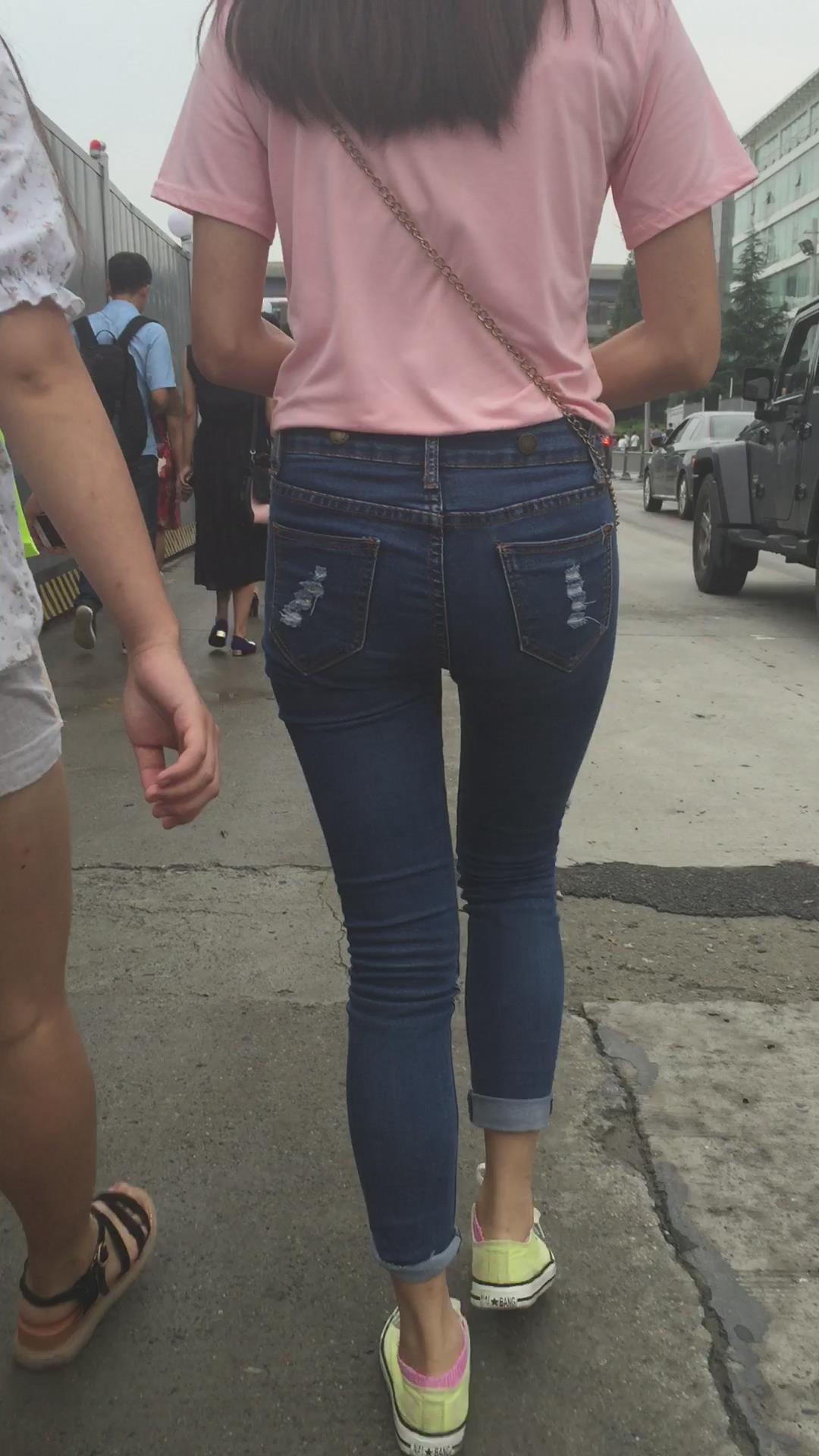 粉色T恤街拍紧身蓝色牛仔裤妹纸 编号6059