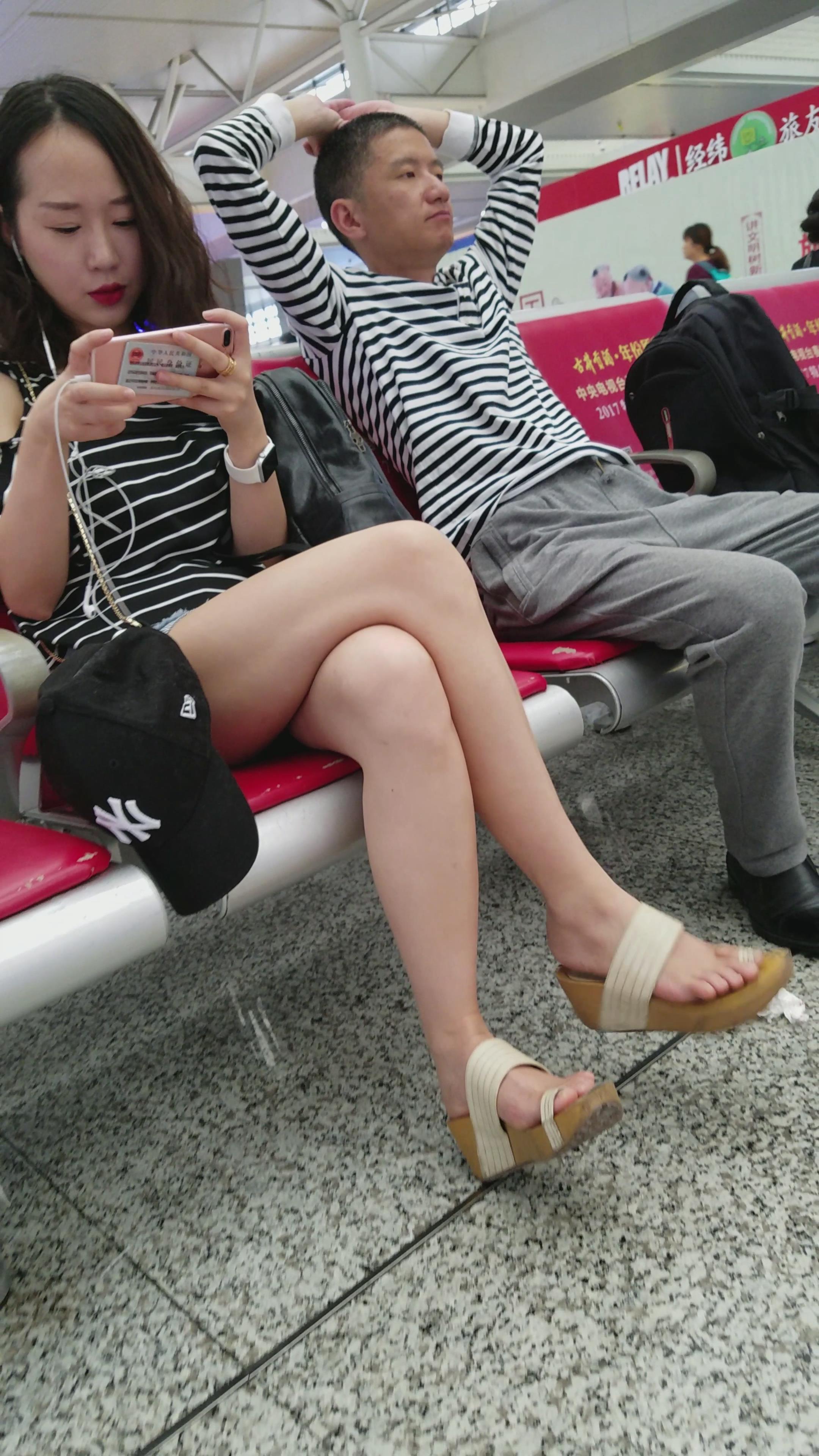 4K-低头玩手机的条纹衫牛仔超短裤街拍美腿姐姐 编号2772