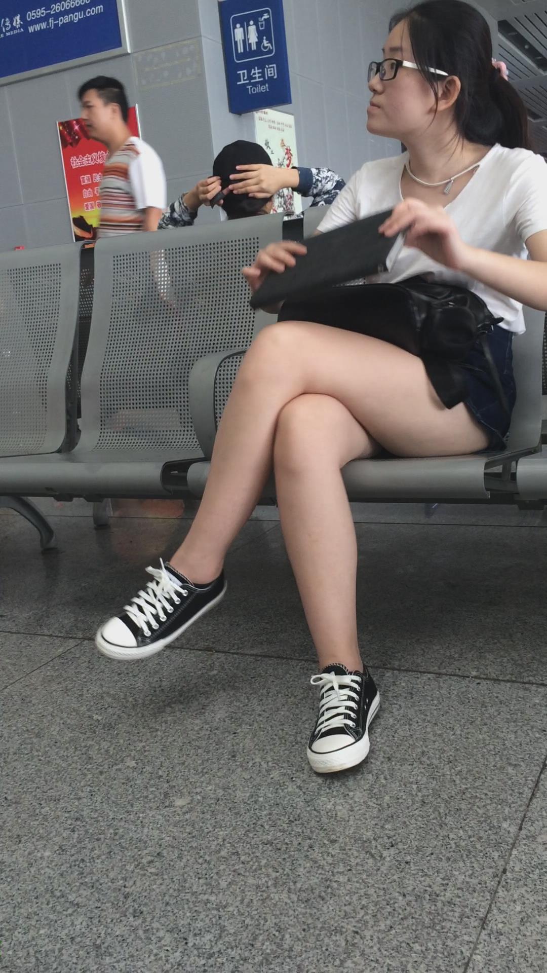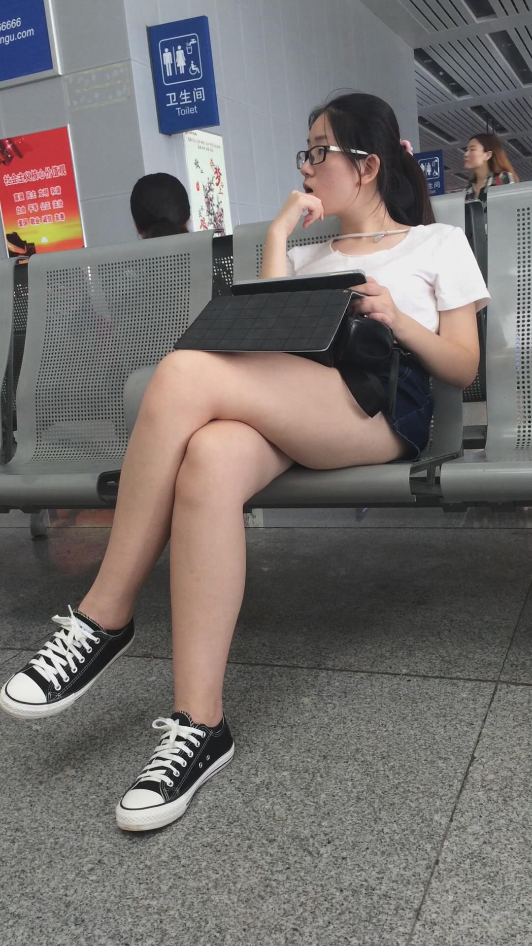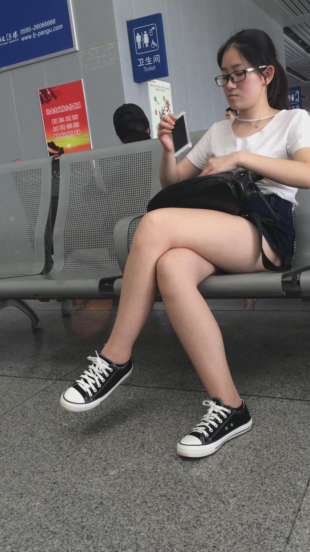 高铁候车室拍摄白腿帆布鞋眼镜妹 编号3009