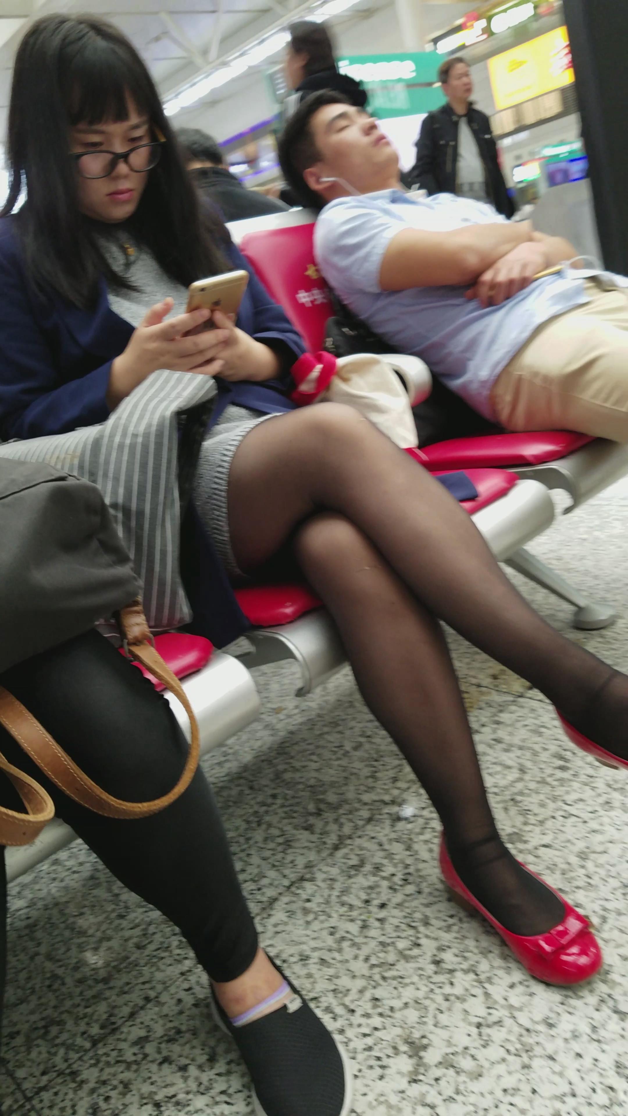 4k-高铁站候车室内的薄黑丝红色平底鞋眼镜妹 编号3029