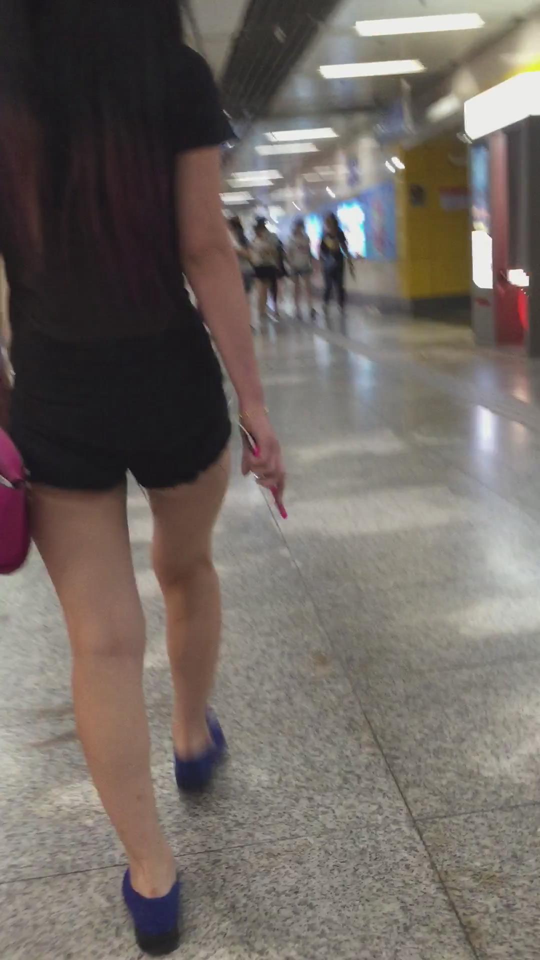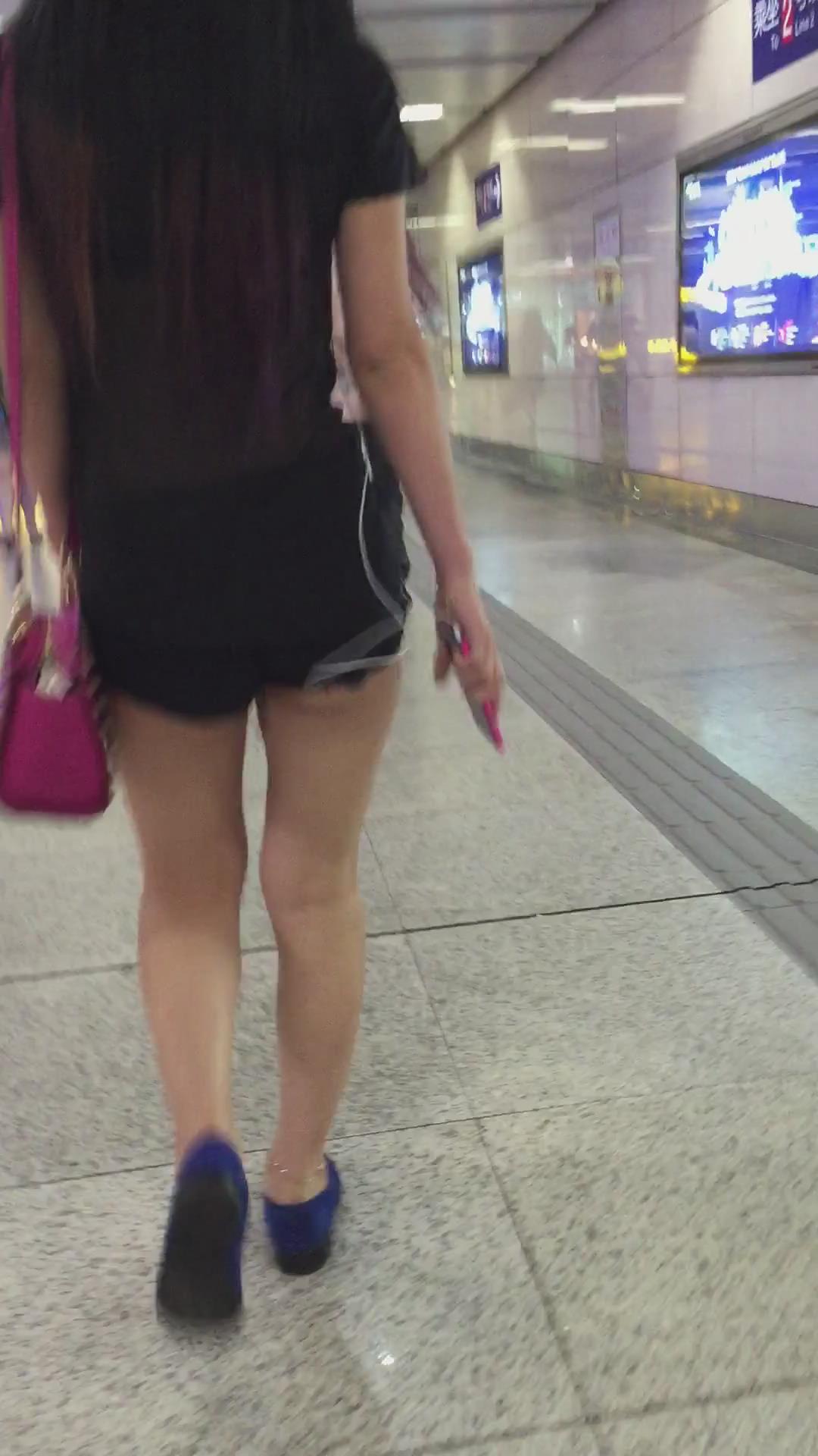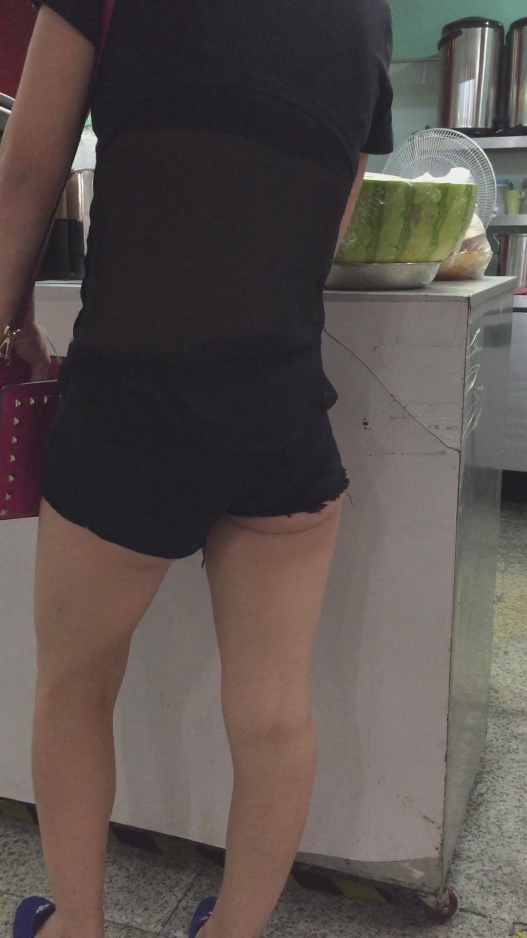 黑色超短热裤T恤衫露出屁股蛋蛋街拍美女 编号4108