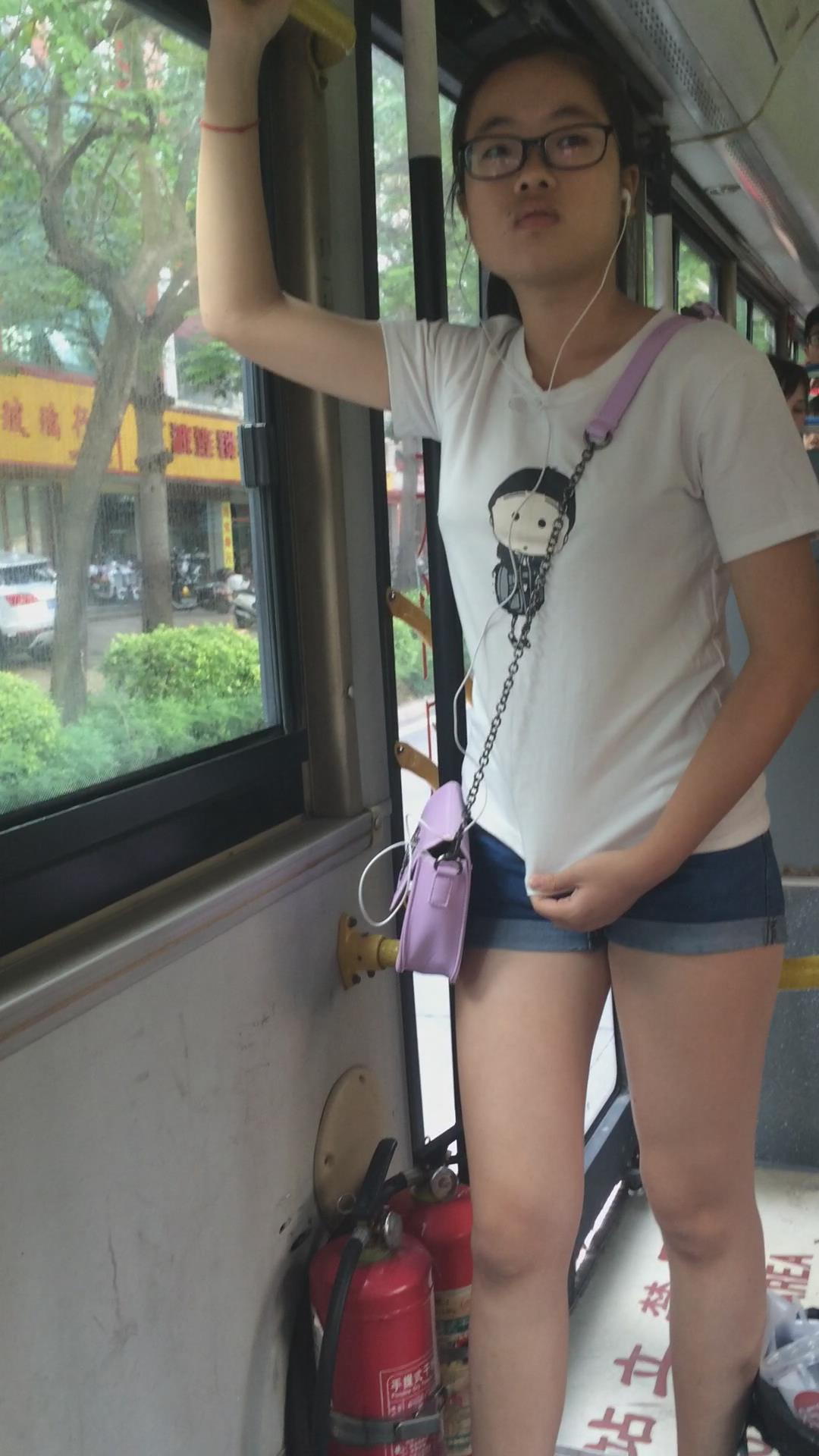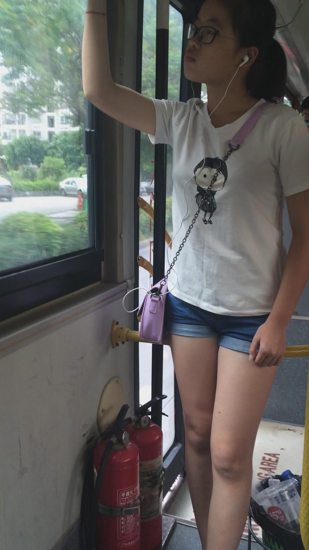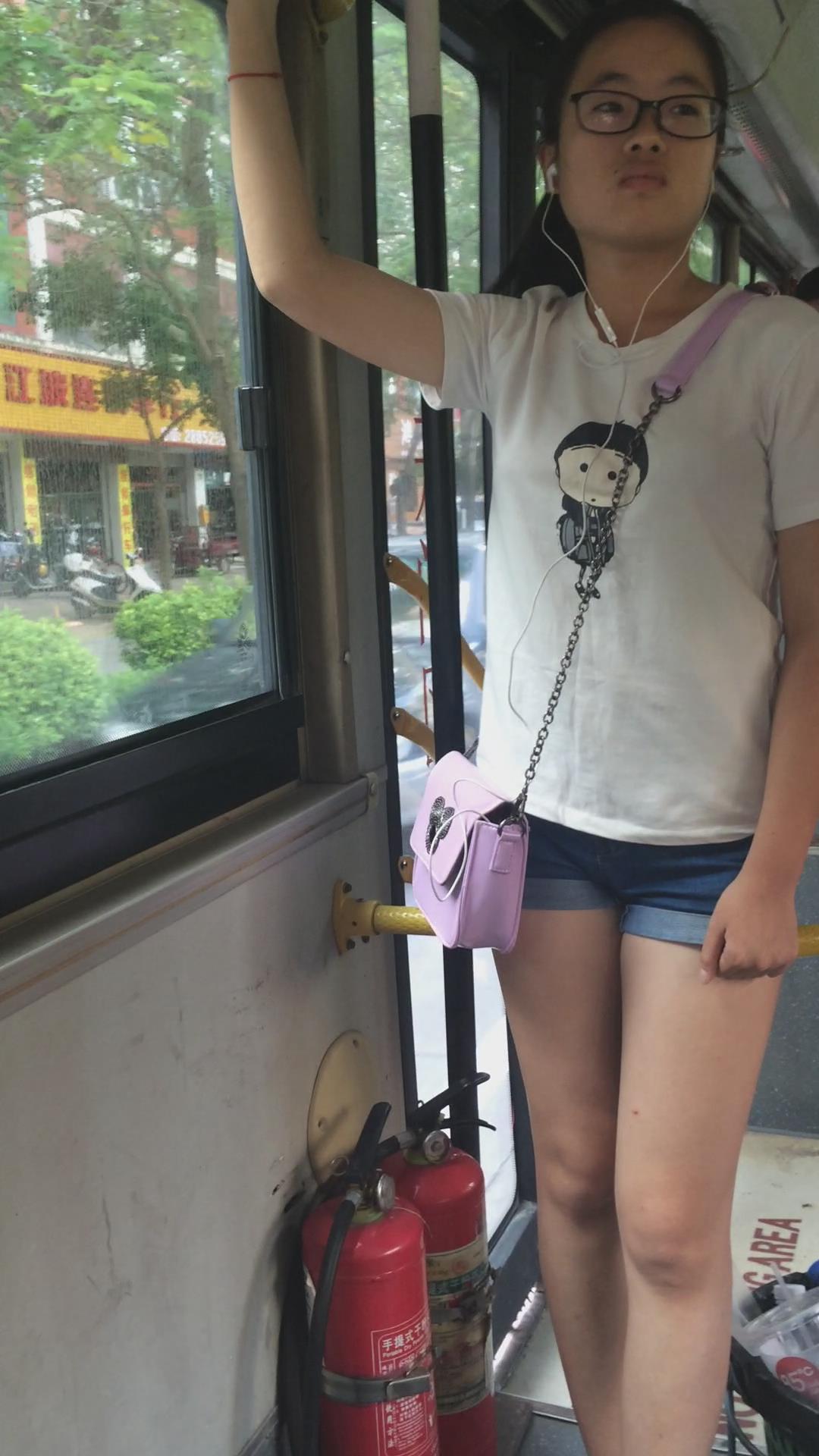 公交车上偶遇热裤学生妹,可惜颜值差了点 编号4445