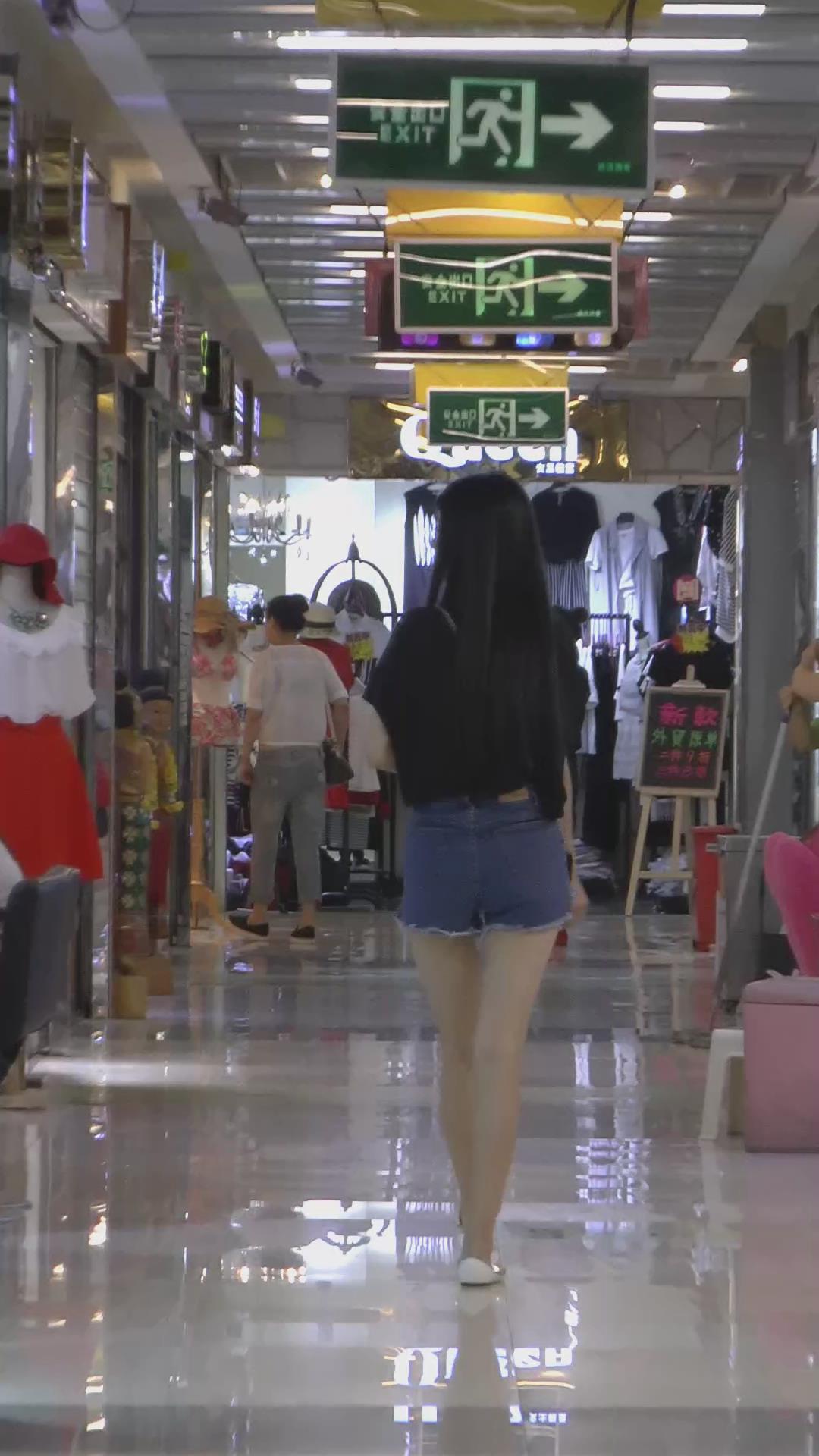 街拍牛仔热裤苗条长发美女服装店挑衣服 编号4459