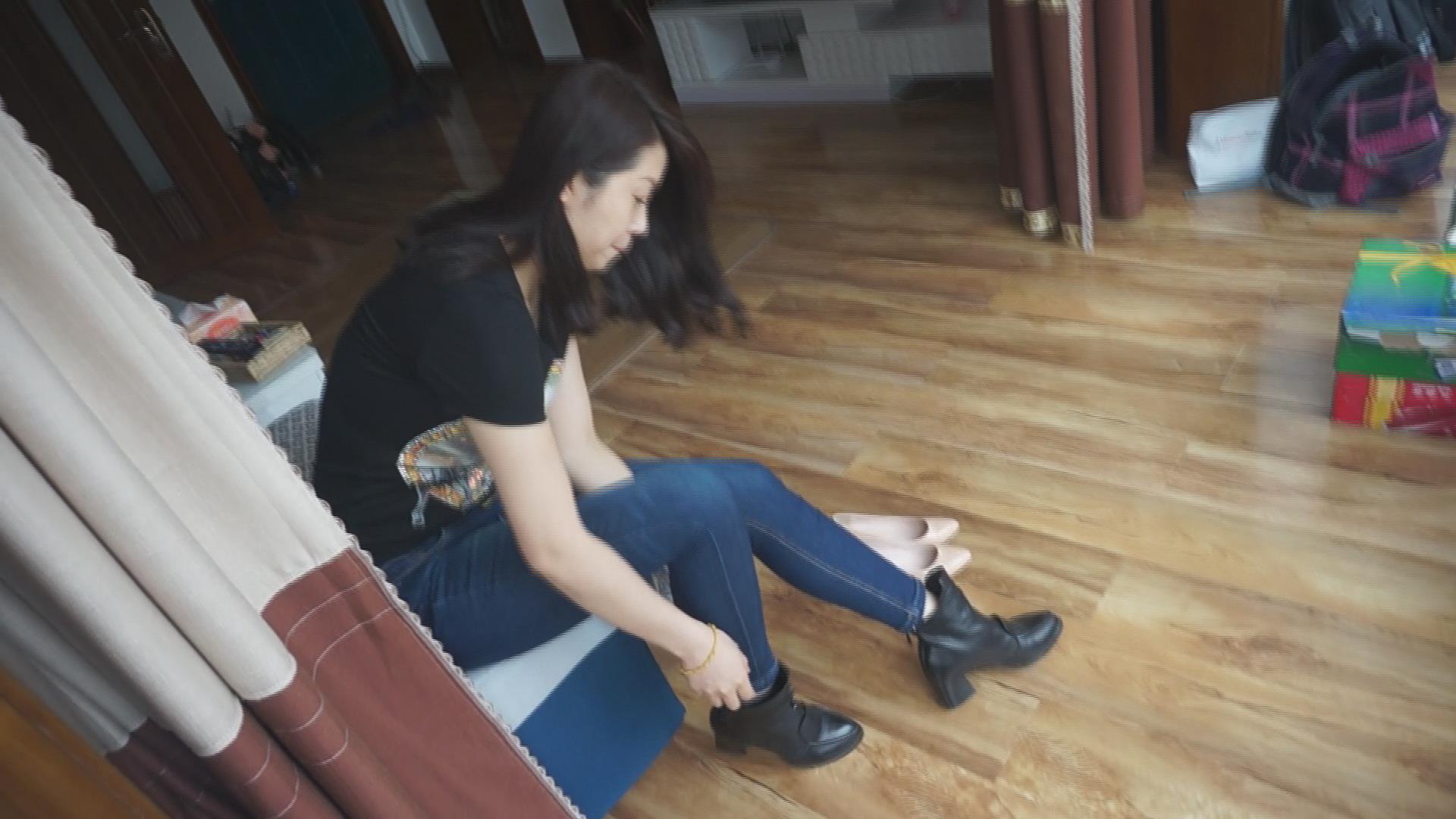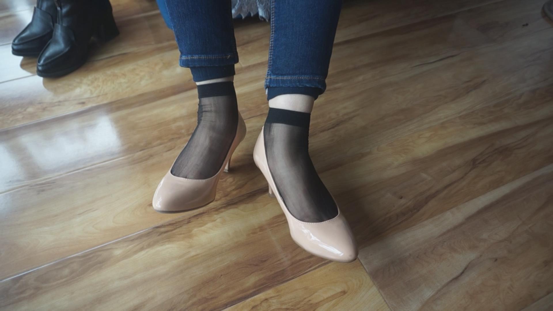 紧身蓝牛黑T恤米色高跟鞋丝袜美足姐姐 编号6437