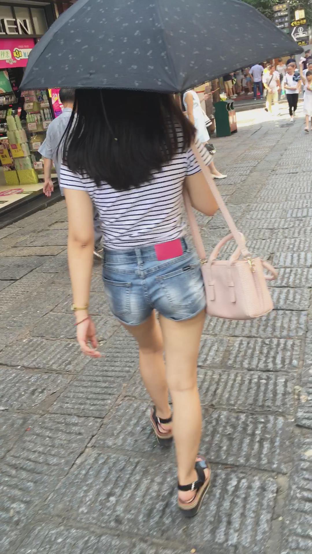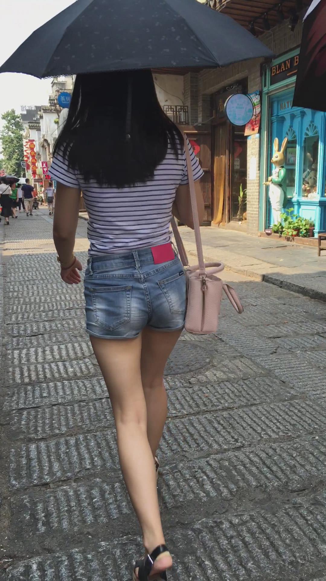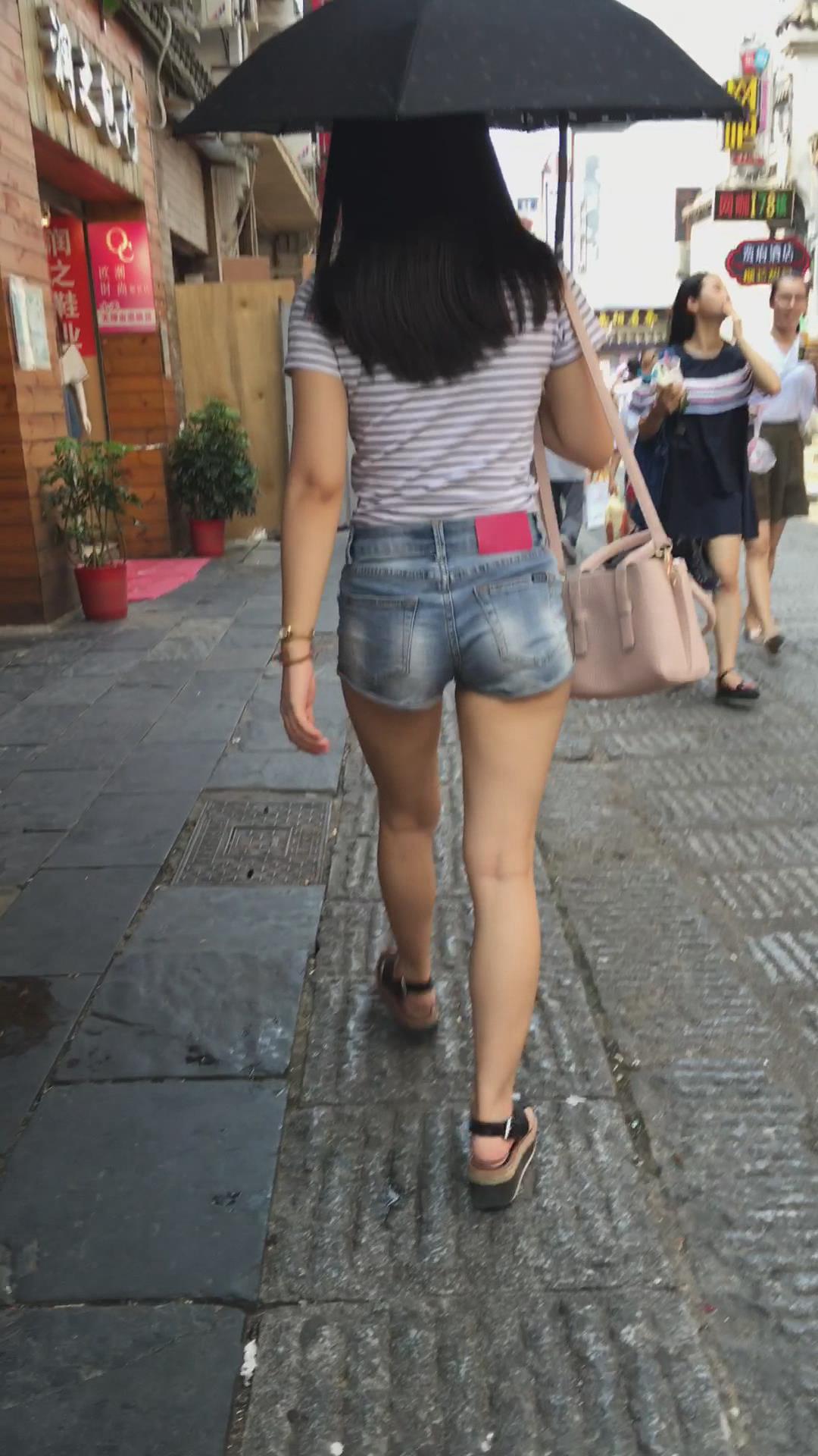 撑伞逛街的牛仔热裤美腿小清新美女。 编号4625