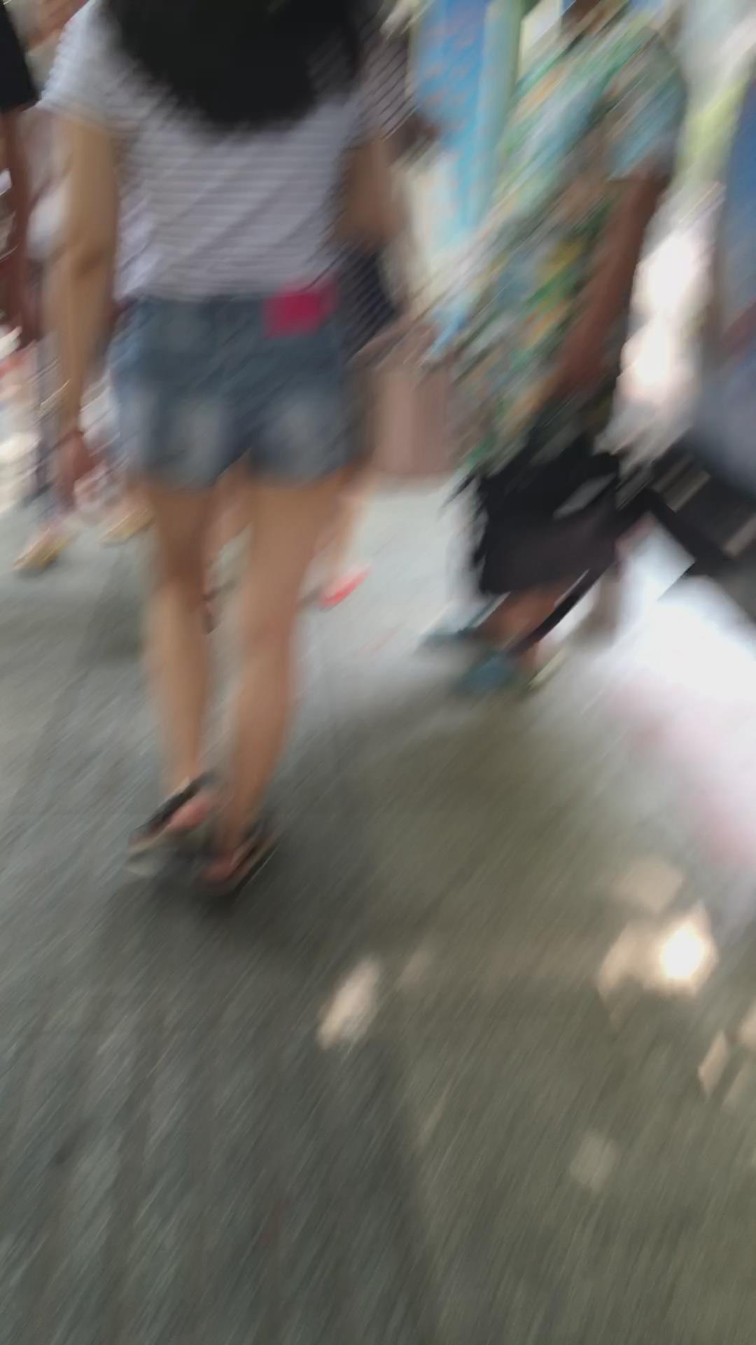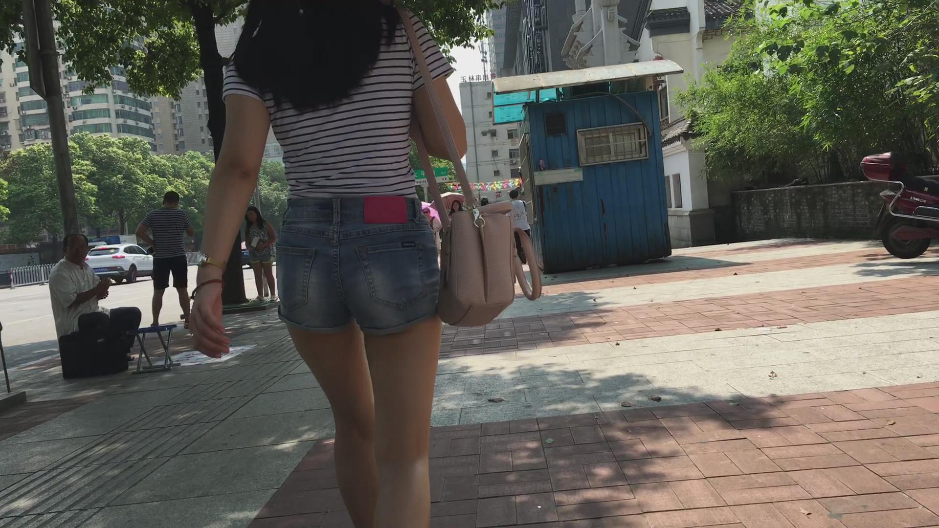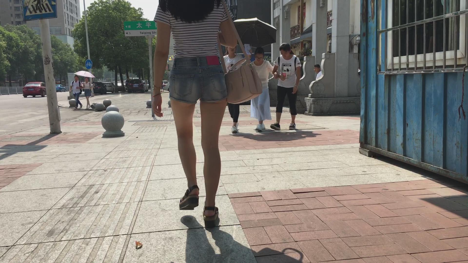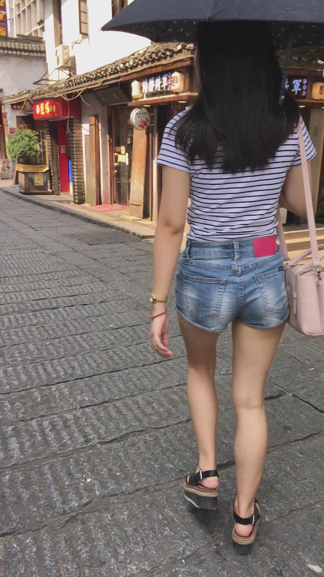 撑伞逛街的牛仔热裤美腿小清新美女。 编号4625