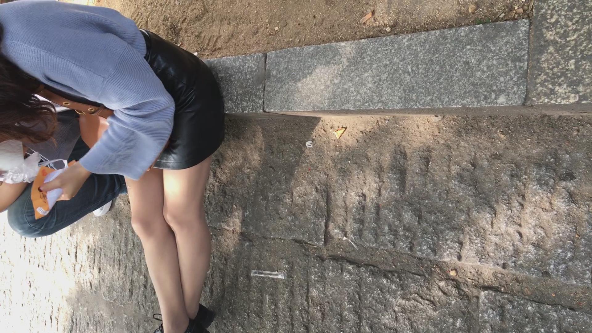 花坛边休息的皮裙街拍肉丝太阳帽美眉 编号2130